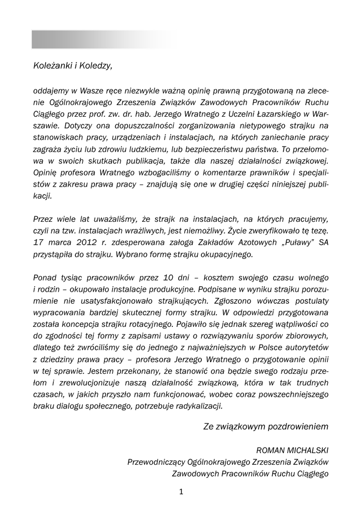 Koleżanki i Koledzy, oddajemy w Wasze ręce niezwykle ważną opinię prawną przygotowaną na zlecenie Ogólnokrajowego Zrzeszenia Związków Zawodowych Pracowników Ruchu Ciągłego przez prof. zw. dr. hab. Jerzego Wratnego z Uczelni Łazarskiego w Warszawie. Dotyczy ona dopuszczalności zorganizowania nietypowego strajku na stanowiskach pracy, urządzeniach i instalacjach, na których zaniechanie pracy zagraża życiu lub zdrowiu ludzkiemu, lub bezpieczeństwu państwa. To przełomowa w swoich skutkach publikacja, także dla naszej działalności związkowej. Opinię profesora Wratnego wzbogaciliśmy o komentarze prawników i specjalistów z zakresu prawa pracy – znajdują się one w drugiej części niniejszej publikacji. Przez wiele lat uważaliśmy, że strajk na instalacjach, na których pracujemy, czyli na tzw. instalacjach wrażliwych, jest niemożliwy. Życie zweryfikowało tę tezę. 17 marca 2012 r. zdesperowana załoga Zakładów Azotowych „Puławy” SA przystąpiła do strajku. Wybrano formę strajku okupacyjnego. Ponad tysiąc pracowników przez 10 dni – kosztem swojego czasu wolnego i rodzin – okupowało instalacje produkcyjne. Podpisane w wyniku strajku porozumienie nie usatysfakcjonowało strajkujących. Zgłoszono wówczas postulaty wypracowania bardziej skutecznej formy strajku. W odpowiedzi przygotowana została koncepcja strajku rotacyjnego. Pojawiło się jednak szereg wątpliwości co do zgodności tej formy z zapisami ustawy o rozwiązywaniu sporów zbiorowych, dlatego też zwróciliśmy się do jednego z najważniejszych w Polsce autorytetów z dziedziny prawa pracy – profesora Jerzego Wratnego o przygotowanie opinii w tej sprawie. Jestem przekonany, że stanowić ona będzie swego rodzaju przełom i zrewolucjonizuje naszą działalność związkową, która w tak trudnych czasach, w jakich przyszło nam funkcjonować, wobec coraz powszechniejszego braku dialogu społecznego, potrzebuje radykalizacji. Ze związkowym pozdrowieniem ROMAN MICHALSKI Przewodniczący Ogólnokrajowego Zrzeszenia Związków Zawodowych Pracowników Ruchu Ciągłego 1 prof. zw. dr hab. JERZY WRATNY Uczelnia Łazarskiego w Warszawie OPINIA PRAWNA dotycząca dopuszczalności zorganizowania nietypowego strajku na stanowiskach pracy, urządzeniach i instalacjach, na których zaniechanie pracy zagraża życiu lub zdrowiu ludzkiemu lub bezpieczeństwu państwa Ogólnokrajowe Zrzeszenie Związków Zawodowych Pracowników Ruchu Ciągłego zwróciło się z prośbą o opinię w następujących kwestiach: 1. Czy sytuacja, w której pracownik pracujący w ruchu ciągłym, po stawieniu się do pracy, nie przejmuje zmiany, w wyniku czego pracownik, który stawił się do pracy na wcześniejszą zmianę, pracuje dłużej, może być interpretowane jako „zaprzestanie pracy”, w rozumieniu art. 19 ust. 1 ustawy z dnia 23 maja 1991 r. o rozwiązywaniu sporów zbiorowych? oraz 2. Czy w powyższej sytuacji pracownicy pracujący w ruchu ciągłym, którzy przejmują zmianę dopiero po 4 godzinach od chwili stawienia się do zakładu pracy i do tego czasu przebywają na terenie zakładu pracy, powstrzymując się od jej wykonywania (art. 17 ust. 1 ww. ustawy), mogą dopuszczać się przestępstwa z art. 193 kodeksu karnego w warunkach, gdyby pracodawca nakazał tym pracownikom opuścić teren zakładu pracy? Ad. 1 Kwestia dotyczy dopuszczalności przeprowadzenia nietypowego strajku przez pracowników zatrudnionych w zakładzie, w którym praca świadczona jest w ruchu ciągłym i nie może być wstrzymana ze względów bezpieczeństwa. Zgodnie z ogólnymi zasadami w razie niepowodzenia rozwiązania sporu na drodze pokojowej i spełnieniu przewidzianych ustawą (tj. ustawą o rozwiązywaniu sporów zbiorowych – Dz.U. z 1991 r. Nr 55, poz. 236 z późn. zm. – cytowaną w tekście jako „ustawa”) warunków merytorycznych i proceduralnych zakładowa organizacja związkowa jest uprawniona do podjęcia akcji strajkowej (art. 15 ustawy). Według 2 art. 17 ust. 1 ustawy, strajk polega na zbiorowym powstrzymywaniu się pracowników od wykonywania pracy w celu rozwiązania sporu dotyczącego interesów pracowniczych. Normalnym następstwem powstrzymania się pracowników od pracy w następstwie akcji strajkowej jest unieruchomienie obsługiwanych przez nich stanowisk pracy. Unieruchomienie stanowisk pracy może jednak w sytuacjach wyjątkowych wiązać się z zagrożeniem wartości o podstawowym znaczeniu dla osób lub dobra publicznego, których cena przewyższa interes strajkujących pracowników. Kierując się tymi względami, ustawodawca ustanowił zakaz zaprzestania pracy w wyniku akcji strajkowych na stanowiskach pracy, urządzeniach i instalacjach, na których zaniechanie pracy zagraża życiu lub zdrowiu ludzkiemu lub bezpieczeństwu państwa – art. 19 ust. 1 ustawy (w dalszym ciągu będę się posługiwał skróconym określeniem „urządzenia” lub „wrażliwe urządzenia”). Praca, której zaprzestanie stwarzałoby zagrożenia wyspecyfikowane w art. 19 ust. 1 ustawy, z reguły jest świadczona nieprzerwanie, a więc odbywa się w ruchu ciągłym. Jest to zatem praca wielozmianowa. W takim przypadku strajk „klasyczny” polegający na powstrzymaniu się od pracy danej zmiany aktualnie obsługującej urządzenia, jest w świetle przywołanego przepisu niedopuszczalny. Mogłoby to bowiem spowodować aktualizację zagrożeń. Powstaje jednak pytanie, czy pracownikom zatrudnionym przy pracy w ruchu ciągłym, która nie może być wstrzymana, nie przysługuje w ogóle prawo do strajku? Ustosunkowując się do tego problemu, należy zauważyć, po pierwsze, że prawo do skutecznej obrony interesów na drodze wszczynania sporów zbiorowych, włączając w to prawo do strajku jako środka ostatecznego, stanowi regułę, co oznacza, że wszelkie od niej wyjątki powinny być interpretowane ścieśniająco. Po drugie, istotne jest, że przepis art. 19 ust. 1 ustawy wskazuje na wyjątki 