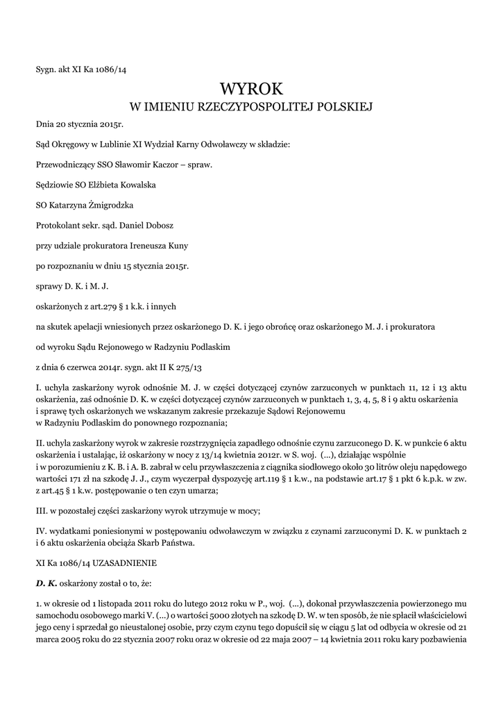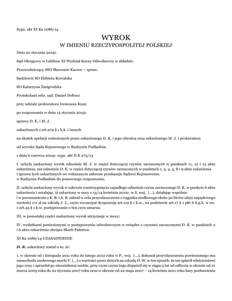 Sygn. akt XI Ka 1086/14 WYROK W IMIENIU RZECZYPOSPOLITEJ POLSKIEJ Dnia 20 stycznia 2015r. Sąd Okręgowy w Lublinie XI Wydział Karny Odwoławczy w składzie: Przewodniczący SSO Sławomir Kaczor – spraw. Sędziowie SO Elżbieta Kowalska SO Katarzyna Żmigrodzka Protokolant sekr. sąd. Daniel Dobosz przy udziale prokuratora Ireneusza Kuny po rozpoznaniu w dniu 15 stycznia 2015r. sprawy D. K. i M. J. oskarżonych z art.279 § 1 k.k. i innych na skutek apelacji wniesionych przez oskarżonego D. K. i jego obrońcę oraz oskarżonego M. J. i prokuratora od wyroku Sądu Rejonowego w Radzyniu Podlaskim z dnia 6 czerwca 2014r. sygn. akt II K 275/13 I. uchyla zaskarżony wyrok odnośnie M. J. w części dotyczącej czynów zarzuconych w punktach 11, 12 i 13 aktu oskarżenia, zaś odnośnie D. K. w części dotyczącej czynów zarzuconych w punktach 1, 3, 4, 5, 8 i 9 aktu oskarżenia i sprawę tych oskarżonych we wskazanym zakresie przekazuje Sądowi Rejonowemu w Radzyniu Podlaskim do ponownego rozpoznania; II. uchyla zaskarżony wyrok w zakresie rozstrzygnięcia zapadłego odnośnie czynu zarzuconego D. K. w punkcie 6 aktu oskarżenia i ustalając, iż oskarżony w nocy z 13/14 kwietnia 2012r. w S. woj. (...), działając wspólnie i w porozumieniu z K. B. i A. B. zabrał w celu przywłaszczenia z ciągnika siodłowego około 30 litrów oleju napędowego wartości 171 zł na szkodę J. J., czym wyczerpał dyspozycję art.119 § 1 k.w., na podstawie art.17 § 1 pkt 6 k.p.k. w zw. z art.45 § 1 k.w. postępowanie o ten czyn umarza; III. w pozostałej części zaskarżony wyrok utrzymuje w mocy; IV. wydatkami poniesionymi w postępowaniu odwoławczym w związku z czynami zarzuconymi D. K. w punktach 2 i 6 aktu oskarżenia obciąża Skarb Państwa. XI Ka 1086/14 UZASADNIENIE D. K. oskarżony został o to, że: 1. w okresie od 1 listopada 2011 roku do lutego 2012 roku w P., woj. (...), dokonał przywłaszczenia powierzonego mu samochodu osobowego marki V. (...) o wartości 5000 złotych na szkodę D. W. w ten sposób, że nie spłacił właścicielowi jego ceny i sprzedał go nieustalonej osobie, przy czym czynu tego dopuścił się w ciągu 5 lat od odbycia w okresie od 21 marca 2005 roku do 22 stycznia 2007 roku oraz w okresie od 22 maja 2007 – 14 kwietnia 2011 roku kary pozbawienia wolności za umyślne przestępstwo podobne, orzeczonej wyrokiem Sądu Okręgowego w Lublinie z dnia 4 lutego 2008 roku (sygn. akt IV K 386/06) tj. o czyn art. 284 § 2 k.k. w zw. z art. 64 § 1 k.k. 2. w nocy z 15/16 grudnia 2011 roku, w T., woj. (...), podczas wspólnego wyjazdu służbowego, zabrał w celu przywłaszczenia 370 franków szwajcarskich (równowartość 1363 złotych) na szkodę D. W., przy czym czynu tego dopuścił się w ciągu 5 lat po odbycia w okresie od 21 marca 2005 roku do 22 stycznia 2007 roku oraz w okresie od 22 maja 2007 roku do 14 kwietnia 2011 roku kary pozbawienia wolności za umyślne przestępstwa podobne, orzeczonej wyrokiem Sądu Okręgowego w Lublinie z dnia 4 lutego 2008 roku (sygn. akt IV K 386/06) tj. 278 § 1 k.k. w zw. z art. 64 § 1 k.k. 3. w dniu 29 grudnia 2011 roku w P., woj. (...), działając w celu osiągnięcia korzyści majątkowej, doprowadził firmę (...) S.A. do niekorzystnego rozporządzenia własnym mieniem w ten sposób, że zawarł z upoważnionym przedstawicielem tej firmy umowę pożyczki pieniężnej w kwocie 1000 złotych, wprowadzając w błąd co do własnych możliwości finansowych, posiadania stałego zatrudnienia i dochodów oraz zamiaru spłaty zaciągniętego zobowiązania, przy czym czynu tego dopuścił się w ciągu 5 lat po odbyciu w okresie od 21 marca 2005 roku do 22 stycznia 2007 roku oraz w okresie od 22 maja 2007 roku do 14 kwietnia 2011 roku kary pozbawienia wolności za umyślne przestępstwo podobne, orzeczonej wyrokiem Sądu Okręgowego w Lublinie z dnia 4 lutego 2008 roku (sygn. akt IV K 386/06) tj. o czyn z art. 286 § 1 k.k. w zw. z art. 64 § 1 k.k. 4. w dniu 31 grudnia 2011 roku w P., woj. (...), działając w celu osiągnięcia korzyści majątkowej, doprowadził firmę (...) Sp. z. o. o. do niekorzystnego rozporządzenia własnym mieniem w ten sposób, że zawarł z upoważnionym przedstawicielem tej firmy umowę pożyczki pieniężnej w kwocie 500 złotych, wprowadzając w błąd co do własnych możliwości finansowych, posiadania stałego zatrudnienia i dochodów oraz zamiaru spłaty zaciągniętego zobowiązania, przy czym czynu tego dopuścił się w ciągu 5 lat od odbycia w okresie od 21 marca 2005 roku do 22 stycznia 2007 roku oraz w okresie od 22 maja 2007 roku do 14 kwietnia 2011 roku kary pozbawienia wolności za umyślne przestępstwo podobne, orzeczonej wyrokiem Sądu Okręgowego w Lublinie z dnia 4 lutego 2008 roku (sygn. akt IV K 386/06), tj. o czyn z art. 286 § 1 k.k. w zw. z art. 64 § 1 k.k. 5. w okresie od 1 do 10 marca 2012 roku, daty dziennej nie ustalonej, w P., woj. (...), działając wspólnie i w porozumieniu z A. K. (1), dokonał kradzieży z włamaniem do niezamieszkałego budynku w ten sposób, że po wypchnięciu okna przy pomocy łomu, dostał się do wewnątrz, skąd zabrał w celu przywłaszczenia młot udarowy w skrzynce z narzędziami o wartości co najmniej 80 złotych, wkrętarkę akumulatorową z dwoma oryginalnymi akumulatorami w walizce o wartości co najmniej 50 złotych i podkaszarkę o wartości co najmniej 200 zł na szkodę G. F., przy czym czynu tego dopuścił się będąc uprzednio skazanym wyrokiem Sądu Okręgowego w Lublinie z dnia 4 lutego 2008 roku (sygn. akt IV K 386/06) za przestępstwo kradzieży z włamaniem oraz usiłowania kradzieży z włamaniem z zastosowaniem art.64 § 2 k.k. oraz w ciągu 5 lat po odbyciu w okresie od 21 marca 2005 roku do 22 stycznia 2007 roku oraz w okresie od 22 maja 2007 roku do 14 kwietnia 2011 roku kary pozbawienia wolności za wskazane przestępstwa, tj. o czyn z art. 279 § 1 k.k. w zw. z art. 64 § 2 k.k. 6. w nocy z 13/14 kwietnia 2012 r