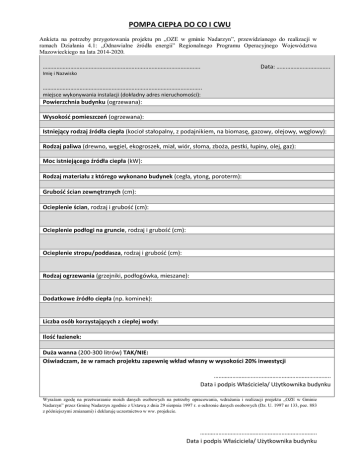 POMPA CIEPŁA DO CO I CWU Ankieta na potrzeby przygotowania projektu pn „OZE w gminie Nadarzyn”, przewidzianego do realizacji w ramach Działania 4.1: „Odnawialne źródła energii” Regionalnego Programu Operacyjnego Województwa Mazowieckiego na lata 2014-2020. …………………………………………………………………………………………. Data: …………………………….. Imię i Nazwisko ………………………………………………………………………………………….. miejsce wykonywania instalacji (dokładny adres nieruchomości): Powierzchnia budynku (ogrzewana): Wysokość pomieszczeń (ogrzewana): Istniejący rodzaj źródła ciepła (kocioł stałopalny, z podajnikiem, na biomasę, gazowy, olejowy, węglowy): Rodzaj paliwa (drewno, węgiel, ekogroszek, miał, wiór, słoma, zboża, pestki, łupiny, olej, gaz): Moc istniejącego źródła ciepła (kW): Rodzaj materiału z którego wykonano budynek (cegła, ytong, poroterm): Grubość ścian zewnętrznych (cm): Ocieplenie ścian, rodzaj i grubość (cm): Ocieplenie podłogi na gruncie, rodzaj i grubość (cm): Ocieplenie stropu/poddasza, rodzaj i grubość (cm): Rodzaj ogrzewania (grzejniki, podłogówka, mieszane): Dodatkowe źródło ciepła (np. kominek): Liczba osób korzystających z ciepłej wody: Ilość łazienek: Duża wanna (200-300 litrów) TAK/NIE: Oświadczam, że w ramach projektu zapewnię wkład własny w wysokości 20% inwestycji ………………………..……………………………………….. Data i podpis Właściciela/ Użytkownika budynku Wyrażam zgodę na przetwarzanie moich danych osobowych na potrzeby opracowania, wdrażania i realizacji projektu „OZE w Gminie Nadarzyn” przez Gminę Nadarzyn zgodnie z Ustawą z dnia 29 sierpnia 1997 r. o ochronie danych osobowych (Dz. U. 1997 nr 133, poz. 883 z późniejszymi zmianami) i deklaruję uczestnictwo w ww. projekcie. ………………………..……………………………………….. Data i podpis Właściciela/ Użytkownika budynku