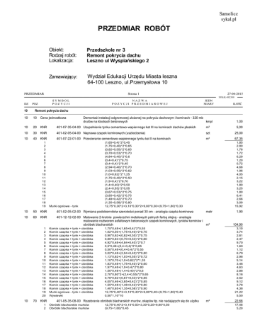 Samolicz sykal.pl PRZEDMIAR ROBÓT Obiekt: Rodzaj robót: Lokalizacja: Przedszkole nr 3 Remont pokrycia dachu Leszno ul Wyspiańskiego 2 Zamawiający: Wydział Edukacji Urzędu Miasta leszna 64-100 Leszno, ul.Przemysłowa 10 PRZEDMIAR Strona 1 27-04-2015 SYKAL-002308 DZ 10 SYMBOL POZYCJI POZ NAZWA POZYCJI PRZEDMIAROWEJ JEDN MIARY ILOŚĆ Remont pokrycia dachu 10 10 Cena jednostkowa 10 20 KNR 401-07-35-04-00 Uzupełnienie tynku cementowo-wapiennego kat III na kominach dachów płaskich m² 5,00 10 30 KNR 401-02-05-04-00 Naprawa czapek kominowych (uszkodzenia) szt 25,00 10 40 KNR 401-07-22-01-00 Przecieranie cementowo-wapiennego tynku kat II na kominach m² 67,35 1 2 3 4 5 6 7 8 9 10 11 12 13 14 15 16 17 18 19 DemontaŜ instalacji odgromowej ułoŜonej na pokryciu dachowym i kominach - 320 mb drutów na klockach betonowych kmpl Murki ogniowe - tynk (1,65+0,4)*2*0,45 (1,75+0,40)*2*0,65 (0,82+0,55)*2*0,65 (0,70+0,53)*2*0,70 (4,84+0,40)*2*0,6 (0,4+0,4)*2*0,75 (0,4+0,4)*2*0,45 (2,94+0,40)*2*0,70 (1,03+0,55)*2*0,62 (1,0+0,62)*2*1,25 (1,75+0,40)*2*0,50 (1,9+0,4)*2*0,70 (1,4+0,40)*2*0,50 (2,4+0,55)*2*0,55 (0,67+0,53)*2*0,75 (3,85+0,42)*2*0,75 (1,48+0,42)*2*0,70 (1,35+0,58)*2*0,80 12,75*0,30*2+3,10*0,30*2+9,80*0,30+(9,75+1,80)*0,30 1,85 2,80 1,78 1,72 6,29 1,20 0,72 4,68 1,96 4,05 2,15 3,22 1,80 3,25 1,80 6,41 2,66 3,09 15,92 10 50 KNR 401-02-05-02-00 Wymiana podokienników szerokości ponad 30 cm - analogia czapka kominowa 10 60 KNR 401-12-12-02-00 Malowanie 2-krotnie powierzchni metalowych pełnych farbą olejną - analogia malowanie roztworem asfaltowym betonowych czapek kominowych, tynków kominów i obróbek blacharskich m² 1 2 3 4 5 6 7 8 9 10 11 12 13 14 15 16 17 18 19 20 10 70 KNR 1 2 Komin czapka + tynk + obróbka Komin czapka + tynk + obróbka Komin czapka + tynk + obróbka Komin czapka + tynk + obróbka Komin czapka + tynk + obróbka Komin czapka + tynk + obróbka Komin czapka + tynk + obróbka Komin czapka + tynk + obróbka Komin czapka + tynk + obróbka Komin czapka + tynk + obróbka Komin czapka + tynk + obróbka Komin czapka + tynk + obróbka Komin czapka + tynk + obróbka Komin czapka + tynk + obróbka Komin czapka + tynk + obróbka Komin czapka + tynk + obróbka Komin czapka + tynk + obróbka Komin czapka + tynk + obróbka Murki ogniowe - tynk + obróbka Wywiewki metr 1,75*0,48+(1,65+0,4)*2*0,55 1,02*0,50+(1,75+0,40)*2*0,75 0,90*0,62+(0,82+0,55)*2*0,75 0,80*0,63+(0,70+0,53)*2*0,80 4,92*0,48+(4,84+0,40)*2*0,7 0,5*0,48+(0,4+0,4)*2*0,85 0,50*0,48+(0,4+0,4)*2*0,55 3,02*0,48+(2,94+0,40)*2*0,80 1,13*0,62+(1,03+0,55)*2*0,72 1,10*0,70+(1,0+0,62)*2*1,35 1,83*0,48+(1,75+0,40)*2*0,60 1,97*0,48+(1,9+0,4)*2*0,80 1,50*0,48+(1,4+0,40)*2*0,6 2,70*0,80*2+(2,4+0,55)*2*0,65 0,78*0,62+(0,67+0,53)*2*0,85 4,05*0,46+(3,85+0,42)*2*0,85 1,55*0,48+(1,48+0,42)*2*0,80 1,40*0,65+(1,35+0,58)*2*0,90 12,75*0,40*2+3,10*0,40*2+9,80*0,40+(9,75+1,80)*0,40 0,50*1,10*10 401-05-35-08-00 Rozebranie obróbek blacharskich murów, okapów itp. nie nadających się do uŜytku Obróbki blacharskie murków Obróbki blacharskie murków 12,75*0,40*2+3,10*0,50+3,30*0,25+9,80*0,50 (9,75+1,80)*0,45 1,00 1,90 104,90 3,10 3,74 2,61 2,47 9,70 1,60 1,12 6,79 2,98 5,14 3,46 4,63 2,88 8,16 2,52 9,12 3,78 4,38 21,22 5,50 m² 22,68 17,48 5,20 PRZEDMIAR Strona 2 27-04-2015 SYKAL-002308 SYMBOL POZYCJI DZ POZ 10 80 KNR 10 90 Cena jednostkowa NAZWA POZYCJI PRZEDMIAROWEJ 202-05-06-02-01 RóŜne obróbki z blachy ocynkowanej 0,55 mm szer ponad 25 cm wsp: R = 0,955 Oczyszczenie i regulacja spadków rynien dachowych fi 150 1 2 100 KNR 10 110 Cena jednostkowa 10 120 KNR 10 130 KNNR 1 2 3 10 140 KNNR 1 10 150 KNR 1 m² metr (9,70+9,80+21,20)*2 8,35+4,0+16,50+8,10 10 1 JEDN MIARY 401-12-12-25-00 Malowanie 2-krotnie farbą olejną rynien Impregnacja 2-krotnie środkiem impregnującym drewnianej łaty 4/6 cm ekranu 401-12-12-08-00 Malowanie 2-krotnie farbą olejną krat i balustrad ozdobnych Drabiny Część wyzsza Część nizsza Minus kominy ponad 1,0 m2 118,35 metr 118,35 m² Listwa mocujaca 6,00 6,00 m² 494,11 370,26 129,90 -6,05 m² (3,60+6,15+2,95+0,45)*0,50*2 202-05-06-01-01 RóŜne obróbki z blachy ocynkowanej 0,55 mm szer do 25 cm 118,35 metr 9,80*4,45+12,75*21,20+9,80*5,75 3,20*3,10+9,75*7,90+6,10*6,15+3,20*1,70 -(4,84*0,40+2,94*0,40+2,4*0,55+3,85*0,42) N003-05-03-04-00 Obróbki z papy nawierzchniej zgrzewalnej na przygotowanym podłoŜu betonowym Częśc niższa - ściana części wyższej 22,68 81,40 36,95 5,0*0,60*2 N003-05-03-03-00 Pokrycie dachu 1 x papą zgrzewalną + papa perforowana na istniejącym pokryciu z papy astaltowej - papa zgrzewalna wierzchniego krycia modyfikowana SBS na osnowie z włókniny poliestrowej, grub min 5,20 mm ILOŚĆ 13,15 13,15 m² (3,60+6,15+2,95+0,45)*0,10*2 2,63 2,63 wsp: R = 0,955 10 160 Cena jednostkowa 1 10 170 Cena jednostkowa 10 180 KNR 10 190 Cena jednostkowa 1 1 1 10 10 200 210 Uzupełnienie 1 haka rury spustowej fi 100 i regulacja zbiornika Przy głownych schodach Wymiana uszkodzonej rury spustowej Ŝeliwnej fi 160 z rewizją na rurę z PCV Przy tarasie Przy tarasie szt 1,00 metr 2,00 1,00 1,00 2 Daszek nad schodami o rozpiętości 2,0 m - konstrukcja stalowa z kształtowników zamknietych z pokryciem blachą fałdową i obróbką blacharską na ścianie Nad schodami do archiwum Cena jednostkowa 1,00 1 401-05-27-06-00 Uzupełnienie rur spustowych okrągłych ø 12 cm z blachy ocynkowanej Cena jednostkowa kmpl 1 2,00 m² 2,10*2,85 5,99 5,99 Wymiana spróchniałej łaty do mocowania ekranu z blachy - odkęcenie blachy ekranu mocowanej na 2-ch łatach, wymiana górnej łaty, ponowne przykęcenie blachy do łat, rusztowanie do wys. 5,0 m metr 16,50 Instalacja odgromowa - 280 mb przewodu z pomiarami kmpl 1,00 Uwaga: ceny jednostkowe wg własnych kalkulacji