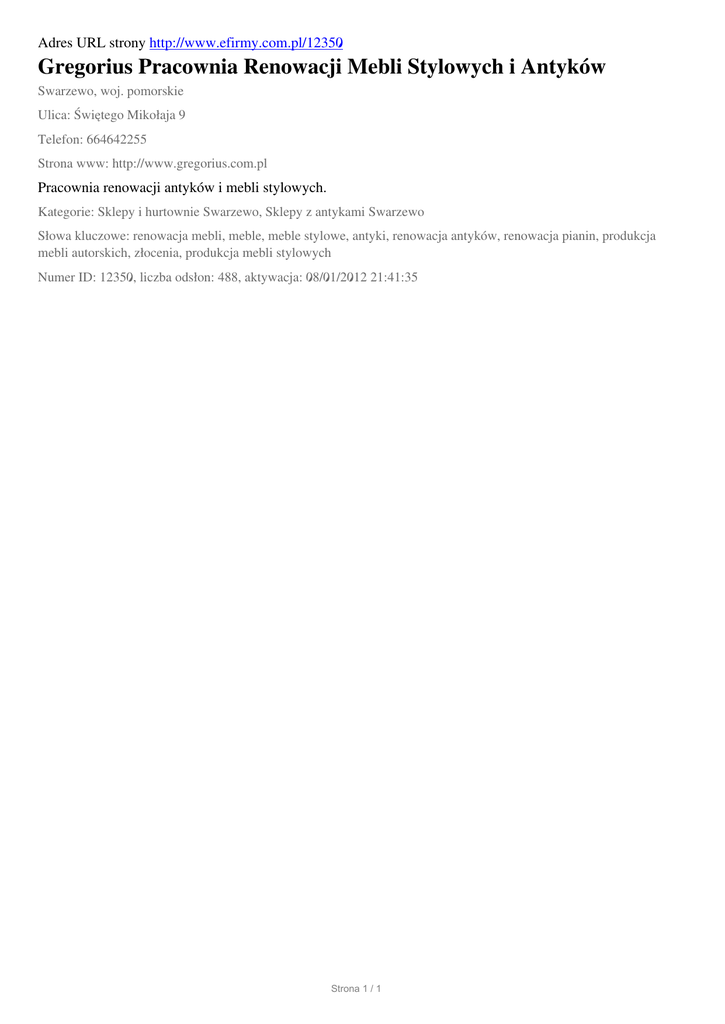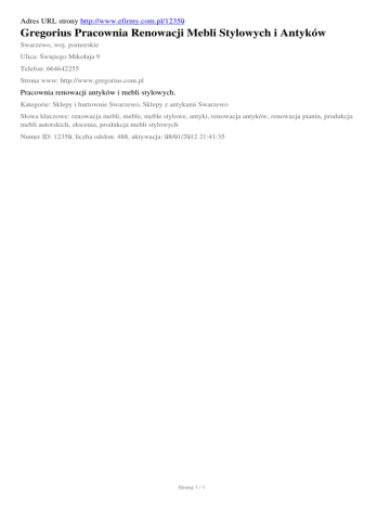 Adres URL strony http://www.efirmy.com.pl/12350 Gregorius Pracownia Renowacji Mebli Stylowych i Antyków Swarzewo, woj. pomorskie Ulica: Świętego Mikołaja 9 Telefon: 664642255 Strona www: http://www.gregorius.com.pl Pracownia renowacji antyków i mebli stylowych. Kategorie: Sklepy i hurtownie Swarzewo, Sklepy z antykami Swarzewo Słowa kluczowe: renowacja mebli, meble, meble stylowe, antyki, renowacja antyków, renowacja pianin, produkcja mebli autorskich, złocenia, produkcja mebli stylowych Numer ID: 12350, liczba odsłon: 488, aktywacja: 08/01/2012 21:41:35 Strona 1 / 1