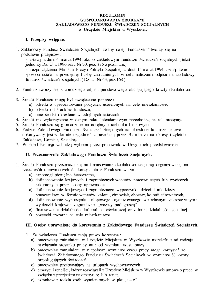 REGULAMIN GOSPODAROWANIA ŚRODKAMI ZAKŁADOWEGO FUNDUSZU ŚWIADCZEŃ SOCJALNYCH w Urzędzie Miejskim w Wyszkowie I. Przepisy wstępne. 1. Zakładowy Fundusz Świadczeń Socjalnych zwany dalej „Funduszem” tworzy się na podstawie przepisów : - ustawy z dnia 4 marca 1994 roku o zakładowym funduszu świadczeń socjalnych ( tekst jednolity Dz. U. z 1996 roku Nr 70, poz. 335 z późn. zm.) - rozporządzenia Ministra Pracy i Polityki Socjalnej z dnia 14 marca 1994 r. w sprawie sposobu ustalania przeciętnej liczby zatrudnionych w celu naliczania odpisu na zakładowy fundusz świadczeń socjalnych ( Dz. U. Nr 43, poz.168 ). 2. Fundusz tworzy się z corocznego odpisu podstawowego obciąŜającego koszty działalności. 3. Środki Funduszu mogą być zwiększone poprzez : a) odsetki z oprocentowania poŜyczek udzielonych na cele mieszkaniowe, b) odsetki od środków funduszu, c) inne środki określone w odrębnych ustawach. 4. Środki nie wykorzystane w danym roku kalendarzowym przechodzą na rok następny. 5. Środki Funduszu są gromadzone na odrębnym rachunku bankowym. 6. Podział Zakładowego Funduszu Świadczeń Socjalnych na określone fundusze celowe dokonywany jest w formie uzgodnień z powołaną przez Burmistrza na okresy trzyletnie Zakładową Komisją Socjalną. 7. W skład Komisji wchodzą wybrani przez pracowników Urzędu ich przedstawiciele. II. Przeznaczenie Zakładowego Funduszu Świadczeń Socjalnych. 1. Środki Funduszu przeznacza się na finansowanie działalności socjalnej organizowanej na rzecz osób uprawnionych do korzystania z Funduszu w tym : a) zapomogi pienięŜne bezzwrotne, b) dofinansowanie krajowych i zagranicznych wczasów pracowniczych lub wycieczek zakupionych przez osoby uprawnione, c) dofinansowanie krajowego i zagranicznego wypoczynku dzieci i młodzieŜy pracowników w formie wczasów, kolonii, zimowisk, obozów, kolonii zdrowotnych, d) dofinansowanie wypoczynku urlopowego organizowanego we własnym zakresie w tym : wycieczki krajowe i zagraniczne, „wczasy pod gruszą” e) finansowanie działalności kulturalno – oświatowej oraz innej działalności socjalnej, f) poŜyczki zwrotne na cele mieszkaniowe. III. Osoby uprawnione do korzystania z Zakładowego Funduszu Świadczeń Socjalnych. 1. Ze świadczeń Funduszu mają prawo korzystać : a) pracownicy zatrudnieni w Urzędzie Miejskim w Wyszkowie niezaleŜnie od rodzaju nawiązania stosunku pracy oraz od wymiaru czasu pracy, b) pracownicy zatrudnieni w niepełnym wymiarze czasu pracy mogą korzystać ze świadczeń Załadowanego Funduszu Świadczeń Socjalnych w wymiarze ½ kwoty przysługujących świadczeń, c) pracownicy przebywający na urlopach wychowawczych, d) emeryci i renciści, którzy rozwiązali z Urzędem Miejskim w Wyszkowie umowę o pracę w związku z przejściem na emeryturę lub rentę, e) członkowie rodzin osób wymienionych w pkt. „a – c”. 2. Członkami rodzin, o których mowa w pkt 1 lit. „e”) są : a) współmałŜonkowie, b) dzieci własne, dzieci przysposobione oraz przyjęte na wychowanie w ramach rodziny zastępczej, dzieci współmałŜonka i rodzeństwo pozostające na utrzymaniu osoby uprawnionej do 18 lat, c) członkowie rodzin po zmarłych pracownikach – jeŜeli byli na ich utrzymaniu. 3. Do pomocy ze środków Funduszu przeznaczonej na cele mieszkaniowe uprawnieni są wszyscy pracownicy posiadający staŜ pracy w Urzędzie Miejskim w Wyszkowie wynoszący co najmniej 2 lata zatrudnienia i zatrudnienie na czas nieokreślony. IV. Zasady i warunki przyznawania świadczeń socjalnych. 1. W danym roku funkcjonują wyłącznie fundusze celowe, na które zostały uzgodnione i wydzielone środku. 2. Przyznanie i wysokość pomocy ( dofinansowania ) ze środków Funduszu uzaleŜniona jest od sytuacji Ŝyciowej, rodzinnej i materialnej, a w przypadku pomocy mieszkaniowej równieŜ od sytuacji mieszkaniowej. 3. Świadczenia udzielane są na wniosek osób uprawnionych i mają charakter fakultatywny. 4. Pomoc z Funduszu przyznawana będzie do wysokości posiadanych środków według następujących kryteriów: a) dopłata do wypoczynku określonego w części II. pkt. 1. lit. „b” - „d” dla pracowników lub dzieci pracowników - jeden raz w roku na wybraną przez pracownika formę wypoczynku w wysokości określonej w rocznym planie wykorzystania środków Zakładowego Funduszu Świadczeń Socjalnych na dany rok. b) dopłata do wypoczynku określonego w części II. pkt 1. lit.”b” - „d” dla emerytów i rencistów - jeden raz na 4 lata w wysokości określonej w rocznym planie wykorzystania środków Zakładowego Funduszu Świadczeń Socjalnych na dany rok. d) pomoc finansowa przyznawana będzie w wysokości : - w wypadkach losowych, do wysokości 150 % minimalnego wynagrodzenia, o którym mowa w ustawie z dnia 10 października 2002 roku o minimalnym wynagrodzeniu za pracę ( Dz. U, Nr 200, poz. 1679 z późn. zm.) - w szczególnie trudnej sytuacji materialnej, do wysokości 100 % minimalnego wynagrodzenia, określonego jw. e) finansowanie działalności socjalnej określonej w części II odbywać się będzie zgodnie z rocznym planem wykorzystania środków Zakładowego Funduszu Świadczeń Socjalnych. 5. PoŜyczki zwrotne na cele mieszkaniowe mogą być udzielane na : a) budowę domu jednorodzinnego albo lokalu w domu mieszkalnym, b) zakup budynku mieszkalnego lub lokalu, c) nadbudowę i rozbudowę budynku mieszkalnego, d) pokrycia kosztów wykupu lokali na własność e) kaucję i opłaty wymagane przy uzyskaniu i zamianie mieszkań, do wysokości tych wpłat, jednak nie więcej 5.000 zł f) remont i modernizację lokalu mieszkalnego lub budynku mieszkalnego, 6. Warunkiem przyznania poŜyczki na cele mieszkaniowe przeznaczonej na remont i modernizację mieszkania lub domu ( IV.pkt 5 lit. „f” ) jest posiadanie własnego mieszkania lub domu bez względu na tytuł prawny do zajmowanego lokalu lub domu. 7. PoŜyczka na cele mieszkaniowe, o które