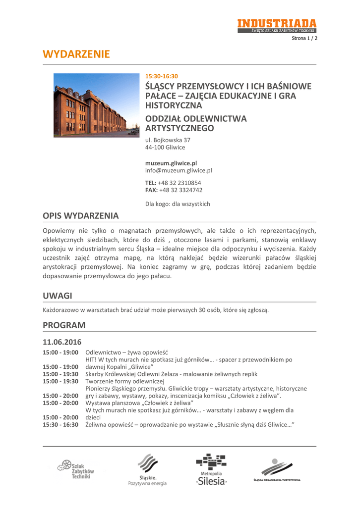 Strona 1 / 2 WYDARZENIE 15:30-16:30 ŚLĄSCY PRZEMYSŁOWCY I ICH BAŚNIOWE PAŁACE – ZAJĘCIA EDUKACYJNE I GRA HISTORYCZNA ODDZIAŁ ODLEWNICTWA ARTYSTYCZNEGO ul. Bojkowska 37 44-100 Gliwice muzeum.gliwice.pl [email protected] TEL: +48 32 2310854 FAX: +48 32 3324742 Dla kogo: dla wszystkich OPIS WYDARZENIA Opowiemy nie tylko o magnatach przemysłowych, ale także o ich reprezentacyjnych, eklektycznych siedzibach, które do dziś , otoczone lasami i parkami, stanowią enklawy spokoju w industrialnym sercu Śląska – idealne miejsce dla odpoczynku i wyciszenia. Każdy uczestnik zajęć otrzyma mapę, na którą naklejać będzie wizerunki pałaców śląskiej arystokracji przemysłowej. Na koniec zagramy w grę, podczas której zadaniem będzie dopasowanie przemysłowca do jego pałacu. UWAGI Każdorazowo w warsztatach brać udział może pierwszych 30 osób, które się zgłoszą. PROGRAM 11.06.2016 15:00 - 19:00 15:00 - 19:00 15:00 - 19:30 15:00 - 19:30 15:00 - 20:00 15:00 - 20:00 15:00 - 20:00 15:30 - 16:30 Odlewnictwo – żywa opowieść HIT! W tych murach nie spotkasz już górników… - spacer z przewodnikiem po dawnej Kopalni „Gliwice” Skarby Królewskiej Odlewni Żelaza - malowanie żeliwnych replik Tworzenie formy odlewniczej Pionierzy śląskiego przemysłu. Gliwickie tropy – warsztaty artystyczne, historyczne gry i zabawy, wystawy, pokazy, inscenizacja komiksu „Człowiek z żeliwa”. Wystawa planszowa „Człowiek z żeliwa” W tych murach nie spotkasz już górników… - warsztaty i zabawy z węglem dla dzieci Żeliwna opowieść – oprowadzanie po wystawie „Słusznie słyną dziś Gliwice…” Strona 2 / 2 15:30 - 16:30 15:30 - 16:30 15:30 - 16:30 17:00 - 18:00 17:00 - 18:00 17:00 - 18:00 17:00 - 18:00 18:30 - 19:30 18:30 - 19:30 18:30 - 19:30 18:30 - 19:30 20:00 - 22:00 Pionierzy śląskiego przemysłu: Reden, Baildon i Holzthausen – warsztaty Zaułek jubilera – warsztaty z wykorzystaniem replik żeliwnej biżuterii Śląscy przemysłowcy i ich baśniowe pałace – zajęcia edukacyjne i gra historyczna Żeliwna opowieść – oprowadzanie po wystawie „Słusznie słyną dziś Gliwice…” Pionierzy śląskiego przemysłu: Reden, Baildon i Holzthausen – warsztaty Zaułek jubilera – warsztaty z wykorzystaniem replik żeliwnej biżuterii Śląscy przemysłowcy i ich baśniowe pałace – zajęcia edukacyjne i gra historyczna Żeliwna opowieść – oprowadzanie po wystawie „Słusznie słyną dziś Gliwice…” Pionierzy śląskiego przemysłu: Reden, Baildon i Holzthausen – warsztaty Zaułek jubilera – warsztaty z wykorzystaniem replik żeliwnej biżuterii Śląscy przemysłowcy i ich baśniowe pałace – zajęcia edukacyjne i gra historyczna Krzysztof Kobyliński i przyjaciele - koncert