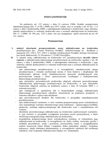 IiR 7624-1SU/5/09 TrzyciąŜ, dnia 11 lutego 2010 r. POSTANOWIENIE Na podstawie art. 123 ustawy z dnia 14 czerwca 1960r. Kodeks postępowania administracyjnego (Dz. U. nr 98 z 2000r. poz.1071 z późn. zm.) w związku z art. 63 ust. 1 i 4 ustawy z dnia 3 października 2008r. o udostępnieniu informacji o środowisku i jego ochronie, udziale społeczeństwa w ochronie środowiska oraz o ocenach oddziaływania na środowisko (Dz. U. z 2008r. Nr 199, poz. 1227 z późn. zm.) po zasięgnięciu opinii stosownie do art. 64 ww. ustawy Postanawiam I. nałoŜyć obowiązek przeprowadzenia oceny oddziaływania na środowisko przedsięwzięcia pn.: „Farma Wiatrowa Porąbka” zlokalizowanego na działkach o numerach 235, 236/3, 227, 228/2 w obrębie ewidencyjnym Porąbka, którego inwestorem jest Jacek Makowiecki, Ul. Kwiatowa 7, 32-083 Szczyglice, II. w ramach oceny oddziaływania na środowisko ww. przedsięwzięcia określić zakres raportu o oddziaływaniu planowanego przedsięwzięcia na środowisko zgodnie z art. 66 ustawy z dnia 3 października 2008r. o udostępnianiu informacji o środowisku i jego ochronie, udziale społeczeństwa w ochronie środowiska oraz o ocenach oddziaływania na środowisko: - opis planowanego przedsięwzięcia, a w szczególności: charakterystykę całego przedsięwzięcia i warunki uŜytkowania terenu w fazie budowy i eksploatacji lub uŜytkowania, główne cechy charakterystyczne procesów produkcyjnych oraz przewidywane rodzaje i ilości zanieczyszczeń, wynikające z funkcjonowania planowanego przedsięwzięcia; - opis elementów przyrodniczych środowiska objętych zakresem przewidywanego oddziaływania planowanego przedsięwzięcia na środowisko, w tym elementów środowiska objętych ochroną na podstawie ustawy z dnia 16 kwietnia 2004 r. o ochronie przyrody; - opis istniejących w sąsiedztwie lub w bezpośrednim zasięgu oddziaływania planowanego przedsięwzięcia zabytków chronionych na podstawie przepisów o ochronie zabytków i opiece nad zabytkami; - opis przewidywanych skutków dla środowiska w przypadku niepodejmowania przedsięwzięcia; - opis analizowanych wariantów, w tym: wariantu proponowanego przez wnioskodawcę oraz racjonalnego wariantu alternatywnego innej lokalizacji - ograniczającej konflikty społeczne, wariantu najkorzystniejszego dla środowiska wraz z uzasadnieniem ich wyboru; - określenie przewidywanego oddziaływania na środowisko analizowanych wariantów, w tym równieŜ w przypadku wystąpienia powaŜnej awarii przemysłowej, a takŜe moŜliwego transgranicznego oddziaływania na środowisko; - uzasadnienie proponowanego przez wnioskodawcę wariantu, ze wskazaniem jego oddziaływania na środowisko, w szczególności na: ludzi, rośliny, zwierzęta, grzyby i siedliska przyrodnicze, wodę i powietrze, powierzchnię ziemi, z uwzględnieniem ruchów masowych ziemi, klimat i krajobraz, dobra materialne, zabytki i krajobraz kulturowy, objęte istniejącą dokumentacją, w szczególności rejestrem lub ewidencją zabytków, oraz wzajemne oddziaływanie między ww. elementami, - - - - - - - - - opis metod prognozowania zastosowanych przez wnioskodawcę oraz opis przewidywanych znaczących oddziaływań planowanego przedsięwzięcia na środowisko, obejmujący bezpośrednie, pośrednie, wtórne, skumulowane, krótko-, średnio- i długoterminowe, stałe i chwilowe oddziaływania na środowisko, wynikające z istnienia przedsięwzięcia, wykorzystywania zasobów środowiska, emisji; opis przewidywanych działań mających na celu zapobieganie, ograniczanie lub kompensację przyrodniczą negatywnych oddziaływań na środowisko, w szczególności na cele i przedmiot ochrony obszaru Natura 2000 oraz integralność tego obszaru; planowane przedsięwzięcie jest związane z uŜyciem instalacji, naleŜy dokonać porównania proponowanej technologii z technologią spełniającą wymagania, o których mowa w art. 143 ustawy z dnia 27 kwietnia 2001 r. - Prawo ochrony środowiska; wskazanie, czy dla planowanego przedsięwzięcia jest konieczne ustanowienie obszaru ograniczonego uŜytkowania oraz określenie granic takiego obszaru (na poświadczonej przez właściwy organ kopii mapy ewidencyjnej), ograniczeń w zakresie przeznaczenia terenu, wymagań technicznych dotyczących obiektów budowlanych i sposobów korzystania z nich; przedstawienie zagadnień w formie graficznej; przedstawienie zagadnień w formie kartograficznej w skali odpowiadającej przedmiotowi i szczegółowości analizowanych w raporcie zagadnień oraz umoŜliwiającej kompleksowe przedstawienie przeprowadzonych analiz oddziaływania przedsięwzięcia na środowisko; analizę moŜliwych konfliktów społecznych związanych z planowanym przedsięwzięciem z uwzględnieniem argumentów w złoŜonych protestach przez mieszkańców w szczególności: moŜliwości budowy budynków mieszkalnych związanych z prowadzonym gospodarstwem rolnym na terenie R1 w zasięgu oddziaływania wiatraków, emisji infradźwięków, zacienienia, spadku wartości cen nieruchomości sąsiednich; przedstawienie propozycji monitoringu oddziaływania planowanego przedsięwzięcia na etapie jego budowy i eksploatacji lub uŜytkowania, w szczególności na cele i przedmiot ochrony obszaru Natura 2000 oraz integralność tego obszaru; wskazanie trudności wynikających z niedostatków techniki lub luk we współczesnej wiedzy, jakie napotkano, opracowując raport; streszczenie w języku niespecjalistycznym informacji zawartych w raporcie, w odniesieniu do kaŜdego elementu raportu; nazwisko osoby lub osób sporządzających raport; źródła informacji stanowiące podstawę do sporządzenia raportu; raport powinien uwzględniać oddziaływanie przedsięwzięcia na etapach jego realizacji, eksploatacji lub uŜytkowania oraz likwidacji; w raporcie naleŜy przedstawić informacje dotyczące moŜliwości kolizji planowanej inwestycji z elementami środowiska przyrodniczego, w szczególności występowania