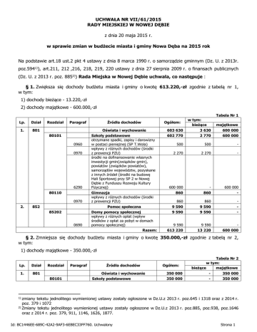 UCHWAŁA NR VII/61/2015 RADY MIEJSKIEJ W NOWEJ DĘBIE z dnia 20 maja 2015 r. w sprawie zmian w budżecie miasta i gminy Nowa Dęba na 2015 rok Na podstawie art.18 ust.2 pkt 4 ustawy z dnia 8 marca 1990 r. o samorządzie gminnym (Dz. U. z 2013r. poz.5941)), art.211, 212 ,216, 218, 219, 220 ustawy z dnia 27 sierpnia 2009 r. o finansach publicznych (Dz. U. z 2013 r. poz. 8852)) Rada Miejska w Nowej Dębie uchwala, co następuje : § 1. Zwiększa się dochody budżetu miasta i gminy o kwotę 613.220,-zł zgodnie z tabelą nr 1, w tym: 1) dochody bieżące - 13.220,-zł 2) dochody majątkowe - 600.000,-zł Tabela Nr 1 Lp. Dział 1. 801 Rozdział Paragraf Ogółem: majątkowe Oświata i wychowanie 603 630 3 630 600 000 602 770 2 770 600 000 500 500 - 2 270 2 270 - 6290 Szkoły podstawowe otrzymane spadki, zapisy i darowizny w postaci pieniężnej (SP T.Wola) wpływy z różnych dochodów (środki z prewencji PZU) środki na dofinansowanie własnych inwestycji gmin(związków gmin), powiatów (związków powiatów), samorządów województw, pozyskane z innych źródeł (środki na budowę Hali Sportowej przy SP 2 w Nowej Dębie z Funduszu Rozwoju Kultury Fizycznej) 600 000 - 600 000 860 860 - 0970 Gimnazja wpływy z różnych dochodów (środki z prewencji PZU) 80101 0960 0970 80110 2. Źródła dochodów w tym: bieżące 852 Pomoc społeczna 85202 0690 Domy pomocy społecznej wpływy z różnych opłat (wpływ środków z opłat za pobyt w domach pomocy społecznej) Razem: 860 860 - 9 590 9 590 - 9 590 9 590 - 9 590 9 590 - 613 220 13 220 600 000 § 2. Zmniejsza się dochody budżetu miasta i gminy o kwotę 350.000,-zł zgodnie z tabelą nr 2, w tym: 1) dochody majątkowe - 350.000,-zł Lp. Dział 1. 801 Rozdział Paragraf Źródła dochodów Oświata i wychowanie 80101 Szkoły podstawowe Ogółem: Tabela Nr 2 w tym: bieżące majątkowe 350 000 - 350 000 350 000 - 350 000 zmiany tekstu jednolitego wymienionej ustawy zostały ogłoszone w Dz.U.z 2013 r. poz.645 i 1318 oraz z 2014 r. poz. 379 i 1072 2) Zmiany tekstu jednolitego wymienionej ustawy zostały ogłoszone w Dz.U.z 2013 r. poz.885, poz.938, poz.1646 oraz z 2014 r. poz. 379, 911, 1146, 1626, 1877. 1) Id: BC1446EE-689C-42A2-9AF3-6EBEC33FF760. Uchwalony Strona 1 6630 dotacje celowe otrzymane z samorządu województwa na inwestycje i zakupy inwestycyjne realizowane na podstawie porozumień (umów) między jednostkami samorządu terytorialnego (środki na budowę Hali Sportowej przy SP 2 w Nowej Dębie) Razem: 350 000 - 350 000 350 000 - 350 000 § 3. Zwiększa się wydatki budżetu miasta i gminy o kwotę 694.320,-zł zgodnie z tabelą nr 3, w tym: 1) wydatki bieżące - 229.743,-zł 2) wydatki majątkowe - 464.577,-zł Lp. Dział 1. 600 Rozdział Paragraf Transport i łączność 60014 6300 2. Dotyczy: 180 000 Wydatki majątkowe z tego 1) dotacja na zadania inwestycyjne dotacja celowa na pomoc finansową udzielaną między jednostkami samorządu terytorialnego na dofinansowanie własnych zadań inwestycyjnych i zakupów inwestycyjnych (dla Powiatu Tarnobrzeskiego na przebudowę drogi powiatowej nr 1116 R relacji Alfredówka-Ciosy-Wydrza w km 0+000-2+761) 180 000 Oswiata i wychowanie Szkoły podstawowe Wydatki bieżące z tego 1) wydatki jednostek budżetowych 180 000 180 000 253 630 252 770 2 770 2 770 a) wydatki związane z realizacją ich zadań statutowych 2 770 4210 zakup materiałów i wyposażenia 2 270 4300 zakup usług pozostałych 6050 Wydatki majątkowe z tego 1) inwestycje i zakupy inwestycyjne wydatki inwestycyjne jednostek budżetowych (rozwój infrastruktury oświatowej na terenie miasta Nowa Dęba Budowa Hali Sportowej przy SP Nr 2 w Nowej Dębie - etap II- środki z FRKF) 80110 4210 3. 180 000 Drogi publiczne powiatowe 801 80101 Tabela Nr 3 Kwota 250 000 250 000 860 Wydatki bieżące z tego 1) wydatki jednostek budżetowych 860 a) wydatki związane z realizacją ich zadań statutowych 860 zakup materiałów i wyposażenia (G-1) 860 Pomoc społeczna 4330 250 000 Gimnazja 852 85202 500 860 9 590 Domy pomocy społecznej 9 590 Wydatki bieżące z tego 1) wydatki jednostek budżetowych 9 590 a) wydatki związane z realizacją ich zadań statutowych zakup usług przez jednostki samorządu terytorialnego od innych jednostek samorządu terytorialnego (zad.włas.b.gm.)- opłaty za pobyt w domu pomocy społecznej Id: BC1446EE-689C-42A2-9AF3-6EBEC33FF760. Uchwalony 9 590 9 590 9 590 Strona 2 4. 853 Pozostałe zadania w zakresie polityki społecznej 85305 4010 5. Wydatki bieżące z tego 1) wydatki jednostek budżetowych 215 423 215 423 a) wynagrodzenia i składki od nich naliczane 215 423 wynagrodzenia osobowe pracowników 215 423 Gospodarka komunalna i ochrona środowiska 2910 4560 6. 215 423 900 90095 1 100 Wydatki bieżące z tego 1) wydatki jednostek budżetowych 1 100 1 100 a) wydatki związane z realizacją ich zadań statutowych zwrot dotacji oraz płatności, w tym wykorzystanych niezgodnie z przeznaczeniem lub wykorzystanych z naruszeniem procedur, o których mowa w art. 184 ustawy, pobranych nienależnie lub w nadmiernej wysokości odsetki od dotacji oraz płatności: wykorzystanych niezgodnie z przeznaczeniem lub wykorzystanych z naruszeniem procedur, o których mowa a art.184 ustawy, pobranych nienależnie lub w nadmiernej wysokości Kultura fizyczna 6050 1 100 Pozostała działalność 926 92604 215 423 Żłobki 1 100 950 150 34 577 Instytucje kultury fizycznej 34 577 Wydatki majątkowe z tego 1) inwestycje i zakupy inwestycyjne wydatki inwestycyjne jednostek budżetowych (dostosowanie boiska sportowego na potrzeby lekkoatletyki w Nowej Dębie) 34 577 Razem: 694 320 34 577 34 577 § 4. Zmniejsza się wydatki budżetu miasta i gminy o kwotę 431.100,-zł zgodnie z tabelą nr 4, w tym: 1) wydatki majątkowe - 431.100,-zł Lp. Dział 1. 801 Rozdział Paragraf Oswiata i wychowanie 80101 6050 2. Tabela Nr 4 Kwota Dotyczy: 900 250 000 Szkoły podstawowe 250 000 Wydatki majątkowe z tego 1) inwestycje i zakupy inwestycyjne wy