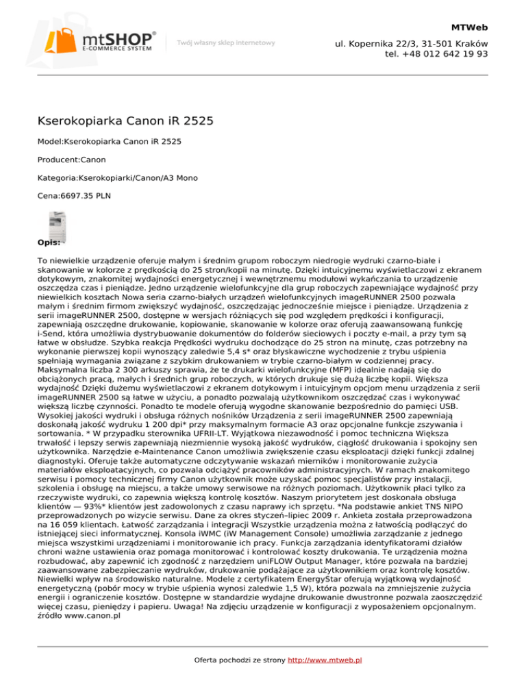 MTWeb ul. Kopernika 22/3, 31-501 Kraków tel. +48 012 642 19 93 Kserokopiarka Canon iR 2525 Model:Kserokopiarka Canon iR 2525 Producent:Canon Kategoria:Kserokopiarki/Canon/A3 Mono Cena:6697.35 PLN Opis: To niewielkie urządzenie oferuje małym i średnim grupom roboczym niedrogie wydruki czarno-białe i skanowanie w kolorze z prędkością do 25 stron/kopii na minutę. Dzięki intuicyjnemu wyświetlaczowi z ekranem dotykowym, znakomitej wydajności energetycznej i wewnętrznemu modułowi wykańczania to urządzenie oszczędza czas i pieniądze. Jedno urządzenie wielofunkcyjne dla grup roboczych zapewniające wydajność przy niewielkich kosztach Nowa seria czarno-białych urządzeń wielofunkcyjnych imageRUNNER 2500 pozwala małym i średnim firmom zwiększyć wydajność, oszczędzając jednocześnie miejsce i pieniądze. Urządzenia z serii imageRUNNER 2500, dostępne w wersjach różniących się pod względem prędkości i konfiguracji, zapewniają oszczędne drukowanie, kopiowanie, skanowanie w kolorze oraz oferują zaawansowaną funkcję i-Send, która umożliwia dystrybuowanie dokumentów do folderów sieciowych i poczty e-mail, a przy tym są łatwe w obsłudze. Szybka reakcja Prędkości wydruku dochodzące do 25 stron na minutę, czas potrzebny na wykonanie pierwszej kopii wynoszący zaledwie 5,4 s* oraz błyskawiczne wychodzenie z trybu uśpienia spełniają wymagania związane z szybkim drukowaniem w trybie czarno-białym w codziennej pracy. Maksymalna liczba 2 300 arkuszy sprawia, że te drukarki wielofunkcyjne (MFP) idealnie nadają się do obciążonych pracą, małych i średnich grup roboczych, w których drukuje się dużą liczbę kopii. Większa wydajność Dzięki dużemu wyświetlaczowi z ekranem dotykowym i intuicyjnym opcjom menu urządzenia z serii imageRUNNER 2500 są łatwe w użyciu, a ponadto pozwalają użytkownikom oszczędzać czas i wykonywać większą liczbę czynności. Ponadto te modele oferują wygodne skanowanie bezpośrednio do pamięci USB. Wysokiej jakości wydruki i obsługa różnych nośników Urządzenia z serii imageRUNNER 2500 zapewniają doskonałą jakość wydruku 1 200 dpi* przy maksymalnym formacie A3 oraz opcjonalne funkcje zszywania i sortowania. * W przypadku sterownika UFRII-LT. Wyjątkowa niezawodność i pomoc techniczna Większa trwałość i lepszy serwis zapewniają niezmiennie wysoką jakość wydruków, ciągłość drukowania i spokojny sen użytkownika. Narzędzie e-Maintenance Canon umożliwia zwiększenie czasu eksploatacji dzięki funkcji zdalnej diagnostyki. Oferuje także automatyczne odczytywanie wskazań mierników i monitorowanie zużycia materiałów eksploatacyjnych, co pozwala odciążyć pracowników administracyjnych. W ramach znakomitego serwisu i pomocy technicznej firmy Canon użytkownik może uzyskać pomoc specjalistów przy instalacji, szkolenia i obsługę na miejscu, a także umowy serwisowe na różnych poziomach. Użytkownik płaci tylko za rzeczywiste wydruki, co zapewnia większą kontrolę kosztów. Naszym priorytetem jest doskonała obsługa klientów — 93%* klientów jest zadowolonych z czasu naprawy ich sprzętu. *Na podstawie ankiet TNS NIPO przeprowadzonych po wizycie serwisu. Dane za okres styczeń–lipiec 2009 r. Ankieta została przeprowadzona na 16 059 klientach. Łatwość zarządzania i integracji Wszystkie urządzenia można z łatwością podłączyć do istniejącej sieci informatycznej. Konsola iWMC (iW Management Console) umożliwia zarządzanie z jednego miejsca wszystkimi urządzeniami i monitorowanie ich pracy. Funkcja zarządzania identyfikatorami działów chroni ważne ustawienia oraz pomaga monitorować i kontrolować koszty drukowania. Te urządzenia można rozbudować, aby zapewnić ich zgodność z narzędziem uniFLOW Output Manager, które pozwala na bardziej zaawansowane zabezpieczanie wydruków, drukowanie podążające za użytkownikiem oraz kontrolę kosztów. Niewielki wpływ na środowisko naturalne. Modele z certyfikatem EnergyStar oferują wyjątkową wydajność energetyczną (pobór mocy w trybie uśpienia wynosi zaledwie 1,5 W), która pozwala na zmniejszenie zużycia energii i ograniczenie kosztów. Dostępne w standardzie wydajne drukowanie dwustronne pozwala zaoszczędzić więcej czasu, pieniędzy i papieru. Uwaga! Na zdjęciu urządzenie w konfiguracji z wyposażeniem opcjonalnym. źródło www.canon.pl Oferta pochodzi ze strony http://www.mtweb.pl MTWeb ul. Kopernika 22/3, 31-501 Kraków tel. +48 012 642 19 93 Prędkość :25 A4/min Prędkość:15 A3/min Maksymalny format:A3 org. Format kopii:A5R do A3 pod. ręczny Rozm./gramat. kaseta:64 do 90 g/m2 Rozm./gramat. podajnik:64 do 128 g/m2 Rozm./gramat. duplex:64 do 80 g/m2 Zoom:25-400% % Procesor:400 MHz Pamięć obrazu:256 MB Pamięć dodatkowa:opcja GB Czas uzyskania 1 kopii:5.4 sek. Poj. podajnika org.:opcja ark. Rozdzielczość drukarki:600 x 600 dpi Rozdzielczość kopii:600 x 600 dpi Tryb foto:nie Tryb foto/tekst:nie Tryb tekst:nie Jednorazowa ilość kopii:999 ark. Pojemność pap. kaseta:550 ark. Pojemność pap. kaseta 2:550 ark. Pojemność pap. p. ręczny:100 (A4, A5), 50 (A3) ark. Duplex:standard Kody dostępu:nie Interfejsy:USB 2.0, Ethernet Pobór mocy:1.345 kW Język opisu strony (std):UFRII-LT Język opisu strony (opcja):PCL5e/6, em. PostScript lvl.3 Wymiary (szer/dł/wys):565 x 680 x 806 mm Waga:68 kg Oferta pochodzi ze strony http://www.mtweb.pl MTWeb ul. Kopernika 22/3, 31-501 Kraków tel. +48 012 642 19 93 Zasilanie:220-240AC V Oferta pochodzi ze strony http://www.mtweb.pl