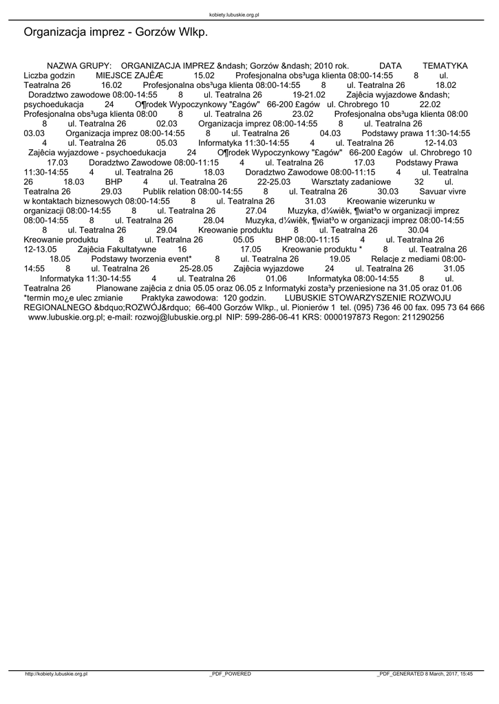 kobiety.lubuskie.org.pl Organizacja imprez - Gorzów Wlkp. NAZWA GRUPY: ORGANIZACJA IMPREZ – Gorzów – 2010 rok. DATA TEMATYKA Liczba godzin MIEJSCE ZAJÊÆ 15.02 Profesjonalna obs³uga klienta 08:00-14:55 8 ul. Teatralna 26 16.02 Profesjonalna obs³uga klienta 08:00-14:55 8 ul. Teatralna 26 18.02 Doradztwo zawodowe 08:00-14:55 8 ul. Teatralna 26 19-21.02 Zajêcia wyjazdowe – psychoedukacja 24 O¶rodek Wypoczynkowy "£agów" 66-200 £agów ul. Chrobrego 10 22.02 Profesjonalna obs³uga klienta 08:00 8 ul. Teatralna 26 23.02 Profesjonalna obs³uga klienta 08:00 8 ul. Teatralna 26 02.03 Organizacja imprez 08:00-14:55 8 ul. Teatralna 26 03.03 Organizacja imprez 08:00-14:55 8 ul. Teatralna 26 04.03 Podstawy prawa 11:30-14:55 4 ul. Teatralna 26 05.03 Informatyka 11:30-14:55 4 ul. Teatralna 26 12-14.03 Zajêcia wyjazdowe - psychoedukacja 24 O¶rodek Wypoczynkowy "£agów" 66-200 £agów ul. Chrobrego 10 17.03 Doradztwo Zawodowe 08:00-11:15 4 ul. Teatralna 26 17.03 Podstawy Prawa 11:30-14:55 4 ul. Teatralna 26 18.03 Doradztwo Zawodowe 08:00-11:15 4 ul. Teatralna 26 18.03 BHP 4 ul. Teatralna 26 22-25.03 Warsztaty zadaniowe 32 ul. Teatralna 26 29.03 Publik relation 08:00-14:55 8 ul. Teatralna 26 30.03 Savuar vivre w kontaktach biznesowych 08:00-14:55 8 ul. Teatralna 26 31.03 Kreowanie wizerunku w organizacji 08:00-14:55 8 ul. Teatralna 26 27.04 Muzyka, d¼wiêk, ¶wiat³o w organizacji imprez 08:00-14:55 8 ul. Teatralna 26 28.04 Muzyka, d¼wiêk, ¶wiat³o w organizacji imprez 08:00-14:55 8 ul. Teatralna 26 29.04 Kreowanie produktu 8 ul. Teatralna 26 30.04 Kreowanie produktu 8 ul. Teatralna 26 05.05 BHP 08:00-11:15 4 ul. Teatralna 26 12-13.05 Zajêcia Fakultatywne 16 17.05 Kreowanie produktu * 8 ul. Teatralna 26 18.05 Podstawy tworzenia event* 8 ul. Teatralna 26 19.05 Relacje z mediami 08:0014:55 8 ul. Teatralna 26 25-28.05 Zajêcia wyjazdowe 24 ul. Teatralna 26 31.05 Informatyka 11:30-14:55 4 ul. Teatralna 26 01.06 Informatyka 08:00-14:55 8 ul. Teatralna 26 Planowane zajêcia z dnia 05.05 oraz 06.05 z Informatyki zosta³y przeniesione na 31.05 oraz 01.06 *termin mo¿e ulec zmianie Praktyka zawodowa: 120 godzin. LUBUSKIE STOWARZYSZENIE ROZWOJU REGIONALNEGO „ROZWÓJ” 66-400 Gorzów Wlkp., ul. Pionierów 1 tel. (095) 736 46 00 fax. 095 73 64 666 www.lubuskie.org.pl; e-mail: [email protected] NIP: 599-286-06-41 KRS: 0000197873 Regon: 211290256 http://kobiety.lubuskie.org.pl _PDF_POWERED _PDF_GENERATED 8 March, 2017, 15:45