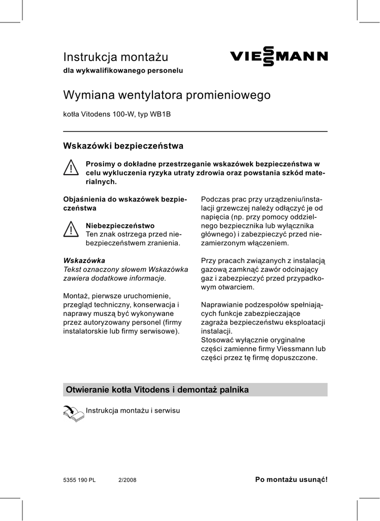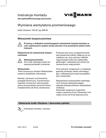 Instrukcja montażu VIESMANN dla wykwalifikowanego personelu Wymiana wentylatora promieniowego kotła Vitodens 100‐W, typ WB1B Wskazówki bezpieczeństwa Prosimy o dokładne przestrzeganie wskazówek bezpieczeństwa w celu wykluczenia ryzyka utraty zdrowia oraz powstania szkód materialnych. Objaśnienia do wskazówek bezpieczeństwa Niebezpieczeństwo Ten znak ostrzega przed niebezpieczeństwem zranienia. Wskazówka Tekst oznaczony słowem Wskazówka zawiera dodatkowe informacje. Montaż, pierwsze uruchomienie, przegląd techniczny, konserwacja i naprawy muszą być wykonywane przez autoryzowany personel (firmy instalatorskie lub firmy serwisowe). Podczas prac przy urządzeniu/instalacji grzewczej należy odłączyć je od napięcia (np. przy pomocy oddzielnego bezpiecznika lub wyłącznika głównego) i zabezpieczyć przed niezamierzonym włączeniem. Przy pracach związanych z instalacją gazową zamknąć zawór odcinający gaz i zabezpieczyć przed przypadkowym otwarciem. Naprawianie podzespołów spełniających funkcje zabezpieczające zagraża bezpieczeństwu eksploatacji instalacji. Stosować wyłącznie oryginalne części zamienne firmy Viessmann lub części przez tę firmę dopuszczone. Otwieranie kotła Vitodens i demontaż palnika Instrukcja montażu i serwisu 5355 190 PL 2/2008 Po montażu usunąć! Wymiana wentylatora promieniowego 2. Poluzować dwie śruby i zdjąć armaturę gazu B z dyszą Venturi z wentylatora A. 2 3. Założyć nowy wentylator A z nowym uszczelnieniem C do armatury gazu B. Moment dokręcający śrub mocujących: 3 Nm. 4. Założyć nowy wentylator A z armaturą gazu B i nowym uszczelnieniem D do palnika. Moment dokręcający śrub mocujących: 4 Nm. 5355 190 PL 1. Poluzować dwie śruby i zdjąć wentylator A z armaturą gazu B i dyszą Venturi C. Wymiana wentylatora promieniowego (ciąg dalszy) 5. Zamontować palnik. Instrukcja montażu i serwisu Niebezpieczeństwo Ulatnianie się gazu grozi wybuchem. Skontrolować szczelność przewodów gazowych. 5355 190 PL Wskazówka Na wszystkich przyłączach po stronie gazu założyć nowe uszczelnienia. 6. Uruchomić kocioł grzewczy i sprawdzić szczelność instalacji. 3 Zmiany techniczne zastrzeżone! wybielonym i wolnym od chloru Wydrukowano na papierze ekologicznym, 4 5355 190 PL Viessmann Sp. z o.o. ul. Karkonoska 65 53-015 Wrocław tel.: (071) 36 07 100 faks: (071) 36 07 101 www.viessmann.com