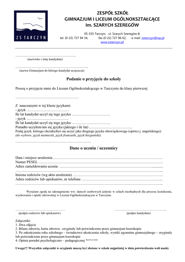ZESPÓŁ SZKÓŁ GIMNAZJUM I LICEUM OGÓLNOKSZTAŁCĄCE Im. SZARYCH SZEREGÓW 05-555 Tarczyn; ul. Szarych Szeregów 8; tel. (0-22) 727 94 34, fax (0-22) 727 86 62, e-mail: [email protected] www.zstarczyn.pl …………………………………………. (nazwisko i imię kandydata) ………………………………………………….. (nazwa Gimnazjum do którego kandydat uczęszcza) Podanie o przyjęcie do szkoły Proszę o przyjęcie mnie do Liceum Ogólnokształcącego w Tarczynie do klasy pierwszej …………………………………………… Z nauczanymi w tej klasie językami: - język ……………………………. Ile lat kandydat uczył się tego języka …………………………. - język ……………………………. Ile lat kandydat uczył się tego języka …………………………. Ponadto uczyłem/am się języka (jakiego i ile lat) …………………………….. Podaj język, którego chciał(a)byś się uczyć jako drugiego języka obowiązkowego (oprócz j. angielskiego): (do wyboru: język niemiecki, język francuski, język hiszpański). ……………………………………………………. Dane o uczniu / uczennicy Data i miejsce urodzenia ……………………………………………………………………………. Numer PESEL ………………………………………………………………………………………. Adres zameldowania ucznia: …………………………………………………………………........... ……………………………………………………………………………………………………….. Imiona rodziców (wg aktu urodzenia) ………………………………………………………………. Adres rodziców lub opiekunów, nr telefonu ………………………………………………………... ……………………………………………………………………………………………………….. Wyrażam zgodę na udostępnienie ww. danych osobowych jedynie w celach niezbędnych dla procesu kształcenia, wychowania i opieki zdrowotnej w Liceum Ogólnokształcącym w Tarczynie. ………………………………………… (podpis rodziców lub opiekunów) …………………………………………... (podpis kandydata) Załączniki: 1. Dwa zdjęcia 2. Bilans zdrowia, karta zdrowia –oryginały lub poświadczone przez gimnazjum kserokopie 3. Po zakończeniu roku szkolnego – świadectwo ukończenia szkoły, wyniki egzaminu gimnazjalnego – oryginały lub poświadczone przez gimnazjum kserokopie 4. Opinia poradni psychologiczno – pedagogicznej *(jeśli posiada) Uwaga!!! Wszystkie załączniki w oryginale muszą być złożone w szkole najpóźniej w dniu potwierdzenia woli nauki.