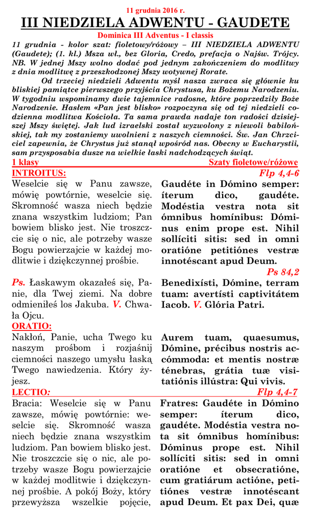 11 grudnia 2016 r. III NIEDZIELA ADWENTU - GAUDETE Dominica III Adventus - I classis 11 grudnia - kolor szat: fioletowy/różowy – III NIEDZIELA ADWENTU (Gaudete); (1. kl.) Msza wł., bez Gloria, Credo, prefacja o Najśw. Trójcy. NB. W jednej Mszy wolno dodać pod jednym zakończeniem do modlitwy z dnia modlitwę z przeszkodzonej Mszy wotywnej Rorate. Od trzeciej niedzieli Adwentu myśl nasza zwraca się głównie ku bliskiej pamiątce pierwszego przyjścia Chrystusa, ku Bożemu Narodzeniu. W tygodniu wspominamy dwie tajemnice radosne, które poprzedziły Boże Narodzenie. Hasłem «Pan jest blisko» rozpoczyna się od tej niedzieli codzienna modlitwa Kościoła. Ta sama prawda nadaje ton radości dzisiejszej Mszy świętej. Jak lud izraelski został wyzwolony z niewoli babilońskiej, tak my zostaniemy uwolnieni z naszych ciemności. Św. Jan Chrzciciel zapewnia, że Chrystus już stanął wpośród nas. Obecny w Eucharystii, sam przysposabia dusze na wielkie łaski nadchodzących świąt. 1 klasy INTROITUS: Weselcie się w Panu zawsze, mówię powtórnie, weselcie się. Skromność wasza niech będzie znana wszystkim ludziom; Pan bowiem blisko jest. Nie troszczcie się o nic, ale potrzeby wasze Bogu powierzajcie w każdej modlitwie i dziękczynnej prośbie. Szaty fioletowe/różowe Flp 4,4-6 Gaudéte in Dómino semper: íterum dico, gaudéte. Modéstia vestra nota sit ómnibus homínibus: Dóminus enim prope est. Nihil sollíciti sitis: sed in omni oratióne petitiónes vestræ innotéscant apud Deum. Ps 84,2 Ps. Łaskawym okazałeś się, Pa- Benedixísti, Dómine, terram nie, dla Twej ziemi. Na dobre tuam: avertísti captivitátem odmieniłeś los Jakuba. V. Chwa- Iacob. V. Glória Patri. ła Ojcu. ORATIO: Nakłoń, Panie, ucha Twego ku Aurem tuam, quaesumus, naszym prośbom i rozjaśnij Dómine, précibus nostris acciemności naszego umysłu łaską cómmoda: et mentis nostræ Twego nawiedzenia. Który ży- ténebras, grátia tuæ visijesz. tatiónis illústra: Qui vivis. LECTIO: Flp 4,4-7 Bracia: Weselcie się w Panu Fratres: Gaudéte in Dómino zawsze, mówię powtórnie: we- semper: íterum dico, selcie się. Skromność wasza gaudéte. Modéstia vestra noniech będzie znana wszystkim ta sit ómnibus homínibus: ludziom. Pan bowiem blisko jest. Dóminus prope est. Nihil Nie troszczcie się o nic, ale po- sollíciti sitis: sed in omni trzeby wasze Bogu powierzajcie oratióne et obsecratióne, w każdej modlitwie i dziękczyn- cum gratiárum actióne, petinej prośbie. A pokój Boży, który tiónes vestræ innotéscant przewyższa wszelkie pojęcie, apud Deum. Et pax Dei, quæ niechaj strzeże serc waszych exsúperat omnem sensum, i umysłów waszych w Chrystusie custódiat corda vestra et inJezusie, Panu naszym. tellegéntias vestras, in Christo Iesu, Dómino nostro. GRADUALE: Ps 79,2-3.2 Panie, który siedzisz na Cheru- Qui sedes, Dómine, super binach, wzbudź Twą potęgę Chérubim, éxcita poténtiam i przyjdź. tuam, et veni. V. Pasterzu Izraela posłuchaj, V. Qui regis Israël, inténde: Ty, co jak trzodę wiedziesz ród qui dedúcis, velut ovem, IoJózefa. seph. ALLELUJA: Alleluja, alleluja. V. Wzbudź Allelúia, allelúia. V. Excita, Twą potęgę, Panie, i przyjdź, aby Dómine, potentiam tuam, et nas zbawić. Alleluja. veni, ut salvos fácias nos. Allelúia. EVANGELIUM: J 1,19-28 Onego czasu: Żydzi z Jerozolimy In illo tempore: Misérunt Iuwysłali do Jana kapłanów i lewi- daei ab Ierosólymis sacerdótów, aby go zapytali: «Kim je- tes et levítas ad Ioánnem, ut steś?» I wyznał, a nie zaprzeczył, interrogárent eum: Tu quis oświadczając im: «Jam nie jest es? Et conféssus est, et non Chrystus». Zapytali go tedy: negávit: et conféssus est: Qu«Cóż więc? Jesteś Ty Eliaszem?» ia non sum ego Christus. Et I odrzekł: «Nie jestem». «Jesteś interrogavérunt eum: Quid ty prorokiem?» I odpowiedział: ergo? Elías es tu? Et dixit: «Nie». Rzekli mu tedy: «Kimże Non sum. Prophéta es tu? Et jesteś, abyśmy mogli odpowiedź respondit: Non. Dixérunt erdać tym, którzy nas wysłali. Cóż go ei: Quis es, ut respónsum powiadasz sam o sobie?» I rzekł: demus his, qui misérunt nos? «Jam głos tego, który woła na Quid dicis de te ipso? Ait: pustkowiu: drogę prostujcie Pa- Ego vox clamántis in desérnu, jako mówił Izajasz prorok». to: Dirígite viam Dómini, siA wysłańcy byli z faryzeuszów. cut dixit Isaías Prophéta. Et I pytając go mówili: «Czemuż te- qui missi fúerant, erant ex dy chrzcisz, jeśli nie jesteś Chry- pharisaeis. Et interrogavstusem ani Eliaszem, ani proro- érunt eum, et dixérunt ei: kiem?» Odpowiedział im Jan, Quid ergo baptízas, si tu non mówiąc: «Ja chrzczę wodą, ale es Christus, neque Elías, pośród was stanął Ten, którego neque Prophéta? Respóndit wy nie znacie. To Ten, który eis Ioánnes, dicens: Ego bapprzyjdzie po mnie, a stał się tízo in aqua: médius autem przede mną, któremu nie jestem vestrum stetit, quem vos negodzien rozwiązać rzemyka scítis. Ipse est, qui post me u sandałów Jego». To się działo ventúrus est, qui ante me w Betanii za Jordanem, gdzie factus est: cuius ego non sum Jan chrzcił. dignus ut solvam eius corrígiam calceaménti. Hæc in Bethánia facta sunt trans Iordánem, ubi erat Ioánnes baptízans. OFFERTORIUM: Ps 84,2 Łaskawym okazałeś się, Panie, Benedixísti, Dómine, terram dla Twej ziemi, na dobre odmie- tuam: avertísti captivitátem niłeś los Jakuba: ludowi Twemu Iacob: remisísti iniquitatem darowałeś winę. plebis tuæ. SECRETA: Daj, Panie, abyśmy nieustannie Devotiónis nostræ tibi, quaeskładali Tobie ofiarę naszego sumus, Dómine, hóstia iúgioddania. Niech przez nią speł- ter immolétur: quæ et sacri niają się ustanowione przez Cie- péragat institúta mystérii, et bie tajemnice, i niech się w nas salutáre tuum in nobis midokonuje dzieło Twego zbawie- rabíliter operétur. Per Donia. Przez Pana. minum. PRAEFATIO DE SANCTISSI