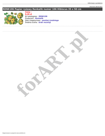 Informacje o produkcie Utworzono 08-03-2017 RENK106 Papier ryżowy Renkalik numer 106 Hibiscus 35 x 50 cm Cena : 9,20 zł fo rA R T. pl Nr katalogowy : RENK106 Producent : Renkalik Stan magazynowy : poniżej średniego Średnia ocena : brak recenzji Wygenerowano w programie www.oscGold.com