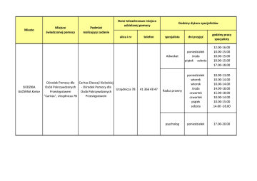 Miasto Miejsce świadczonej pomocy Podmiot realizujący zadanie Dane teleadresowe miejsca udzielanej pomocy ulica i nr SIEDZIBA GŁÓWNA Kielce Ośrodek Pomocy dla Caritas Diecezji Kieleckiej Osób Pokrzywdzonych - Ośrodek Pomocy dla Urzędnicza 7B Przestępstwem Osób Pokrzywdzonych "Caritas", Urzędnicza 7B Przestępstwem telefon 41 366 48 47 Godziny dyżuru specjalistów dni przyjęć godziny pracy specjalisty Adwokat poniedziałek środa piątek sobota 12.00-16.00 10.00-15.00 10.00-15.00 10.00-15.00 17.00-18.00 Radca prawny poniedziałek wtorek wtorek środa czwartek czwartek piątek sobota 10.00-13.00 10.00-14.00 10.00-14.00 14.00-18.00 15.00-18.00 10.00-14.00 10.00-15.00 14.00 -18.00 psycholog poniedziałek 17.00-20.00 specjalista
