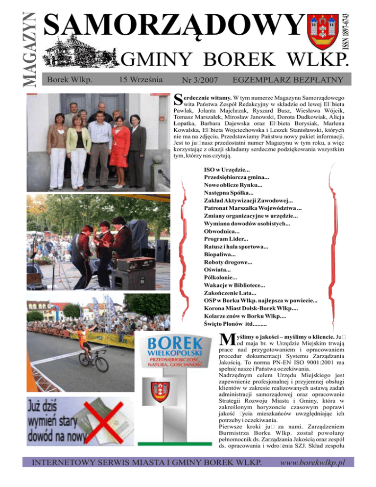 ISSN 1897-6743 MAGAZYN SAMORZĄDOWY GMINY BOREK WLKP. Borek Wlkp. 15 Września Nr 3/2007 EGZEMPLARZ BEZPŁATNY S erdecznie witamy. W tym numerze Magazynu Samorządowego wita Państwa Zespół Redakcyjny w składzie od lewej Elżbieta Pawlak, Jolanta Majchrzak, Ryszard Busz, Wiesława Wójcik, Tomasz Marszałek, Mirosław Janowski, Dorota Dudkowiak, Alicja Łopatka, Barbara Dajewska oraz Elżbieta Borysiak, Marlena Kowalska, Elżbieta Wojciechowska i Leszek Stanisławski, których nie ma na zdjęciu. Przedstawiamy Państwu nowy pakiet informacji. Jest to już nasz przedostatni numer Magazynu w tym roku, a więc korzystając z okazji składamy serdeczne podziękowania wszystkim tym, którzy nas czytają. ISO w Urzędzie... Przedsiębiorcza gmina... Nowe oblicze Rynku... Następna Spółka... Zakład Aktywizacji Zawodowej... Patronat Marszałka Województwa ... Zmiany organizacyjne w urzędzie... Wymiana dowodów osobistych... Obwodnica... Program Lider... Ratusz i hala sportowa... Biopaliwa... Roboty drogowe... Oświata... Półkolonie... Wakacje w Bibliotece... Zakończenie Lata... OSP w Borku Wlkp. najlepsza w powiecie... Korona Miast Dolsk-Borek Wlkp.... Kolarze znów w Borku Wlkp.... Święto Plonów itd......... M yślimy o jakości – myślimy o kliencie. Już od maja br. w Urzędzie Miejskim trwają prace nad przygotowaniem i opracowaniem procedur dokumentacji Systemu Zarządzania Jakością. To norma PN-EN ISO 9001:2001 ma spełnić nasze i Państwa oczekiwania. Nadrzędnym celem Urzędu Miejskiego jest zapewnienie profesjonalnej i przyjemnej obsługi klientów w zakresie realizowanych ustawą zadań administracji samorządowej oraz opracowanie Strategii Rozwoju Miasta i Gminy, która w zakreślonym horyzoncie czasowym poprawi jakość życia mieszkańców uwzględniając ich potrzeby i oczekiwania. Pierwsze kroki już za nami. Zarządzeniem Burmistrza Borku Wlkp. został powołany pełnomocnik ds. Zarządzania Jakością oraz zespół ds. opracowania i wdrożenia SZJ. Skład zespołu INTERNETOWY SERWIS MIASTA I GMINY BOREK WLKP. www.borekwlkp.pl INFORMACJE liczy 12 osób i są to pracownicy Urzędu, którzy wzięli udział w szkoleniu zakończonym testem egzaminacyjnym. Praca zespołu polega na spotkaniu z konsultantem ds. wdrożenia SZJ oraz rzetelnym i terminowym wykonywaniu prac poleconych. Każde spotkanie zostaje zakończone wdrożeniem przygotowanych i skonsultowanych norm. Ten ogrom pracy, który wykonuje zespół jeszcze trochę potrwa. Zakończenie wszystkich procedur i certyfikację przewidujemy na I kwartał 2008r. Z IELONE KSIĄŻECZKI STRACĄ WAŻNOŚĆ !!! Jeszcze niecałe cztery miesiące pozostało wszystkim, którzy stare dowody osobiste mają wymienić na nowe. Zwlekać nie warto. Po nowym roku zielone książeczki stracą bowiem ważność. Termin składania wniosków o wymianę dowodów osobistych NIE ZOSTAŁ przedłużony, jest aktualny do 31 grudnia 2007r. Przedłużony został jedynie termin wydawania nowych dowodów osobistych do 31 marca 2008r. Wszystkich przekonujemy, że warto już teraz udać się w tym celu do Urzędu Miejskiego. Obecnie nie ma kolejek i konieczne formalności można sprawnie załatwić. Pod koniec roku na pewno będzie gorzej, bo jak mówi urzędnik odpowiedzialny za sprawy obywatelskie, dowody musi jeszcze wymienić około 900 mieszkańców. Borkowiacy są jednak zdyscyplinowani i wymieniają na bieżąco swoje dowody. Jednak dla osób, które dotąd nie wymieniły dokumentu ze względu na niemożność stawienia się w normalnych godzinach pracy urzędu, np. z uwagi na pracę, częste podróże służbowe czy też brak urlopu uruchomione zostały w urzędzie sobotnie dyżury. Wnioski o wymianę dowodów osobistych będą przyjmowane dnia 22 września i 20 października 2007r. (tj. soboty) w godzinach 8:00-15:00.Jeżeli ktoś jest obłożnie chory i nie może sam udać się do Urzędu Miejskiego, może poprosić inna osobę o przekazanie dokumentów. Urzędnik sam zgłosi się po podpis do wnioskującego o dowód. Jeszcze raz przypominamy, że warto te formalności załatwić już dziś. Po nowym roku zielone książeczki staną się bezużyteczne. A bez nowych dokumentów trudno nam będzie załatwić wiele spraw, choćby w banku czy na poczcie. K OLARZE ZNÓW W BORKU WLKP. Po raz kolejny w tym roku, już 23 września gościć będziemy kolarzy w Borku Wlkp. II Kryterium Uliczne o Puchar Burmistrza Borku Wlkp. odbędzie się 23 września br. Patronat honorowy nad wyścigiem objął Marszałek Województwa Wielkopolskiego Marek Woźniak. Wyścig ten będzie podsumowaniem cyklu wyścigów KORONA MIAST. Wyznaczono trasę na pętli okrężnej, biegnącej ulicami: Zdzieska, Pogorzelska, St. Gogulskiego, Powstańców Wielkopolskich, Rynek. Zawodnicy będą mieli do pokonania 60 okrążeń, tj. 66 km. ZAPRASZAMY NA WYŚCIG Program i przebieg wyścigu 14.00- 14.10 - otwarcie kryterium - Plac Rynkowy w Borku Wlkp. 14.10-14.15 - wyścig dzieci młodszych - 1 okrążenie / mała runda/ 14.20-14.30 - wyścig dzieci starszych - 1 okrążenie / duża runda/ 14.40-15.00 - wyścig vip-ów - 10 okrążeń ulicami miasta 15.00-16.20 - wyścig główny - 60 okrążeń x 1.1km 16.40-17.10 - dekoracja zwycięzców - Plac Rynkowy w Borku Wlkp. str. 2 U TRUDNIENIA W RUCHU DROGOWYM ZWIĄZANE Z WYŚCIGIEM. W dniu 23 września 2007r. w godz. od 14:00– 17:30 zamknięte dla ruchu zostaną następujące ulice w Borku Wlkp.: ul. Powstańców Wielkopolskich ( na wysokości MGOK ul. Gogulskiego), ul.. Gogulskiego, ul. Rynek, ul. Zdzieska (do ul. Pogorzelskiej), ul. Pogorzelska ( do Karolewa), a także -droga przy przedszkolu w Karolewie. Zamknięta będzie również droga krajowa nr 12. Prawidłowość ruchu w czasie trwania wyścigu zabezpieczy Policja i Straż. Burmistrz Borku Wlkp. i organizatorzy II Kryterium Ulicznego o Puchar Burmistrza Borku Wlkp. przepraszają użytkowników dróg i mieszkańców Borku Wlkp. za w/w utrudnienia w ruchu drogowym. N ASTĘP