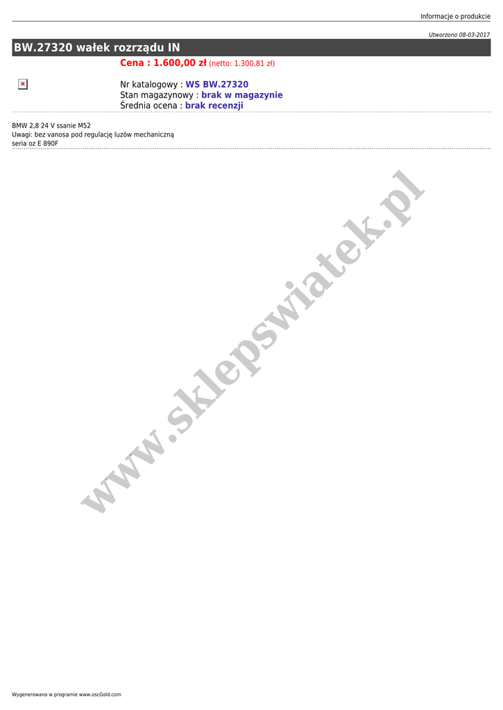 Informacje o produkcie Utworzono 08-03-2017 BW.27320 wałek rozrządu IN Cena : 1.600,00 zł (netto: 1.300,81 zł) Nr katalogowy : WS BW.27320 Stan magazynowy : brak w magazynie Średnia ocena : brak recenzji w w w .s kl ep sw ia te k. pl BMW 2,8 24 V ssanie M52 Uwagi: bez vanosa pod regulację luzów mechaniczną seria oz E 890F Wygenerowano w programie www.oscGold.com