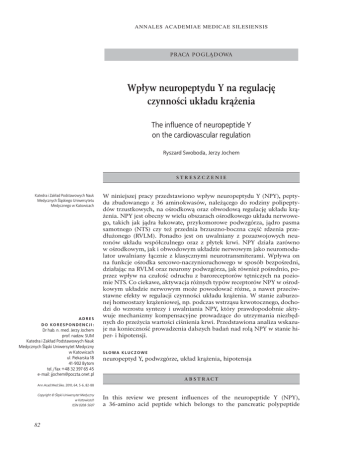 ANNALES ACADEMIAE MEDICAE SILESIENSIS PRACA POGLĄDOWA Wpływ neuropeptydu Y na regulację czynności układu krążenia The influence of neuropeptide Y on the cardiovascular regulation Ryszard Swoboda, Jerzy Jochem STRESZCZENIE Katedra i Zakład Podstawowych Nauk Medycznych Śląskiego Uniwersytetu Medycznego w Katowicach ADRES D O KO R E S P O N D E N C J I : Dr hab. n. med. Jerzy Jochem prof. nadzw. SUM Katedra i Zakład Podstawowych Nauk Medycznych Śląski Uniwersytet Medyczny w Katowicach ul. Piekarska 18 41-902 Bytom tel./fax +48 32 397 65 45 e-mail: [email protected] W niniejszej pracy przedstawiono wpływ neuropeptydu Y (NPY), peptydu zbudowanego z 36 aminokwasów, należącego do rodziny polipeptydów trzustkowych, na ośrodkową oraz obwodową regulację układu krążenia. NPY jest obecny w wielu obszarach ośrodkowego układu nerwowego, takich jak jądra łukowate, przykomorowe podwzgórza, jądro pasma samotnego (NTS) czy też przednia brzuszno-boczna część rdzenia przedłużonego (RVLM). Ponadto jest on uwalniany z pozazwojowych neuronów układu współczulnego oraz z płytek krwi. NPY działa zarówno w ośrodkowym, jak i obwodowym układzie nerwowym jako neuromodulator uwalniany łącznie z klasycznymi neurotransmiterami. Wpływa on na funkcje ośrodka sercowo-naczynioruchowego w sposób bezpośredni, działając na RVLM oraz neurony podwzgórza, jak również pośrednio, poprzez wpływ na czułość odruchu z baroreceptorów tętniczych na poziomie NTS. Co ciekawe, aktywacja różnych typów receptorów NPY w ośrodkowym układzie nerwowym może powodować różne, a nawet przeciwstawne efekty w regulacji czynności układu krążenia. W stanie zaburzonej homeostazy krążeniowej, np. podczas wstrząsu krwotocznego, dochodzi do wzrostu syntezy i uwalniania NPY, który prawdopodobnie aktywuje mechanizmy kompensacyjne prowadzące do utrzymania niezbędnych do przeżycia wartości ciśnienia krwi. Przedstawiona analiza wskazuje na konieczność prowadzenia dalszych badań nad rolą NPY w stanie hiper- i hipotensji. S Ł O WA K L U C Z O W E neuropeptyd Y, podwzgórze, układ krążenia, hipotensja A B S T R AC T Ann.Acad.Med.Siles. 2010, 64, 5-6, 82-88 Copyright © Śląski Uniwersytet Medyczny w Katowicach ISSN 0208-5607 82 In this review we present influences of the neuropeptide Y (NPY), a 36-amino acid peptide which belongs to the pancreatic polypeptide NEUROPEPTYD Y I UKàAD KRĄĩENIA family, on the central and peripheral cardiovascular regulation. NPY has been detected in many central nervous system areas, including arcuate and paraventricular nuclei of the hypothalamus, nucleus of the solitary tract (NTS) and rostral ventral-lateral medulla (RVLM). Moreover, it is released from postganglionic neurons of the sympathetic nervous system and platelets. Both at the central and peripheral level, NPY acts as a peptide neuromodulator secreted together with classical neurotransmitters. It influences the cardiovascular center function acting directly on RVLM and hypothalamic neurons and indirectly – via regulation of the baroreceptor reflex sensitivity at NTS level. Interestingly, the activation of different types of NPY receptors in different central nervous system areas can cause various, even opposite, effects in the cardiovascular regulation. There is an increase in NPY synthesis and release in conditions of disturbed circulatory homeostasis, for instance in haemorrhagic shock. In critical haemorrhagic hypotension, NPY probably activates compensatory mechanisms leading to maintenance of blood pressure values necessary to survive. Thus, we conclude that further studies are needed to clarify NPY functions in conditions of hyper- and hypotension. KEY WORDS neuropeptide Y, hypothalamus, cardiovascular system, hypotension WSTĘP Neuropeptyd Y (NPY) jest 36-aminokwasowym peptydem wyizolowanym po raz pierwszy z mózgowia świni w 1982 r. [1]. Wraz z peptydem YY (PYY) oraz polipeptydem trzustkowym (PP) należy on do wspólnej rodziny tzw. endogennych peptydów trzustkowych. Prekursorem NPY jest cząsteczka prepro-NPY zbudowana z 98 aminokwasów, która następnie ulega potranslacyjnej modyfikacji do 69-aminokwasowego pro-NPY. Ostateczna forma NPY powstaje na skutek działania dwu enzymów konwertujących (ang. prohormone convertases, PC) – PC1/3 oraz PC2 [2]. U ludzi prepro-NPY kodowany jest przez gen zlokalizowany na chromosomie 7 [2]. Działanie NPY jest następstwem wiązania z odpowiednimi receptorami na komórkach docelowych i uruchamiania przemian postreceptorowych. Jak dotąd wykryto istnienie co najmniej 5 klas receptorów dla NPY oznaczanych jako Y1, Y2, Y4, Y5 i Y6 [3]. Wszystkie typy receptorów dla NPY należą do receptorów związanych z białkami G, a ich pobudzenie prowadzi do zmian wewnątrzkomórkowego stężenia cAMP oraz jonów wapnia [3]. Aktywacja receptorów NPY może również skutkować zwiększeniem stężenia trifosfoinozytolu (IP3) oraz aktywności fosfolipazy A2 w cytoplazmie komórek docelowych [4]. NPY jest obecny w wielu tkankach i narządach, przede wszystkim w układzie pokarmo- wym, moczowo-płciowym, występuje także w układzie krążenia. W obrębie tego ostatniego NPY obecny jest w komórkach śródbłonka naczyniowego, mięśni gładkich ścian naczyń krwionośnych oraz w komórkach układu immunologicznego [2]. Trombocyty stanowią również ważne źródło NPY obecnego w osoczu krwi [5]. Stosunkowo wysokie stężenia neuropeptydu Y stwierdzono w ośrodkowym i obwodowym układzie nerwowym [6]. Największą gęstość perykarionów i włókien nerwowych zawierających NPY wykazano w podwzgórzu – w jądrze łukowatym oraz przykomorowym [7]. NPY należy uznać za typowy neuromodulator, ponieważ wytwarzany, magazynowany i uwalniany jest z neuronów adrenergicznych, noradrenergicznych i cholinergicznych, wpływając na powstawanie potencjałów postsynaptycznych, a także regulując – na drodze hamowania presynaptycznego – wy
