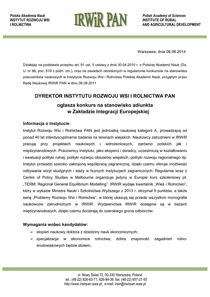 Polska Akademia Nauk INSTYTUT ROZWOJU WSI I ROLNICTWA Polish Academy of Sciences INSTITUTE OF RURAL AND AGRICULTURAL DEVELOPMENT Warszawa, dnia 06.06.2014 Działając na podstawie przepisu art. 91 ust. 5 ustawy z dnia 30.04.2010 r. o Polskiej Akademii Nauk (Dz. U. nr 96, poz. 619 z późn. zm.), oraz na zasadach określonych w regulaminie konkursów na stanowiska pracowników naukowych w Instytucie Rozwoju Wsi i Rolnictwa Polskiej Akademii Nauk, przyjętym przez Radę Naukową IRWiR PAN w dniu 06.09.2011 DYREKTOR INSTYTUTU ROZWOJU WSI I ROLNICTWA PAN ogłasza konkurs na stanowisko adiunkta w Zakładzie Integracji Europejskiej Informacja o Instytucie: Instytut Rozwoju Wsi i Rolnictwa PAN jest jednostką naukową kategorii A, prowadzącą od ponad 40 lat interdyscyplinarne badania na terenach wiejskich. Naukowcy zatrudnieni w IRWiR pracują przy projektach naukowych i wdroŜeniowych, zarówno polskich jak i międzynarodowych. Pracownicy Instytutu, jako eksperci i doradcy, uczestniczą w kształtowaniu i ewaluacji polityki rolnej, polityki rozwoju obszarów wiejskich, polityki rozwoju regionalnego itp. Instytut prowadzi szeroko zakrojoną współpracę zagraniczną, dzięki czemu oferuje moŜliwość odbywania wizyt studyjnych i staŜy w licznych instytucjach zagranicznych. Regularnie wraz z Centre of Policy Studies w Melbourne organizuje jedyny w Europie kurs szkoleniowy pt. „TERM: Regional General Equilibrium Modelling”. IRWiR wydaje kwartalnik „Wieś i Rolnictwo”, który w wykazie Ministra Nauki i Szkolnictwa WyŜszego z 2013 r. otrzymał 9 punktów, a takŜe serię „Problemy Rozwoju Wsi i Rolnictwa”, w której ukazują się przede wszystkim monografie naukowców zatrudnionych w IRWiR. Wydawnictwa IRWiR dostępne są w bazach międzynarodowych, dzięki czemu docierają do szerokiego grona odbiorców. Wymagania wobec kandydatów: • stopień naukowy doktora z dziedziny nauk ekonomicznych; • specjalizacja w ekonomice rolnictwa; dobra znajomość środowiskowych będzie atutem; ul. Nowy Świat 72, 00-330 Warszawa, Poland tel.: (48-22) 826-63-71; 826-94-36; fax: (48-22) 657-27-50 http://www.irwirpan.waw.pl; e-mail: [email protected] zagadnień rolno- • umiejętność obsługi zaawansowanych opcji programu Excel i Word oraz dobra znajomość SPSS lub innego programu do analizy danych statystycznych, duŜym atutem będzie znajomość GEMPACKa i/lub GAMSa; • udział w projektach krajowych i/lub zagranicznych, dobrze widziane doświadczenie w kierowaniu grantem; • umiejętność prezentowania wyników badań; • bardzo dobra znajomość języka angielskiego w mowie i piśmie; • cechy osobowe: chęć pogłębienia wiedzy z zakresu metod ilościowych (w kierunku modelowania General Equilibrium Models i Partial Equilibrium Models), wychodzenie z inicjatywą, pracowitość, lojalność. Zgłoszenie do konkursu winno zawierać: o list motywacyjny (maksymalnie jedna strona A4); o Ŝyciorys naukowy z wyszczególnieniem działalności naukowej, dydaktycznej i organizacyjnej wraz z wykazem publikacji; o odpis dyplomu ukończenia studiów i dyplomu doktorskiego; o kopie waŜniejszych publikacji; o inne dokumenty potwierdzające doświadczenie zawodowe i posiadane kompetencje; o oświadczenie, Ŝe w wypadku zatrudnienia, IRWiR PAN będzie podstawowym miejscem pracy Kandydata. Informacje o zatrudnieniu: Osoba wyłoniona w drodze konkursu będzie zatrudniona na czas określony w pełnym wymiarze czasu pracy. Istnieje moŜliwość przedłuŜenia zatrudnienia w formie umowy na czas nieokreślony. Miejsce pracy: Pałac Staszica, ul. Nowy Świat 72, Warszawa. Osoba wyłoniona w konkursie będzie pracować przy bazach danych, modelowaniu zjawisk rolno-środowiskowych i ewaluacji polityk unijnych. Oczekuje się, Ŝe pracując na stanowisku adiunkta w Zakładzie Integracji Europejskiej, osoba wyłoniona w konkursie nabędzie umiejętności prowadzenia własnych projektów badawczych i przygotuje rozprawę habilitacyjną. Dokumenty naleŜy składać drogą elektroniczną na adres [email protected] do dnia 31.07.2014 Rozstrzygnięcie konkursu nastąpi do dnia 15.09.2014 Planowany termin zatrudnienia: 01.10. 2014 Osoba udzielająca informacji: Ewa [email protected] 2 Aniołkowska, tel. (22) 826-75-94,