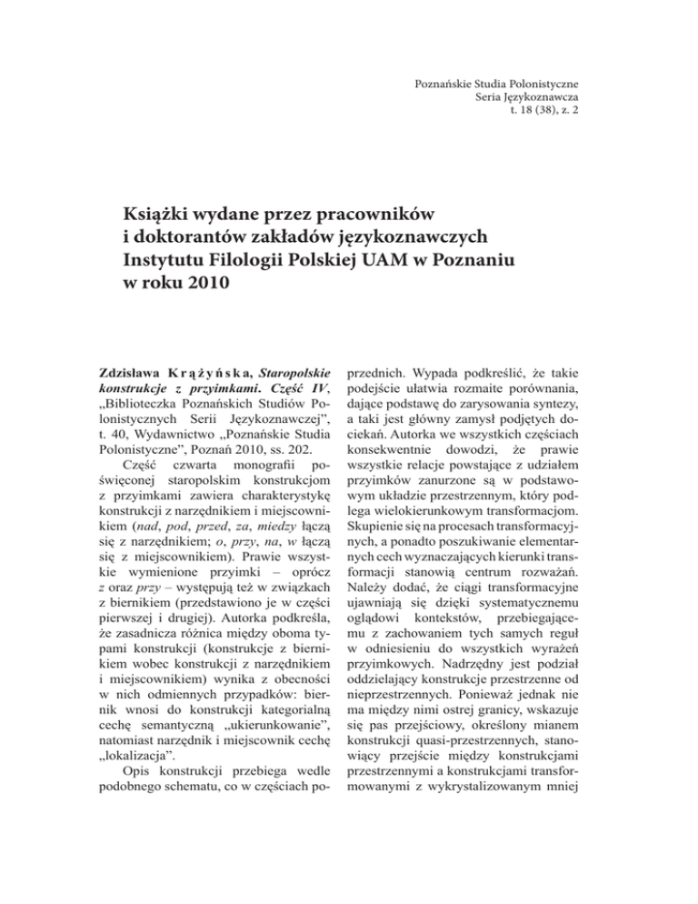 Poznańskie Studia Polonistyczne Seria Językoznawcza t. 18 (38), z. 2 Książki wydane przez pracowników i doktorantów zakładów językoznawczych Instytutu Filologii Polskiej UAM w Poznaniu w roku 2010 Zdzisława K r ą ż y ń s k a, Staropolskie konstrukcje z przyimkami. Część IV, „Biblioteczka Poznańskich Studiów Polonistycznych Serii Językoznawczej”, t. 40, Wydawnictwo „Poznańskie Studia Polonistyczne”, Poznań 2010, ss. 202. Część czwarta monografii poświęconej staropolskim konstrukcjom z przyimkami zawiera charakterystykę konstrukcji z narzędnikiem i miejscownikiem (nad, pod, przed, za, miedzy łączą się z narzędnikiem; o, przy, na, w łączą się z miejscownikiem). Prawie wszystkie wymienione przyimki – oprócz z oraz przy – występują też w związkach z biernikiem (przedstawiono je w części pierwszej i drugiej). Autorka podkreśla, że zasadnicza różnica między oboma typami konstrukcji (konstrukcje z biernikiem wobec konstrukcji z narzędnikiem i miejscownikiem) wynika z obecności w nich odmiennych przypadków: biernik wnosi do konstrukcji kategorialną cechę semantyczną „ukierunkowanie”, natomiast narzędnik i miejscownik cechę „lokalizacja”. Opis konstrukcji przebiega wedle podobnego schematu, co w częściach po- przednich. Wypada podkreślić, że takie podejście ułatwia rozmaite porównania, dające podstawę do zarysowania syntezy, a taki jest główny zamysł podjętych dociekań. Autorka we wszystkich częściach konsekwentnie dowodzi, że prawie wszystkie relacje powstające z udziałem przyimków zanurzone są w podstawowym układzie przestrzennym, który podlega wielokierunkowym transformacjom. Skupienie się na procesach transformacyjnych, a ponadto poszukiwanie elementarnych cech wyznaczających kierunki transformacji stanowią centrum rozważań. Należy dodać, że ciągi transformacyjne ujawniają się dzięki systematycznemu oglądowi kontekstów, przebiegającemu z zachowaniem tych samych reguł w odniesieniu do wszystkich wyrażeń przyimkowych. Nadrzędny jest podział oddzielający konstrukcje przestrzenne od nieprzestrzennych. Ponieważ jednak nie ma między nimi ostrej granicy, wskazuje się pas przejściowy, określony mianem konstrukcji quasi-przestrzennych, stanowiący przejście między konstrukcjami przestrzennymi a konstrukcjami transformowanymi z wykrystalizowanym mniej 168 lub bardziej wyraziście kategorialnym znaczeniem (np. dla konstrukcji z przyimkiem z w połączeniu z narzędnikiem transformacji podlega cecha nieprzestrzenna „coś razem z czymś innym”, stanowiąca podstawę dla transformowanych znaczeń, np. 1) równorzędność obiektów implikowana przez predykat, np. rozłączyć lenistwo z nieszczęściem, 2) współuczestnictwo w akcji drugiej osobowej strony, np. rozdzielić oćczyznę z kim, 3) w wyrażeniu przyimkowym element towarzyszący akcji, np. iść na czyj dom z ostrą bronią). Zacieranie się kategorialnej semantyki to kolejne przekształcenie, jakiemu podlegają konstrukcje z wyrażeniami przyimkowymi. Odsemantyzowanie konstrukcji prowadzi – z jednej strony – do wyłaniania się konstrukcji typu dopełnieniowego, nazwanych w pracy quasi-przedmiotowymi (pytać, co by się działo z synem), z drugiej – do powstawania nowych jednostek leksykalnych współfunkcyjnych z przysłówkami (na krótce ‘krótko, zwięźle’). Oczekujemy z zainteresowaniem podsumowania badań (część piąta), które – wedle informacji autorki – jest gotowe do druku. Agnieszka K u l a, Cechy stylowe publicystyki ekonomicznej na materiale „Polityki” z lat 1957–2004, Wydawnictwo Poznańskie, Poznań 2010, ss. 326. Książka sytuuje się w nurcie badań nad przekazami medialnymi, a jej celem jest nakreślenie – przy użyciu narzędzi stylistycznych i pragmalingwistycznych – prymarnych cech stylowych, decydujących o kształcie badanych teks tów. Teoria cech stylowych pozwala na funkcjonalne, a nie strukturalne, hierarchiczne podejście do analiz tekstowych, a także na rozpoznanie wszystkich istotnych elementów sytuacji komunikacyjnej Varia i ich wpływu na konfigurację cech stylowych – tym samym wybrane narzędzia okazują się przydatne i skuteczne w analizach medioznawczych. Do badań materiałowych posłużyły teksty z tygodnia „Polityka”, losowo wybrane z każdego miesiąca lat 1957–2004. Uzyskano w ten sposób korpus 645 teks tów publicystycznych. Wskazany przedział czasowy umożliwia zarówno analizę zjawisk w najnowszej publicystyce, jak i porównanie sposobów przedstawiania problematyki ekonomicznej w państwie niedemokratycznym oraz w demokracji, a tym samym pozwala na analizę zmian stylu. Oglądowi poddano teksty, które redakcja tygodnika uznała za artykuły o tematyce gospodarczej i umieściła w dziale „Gospodarka” (nowa formuła pisma od 1994 roku) lub które oznaczyła jako teks ty publicystyki ekonomicznej w dołączonym do rocznika spisie treści. Ponadto od momentu, w którym raporty zostają wyodrębnione z działów tematycznych, dołącza się je do badanego materiału na podstawie analiz słownikowych pojęcia „gospodarka”. W książce można wskazać dwie zasadnicze części. Pierwsza poświęcona jest oglądowi kwestii teoretycznych, skupionych wokół teorii cech stylowych (rozdział pierwszy) oraz wokół zagadnienia kontekstu (rozdział drugi). Rozdział pierwszy traktuje o zjawiskach związanych z rozumieniem stylu, wyboru stylistycznego, cechy stylowej. Przedstawia różne sposoby hierarchizacji cech stylowych, wyznaczników tych cech oraz związku teorii cech stylowych z kategorią stosowności i zagadnieniem dobrego stylu. Autorka zwraca uwagę na problem obiektywności cechy stylowej oraz na łańcuchowy charakter teorii cech stylowych. W rozdziale drugim odnaleźć można omówienie roli czynników poza- Varia językowych, charakterystykę kontekstu, naświetlenie roli nadawcy i odbiorcy w systemie gospodarki cent