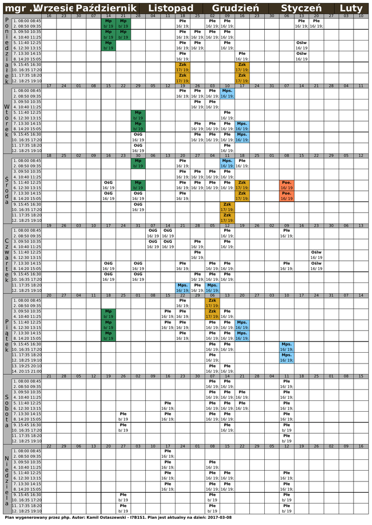 mgr ... Wrzesień Październik 16 P o n i e d z i a ł e k 1. 08:00 08:45 2. 08:50 09:35 3. 09:50 10:35 4. 10:40 11:25 5. 11:40 12:25 6. 12:30 13:15 7. 13:30 14:15 8. 14:20 15:05 9. 15:45 16:30 10. 16:35 17:20 11. 17:35 18:20 12. 18:25 19:10 W t o r e k 1. 08:00 08:45 2. 08:50 09:35 3. 09:50 10:35 4. 10:40 11:25 5. 11:40 12:25 6. 12:30 13:15 7. 13:30 14:15 8. 14:20 15:05 9. 15:45 16:30 10. 16:35 17:20 11. 17:35 18:20 12. 18:25 19:10 Ś r o d a 1. 08:00 08:45 2. 08:50 09:35 3. 09:50 10:35 4. 10:40 11:25 5. 11:40 12:25 6. 12:30 13:15 7. 13:30 14:15 8. 14:20 15:05 9. 15:45 16:30 10. 16:35 17:20 11. 17:35 18:20 12. 18:25 19:10 C z w a r t e k 1. 08:00 08:45 2. 08:50 09:35 3. 09:50 10:35 4. 10:40 11:25 5. 11:40 12:25 6. 12:30 13:15 7. 13:30 14:15 8. 14:20 15:05 9. 15:45 16:30 10. 16:35 17:20 11. 17:35 18:20 12. 18:25 19:10 P i ą t e k 1. 08:00 08:45 2. 08:50 09:35 3. 09:50 10:35 4. 10:40 11:25 5. 11:40 12:25 6. 12:30 13:15 7. 13:30 14:15 8. 14:20 15:05 9. 15:45 16:30 10. 16:35 17:20 11. 17:35 18:20 12. 18:25 19:10 13. 19:25 20:10 14. 20:15 21:00 17 18 N i e d z i e l a 02 08 09 14 Mp b/ 19 Mp b/ 19 Mp b/ 19 15 16 21 Mp b/ 19 Mp b/ 19 22 23 26 03 10 17 27 04 11 18 28 29 Mp b/ 19 Mp b/ 19 OśG 16/ 19 OśG 16/ 19 30 Mp b/ 19 Listopad 04 05 28 05 12 19 06 29 06 13 20 12 13 Mp b/ 19 OśG 16/ 19 OśG 16/ 19 24 31 07 14 OśG OśG 16/ 19 16/ 19 OśG OśG 16/ 19 16/ 19 OśG 16/ 19 OśG 16/ 19 25 01 26 27 Płe b/ 19 Płe b/ 19 Grudzień 18 25 02 Płe Płe 16/ 19; 16/ 19; Płe Płe Płe 16/ 19; 16/ 19; 16/ 19; Płe Płe 16/ 19; 16/ 19; Płe 16/ 19; Zzk 17/ 19; Zzk 17/ 19; 19 26 03 Płe Płe Płe 16/ 19; 16/ 19; 16/ 19; Płe Płe 16/ 19; 16/ 19; 20 27 04 Płe 16/ 19; Płe Płe Płe 16/ 19; 16/ 19; 16/ 19; Płe Płe Płe 16/ 19; 16/ 19; 16/ 19; Płe 16/ 19; 21 28 05 Płe 16/ 19; Płe 16/ 19; Płe 16/ 19; 08 02 09 03 10 Płe b/ 19 Płe b/ 19 22 11 Płe Płe 16/ 19; 16/ 19; Płe Płe 16/ 19; 16/ 19; Mp b/ 19 Mp b/ 19 Mp b/ 19 21 1. 08:00 08:45 2. 08:50 09:35 3. 09:50 10:35 4. 10:40 11:25 5. 11:40 12:25 6. 12:30 13:15 7. 13:30 14:15 8. 14:20 15:05 9. 15:45 16:30 10. 16:35 17:20 11. 17:35 18:20 12. 18:25 19:10 25 01 07 OśG 16/ 19 OśG 16/ 19 20 S o b o t a 24 30 OśG 16/ 19 OśG 16/ 19 19 1. 08:00 08:45 2. 08:50 09:35 3. 09:50 10:35 4. 10:40 11:25 5. 11:40 12:25 6. 12:30 13:15 7. 13:30 14:15 8. 14:20 15:05 9. 15:45 16:30 10. 16:35 17:20 11. 17:35 18:20 12. 18:25 19:10 23 Płe 16/ 19; Płe Płe 16/ 19; 16/ 19; Mps. Płe Mps. 16/ 19; 16/ 19; 16/ 19; 15 22 29 06 Płe Zzk 16/ 19; 17/ 19; Płe Płe Zzk 16/ 19; 16/ 19; 17/ 19; Płe Płe Płe 16/ 19; 16/ 19; 16/ 19; Płe Płe 16/ 19; 16/ 19; Płe 16/ 19; Płe 16/ 19; Płe 16/ 19; 16 23 30 07 Płe 16/ 19; Płe 16/ 19; Płe Płe 16/ 19; 16/ 19; Płe Płe 16/ 19; 16/ 19; 17 Płe 16/ 19; Płe 16/ 19; Płe 16/ 19; Płe 16/ 19; 24 01 08 09 Płe 16/ 19; Płe 16/ 19; Płe 16/ 19; 10 Mps. 16/ 19; Płe 16/ 19; Płe 16/ 19; Płe 16/ 19; Płe 16/ 19; 11 Mps. 16/ 19; Płe 16/ 19; Płe 16/ 19; Zzk 17/ 19; Zzk 17/ 19; 12 Płe 16/ 19; Płe 16/ 19; 16 Płe 16/ 19; Zzk 17/ 19; Zzk 17/ 19; 17 23 Styczeń 30 18 Płe 16/ 19; 03 10 24 31 07 14 21 28 04 11 25 01 08 15 22 29 05 12 16 23 30 06 13 Zzk 17/ 19; Zzk 17/ 19; 19 Poe. 16/ 19 Poe. 16/ 19 26 02 09 Płe 16/ 19; Oślw 16/ 19 Oślw 16/ 19 Płe 16/ 19; 20 Płe 16/ 19; Płe 16/ 19; Płe 16/ 19; Płe 16/ 19; Mps. 16/ 19; Mps. 16/ 19; 27 03 10 17 24 31 07 14 18 25 01 08 15 19 26 02 09 16 Mps. 16/ 19; Mps. 16/ 19; Płe 16/ 19; 14 21 Płe 16/ 19; Płe Płe 16/ 19; 16/ 19; Płe Płe 16/ 19; 16/ 19; Płe 16/ 19; Płe 16/ 19; Plan wygenerowany przez php. Autor: Kamil Ostaszewski - I7B1S1. Plan jest aktualny na dzień: 2017-03-08 Luty 27 Mps. 16/ 19; Mps. 16/ 19; 13 Płe 16/ 19; Płe Płe 16/ 19; 16/ 19; Płe Płe 16/ 19; 16/ 19; Płe b/ 19 Płe b/ 19 13 20 Płe Płe 16/ 19; 16/ 19; Oślw 16/ 19 Oślw 16/ 19 Płe 16/ 19; Płe 16/ 19; 15 06 22 28 04 29 05 11 Płe 16/ 19; Płe 16/ 19; Płe 16/ 19; Płe 16/ 19; Płe b/ 19 Płe b/ 19 12 Płe 16/ 19; Płe 16/ 19; Płe b/ 19 Płe b/ 19