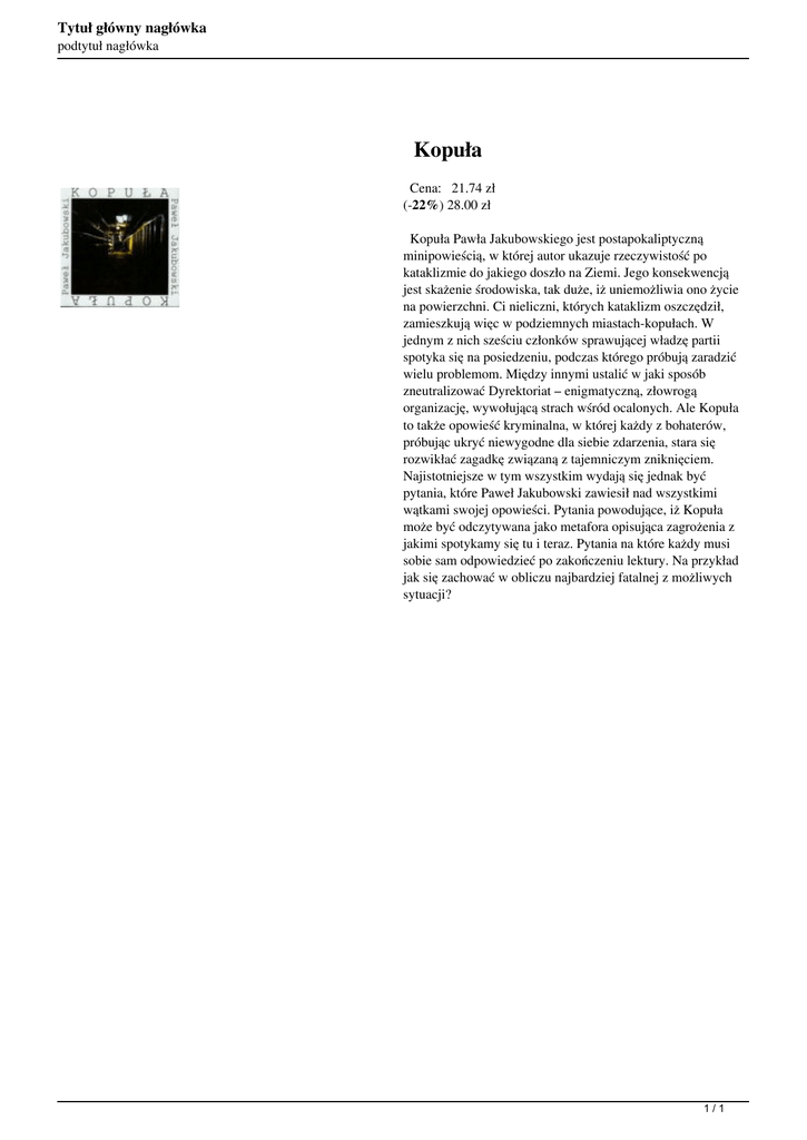 Tytuł główny nagłówka podtytuł nagłówka Kopuła Cena: 21.74 zł (-22%) 28.00 zł Kopuła Pawła Jakubowskiego jest postapokaliptyczną minipowieścią, w której autor ukazuje rzeczywistość po kataklizmie do jakiego doszło na Ziemi. Jego konsekwencją jest skażenie środowiska, tak duże, iż uniemożliwia ono życie na powierzchni. Ci nieliczni, których kataklizm oszczędził, zamieszkują więc w podziemnych miastach-kopułach. W jednym z nich sześciu członków sprawującej władzę partii spotyka się na posiedzeniu, podczas którego próbują zaradzić wielu problemom. Między innymi ustalić w jaki sposób zneutralizować Dyrektoriat – enigmatyczną, złowrogą organizację, wywołującą strach wśród ocalonych. Ale Kopuła to także opowieść kryminalna, w której każdy z bohaterów, próbując ukryć niewygodne dla siebie zdarzenia, stara się rozwikłać zagadkę związaną z tajemniczym zniknięciem. Najistotniejsze w tym wszystkim wydają się jednak być pytania, które Paweł Jakubowski zawiesił nad wszystkimi wątkami swojej opowieści. Pytania powodujące, iż Kopuła może być odczytywana jako metafora opisująca zagrożenia z jakimi spotykamy się tu i teraz. Pytania na które każdy musi sobie sam odpowiedzieć po zakończeniu lektury. Na przykład jak się zachować w obliczu najbardziej fatalnej z możliwych sytuacji? 1/1 Powered by TCPDF (www.tcpdf.org)