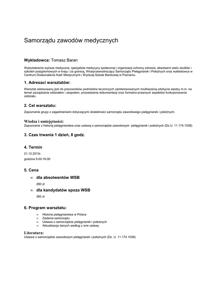 Samorządu zawodów medycznych Wykładowca: Tomasz Baran Wykształcenie wyŜsze medyczne, specjalista medycyny społecznej i organizacji ochrony zdrowia, absolwent wielu studiów i szkoleń podyplomowych w kraju i za granicą, Wiceprzewodniczący Samorządu Pielęgniarek i PołoŜnych oraz wykładowca w Centrum Doskonalenia Kadr Medycznych i WyŜszej Szkole Bankowej w Poznaniu. 1. Adresaci warsztatów: Warsztat adresowany jest do pracowników podmiotów leczniczych zainteresowanych moŜliwością zdobycia wiedzy m.in. na temat zarządzania oddziałem i zespołem, prowadzenia dokumentacji oraz formalno-prawnych aspektów funkcjonowania oddziału. 2. Cel warsztatu: Zapoznanie grupy z zagadnieniami dotyczącymi działalności samorządu zawodowego pielęgniarek i połoŜnych. Wiedza i umiejętności: Zapoznanie z historią pielęgniarstwa oraz ustawą o samorządzie zawodowym pielęgniarek i połoŜnych (Dz.U. 11.174.1038) 3. Czas trwania 1 dzień, 8 godz. 4. Termin 21.12.2013r. godzina 9.00-16.00 5. Cena • dla absolwentów WSB 280 zł • dla kandydatów spoza WSB 360 zł 6. Program warsztatu: • • • • Historia pielęgniarstwa w Polsce Zadania samorządu Ustawa o samorządzie pielęgniarek i połoŜnych Aktualizacja danych według z w/w ustawy Literatura: Ustawa o samorządzie zawodowym pielęgniarek i połoŜnych (Dz. U. 11.174.1038)