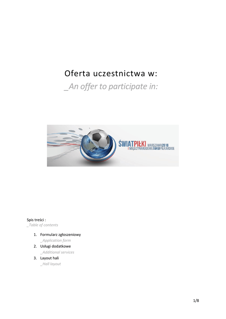 Oferta uczestnictwa w: _An offer to participate in: Spis treści : _Table of contents 1. Formularz zgłoszeniowy _Application form 2. Usługi dodatkowe _Additional services 3. Layout hali _Hall layout 1/8 Data/ Date: Zgłoszenie uczestnictwa: _Participation Application: Dane do faktury / _Invoicing details Pełna nazwa firmy/ Full company name: NIP/ VAT number: Ulica/ Street: Kod pocztowy/ Postal code: KRS lub CEIDG/ Company Registration Number: Kraj/ Country: Telefon/ Telephone: Miasto/ City: Adres korespondencyjny (jeśli inny)/Correspondence address (if not as above): E- mail/ E-mail: Właściciel lub prezes firmy (imię, nazwisko, stanowisko)/ Owner or company president (name, surname, position): Osoba kontaktowa (telefon komórkowy, e- mail)/ Contact person (mobile, e-mail): Zamawiam stoisko numer/ _I order stand number …………………………………………………… *zamówienia wyposażenia i usług dodatkowych – zgodnie z załącznikami/ _*ordering of equipment and additional services – as per attachments Rodzaj powierzchni/ _Type of surface Powierzchnia niezabudowana _Undeveloped area Powierzchnia zabudowana bez wyposażenia _Developed area without equipment Stoisko narożne _Corner stand Zamawiam _My choice Wielkość stoiska (m2) _Stand size Cena netto _Net price Suma / _Total 90 EUR/m2 120 EUR/m2 + 10% 120 EUR (Netto / _Net) Opłata rejestracyjna / _Registration fee RAZEM (NETTO)/ _Total (Net) Uwagi do stoiska/_Additional information or needs: Podpisując niniejsze Zgłoszenie Uczestnictwa, akceptujemy jako obowiązujące nas Warunki Uczestnictwa oraz Regulamin Targów i potwierdzamy uczestnictwo w Targach World Świat Piłki 2017. / By signing this Application Form, we accept as binding the Conditions of Participation and the Regulations of the Fair and we confirm participation in the World Football Expo 2017 Fairs. Podpisanie i przesłanie wypełnionego formularza jest równoznaczne z zawarciem umowy o uczestnictwo w targach. / Signing and sending the completed form is equivalent to concluding an agreement of participation in the fairs Zgodnie z Ustawą z dnia 18.07.2002r. o świadczeniu usług drogą elektroniczną (Dz. U. z 2002r. Nr 144, poz. 1204 ze zm. ) . Wyrażam zgodę na otrzymywanie na wyżej wymienione adresy środków komunikacji elektronicznej informacji handlowych Event Masters Sp. z o.o. / In accordance with the Act dated 18.07.2002r. on the provision of services by electronic means (Journal of Laws from 2002. No. 144, pos. 1204, as amended). I agree to receive business information regarding Event Masters Sp. Z o.o. to the above mentioned addresses of electronic communication. Podpis i pieczątka Wystawcy/ Exhibitor’s signature and stamp 2/8 IDENTYFIKATORY (KARTY WYSTAWCY) / _IDENTIFICATION CARDS (EXHIBITOR’S CARDS) Dane do faktury / _Invoicing details Pełna nazwa firmy/ Full company name: NIP/ VAT number : Ulica/ Street: Kod pocztowy/ Post code: Miasto/ City: Kraj/ Country: Telefon/ Telephone: Fax: Osoba kontaktowa (telefon komórkowy, e- mail)/Contact person (mobile, e-mail): E- mail: Zgłoszenie osób do obsługi stoiska (stan na dzień ……………………………….)/ _Registry of Exhibitor’s Personnel (current as of ……….…………………..………) Lp./ _No. 1. Nazwisko i imię / _Name and surname Stanowisko / _Position 2. 3. 4. 5. 6. 7. 8. 9. 10. Podpis Wystawcy / _Exhibitor’s signature 1. 2. 3. Do wejścia na teren targów w okresie ich trwania upoważniają karty WYSTAWCY. _Entry onto the Fairgrounds throughout their duration upon presentation of EXHIBITOR’S identification cards. W czasie montażu i demontażu stoiska do wstępu na teren targów upoważniają karty identyfikacyjne MONTAŻ/DEMONTAŻ. _During construction and dismantling of stands entry onto the Fairgrounds upon presentation of SERVICE identification cards CONSTRUCTION/DISMANTLING. Do wjazdu na teren targowy w czasie trwania targów upoważnia karta parkingowa. Każdy wystawca otrzymuje określoną ilość kart parkingowych w zależności od powierzchni stoiska. Dodatkowe karty parkingowe Wystawca nabywa odpłatnie. _Vehicle entry onto the Fairgrounds during the event upon presentation of a car park card. Each exhibitor receives a certain number of car park cards depending on the size of their stand. Extra cards may be purchased. 3/8 ZAŁĄCZNIK 1 – WYPOSAŻENIE DODATKOWE/ _ATTACHMENT 1 – ADDITIONAL EQUIPMENT Dane do faktury / _Invoicing details Pełna nazwa firmy/ Full company name: NIP/ VAT number : Ulica/ Street: Kod pocztowy/ Post code: Miasto/ City: Kraj/ Country: Telefon/ Telephone: Fax: Osoba kontaktowa (telefon komórkowy, e- mail)/Contact person (mobile, e-mail): E- mail: Zamówienie wyposażenia dodatkowego dostępnego w katalogu informacyjnym: _Ordering additional equipment available in the information catalogue: Rodzaj / _Type Ilość / _Quantity Cena / _Price Krzesło nr. kat. W-04 / _Chair 1 szt./pcs 3,00 EUR Stół kwadrat nr kat. W-01 / _Square table 1 szt./psc 12,00 EUR Stolik koktajlowy W-02 / _Coctail table 1 szt./psc 22,00 EUR Stolik kawowy nr kat. W-03B/03 / _Coffee table 1 szt./psc 9,00 EUR Kosz na śmieci nr kat. W-05 / _Trash can 1 szt./psc 3,00 EUR Wolnostojące zaplecze nr kat. W-06 / _Free-standing storage room 1 szt./psc 70,00 EUR Wykładzina nr kat. W-07,07B,07C,07D / _Carpet 1 m2 5,00 EUR Uchwyt do montażu TV nr kat. W-08 / _TV holder 1 m2 12,00 EUR/m2 Lustro stojące nr kat. W-09 / _Standing mirror 1 szt./psc 12,00 EUR Manekin damski nr kat. W-10 / _Female mannequin 1 szt./psc 22,00 EUR Manekin damki-tors nr kat. W-11 / _Female mannequin-torso 1 szt./psc 9,00 EUR Punkt świetlny typu scena nr kat. W-12/ _Lighting point 1 szt./psc 9,00 EUR Karta parkingowa / _Car park card 1 szt./psc 45,00 EUR Karta wystawcy – dodatkowa / _Additional exhibitor’s card 1 szt./psc 5,00 EUR 22,00 EUR/m2 Zabudowa dodatkowa / _Extra walls 1 moduł - płyta 115 cm/ _module – 115cm board Zamawiam/_Order SUMA / _TOTAL Podpis W