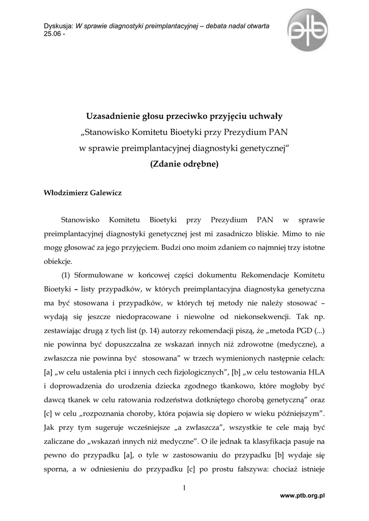 Dyskusja: W sprawie diagnostyki preimplantacyjnej – debata nadal otwarta 25.06 - Uzasadnienie głosu przeciwko przyjęciu uchwały „Stanowisko Komitetu Bioetyki przy Prezydium PAN w sprawie preimplantacyjnej diagnostyki genetycznej“ (Zdanie odrębne) Włodzimierz Galewicz Stanowisko Komitetu Bioetyki przy Prezydium PAN w sprawie preimplantacyjnej diagnostyki genetycznej jest mi zasadniczo bliskie. Mimo to nie mogę głosować za jego przyjęciem. Budzi ono moim zdaniem co najmniej trzy istotne obiekcje. (1) Sformułowane w końcowej części dokumentu Rekomendacje Komitetu Bioetyki – listy przypadków, w których preimplantacyjna diagnostyka genetyczna ma być stosowana i przypadków, w których tej metody nie należy stosować – wydają się jeszcze niedopracowane i niewolne od niekonsekwencji. Tak np. zestawiając drugą z tych list (p. 14) autorzy rekomendacji piszą, że „metoda PGD (...) nie powinna być dopuszczalna ze wskazań innych niż zdrowotne (medyczne), a zwłaszcza nie powinna być stosowana” w trzech wymienionych następnie celach: [a] „w celu ustalenia płci i innych cech fizjologicznych”, [b] „w celu testowania HLA i doprowadzenia do urodzenia dziecka zgodnego tkankowo, które mogłoby być dawcą tkanek w celu ratowania rodzeństwa dotkniętego chorobą genetyczną” oraz [c] w celu „rozpoznania choroby, która pojawia się dopiero w wieku późniejszym”. Jak przy tym sugeruje wcześniejsze „a zwłaszcza”, wszystkie te cele mają być zaliczane do „wskazań innych niż medyczne”. O ile jednak ta klasyfikacja pasuje na pewno do przypadku [a], o tyle w zastosowaniu do przypadku [b] wydaje się sporna, a w odniesieniu do przypadku [c] po prostu fałszywa: chociaż istnieje 1 www.ptb.org.pl Dyskusja: W sprawie diagnostyki preimplantacyjnej – debata nadal otwarta 25.06 - pewnie jakiś ważny powód, aby nie używać procedury PGD np. dla rozpoznania pląsawicy Huntingtona, to przecież tym powodem raczej nie jest to, że czyniąc z niej taki użytek stosuje się ją ze wskazań innych niż zdrowotne. Chyba, że owych „wskazań zdrowotnych” nie utożsamia się tutaj z powodami związanymi z chorobą i zdrowiem, lecz rozumie się je w jakimś innym, normatywnie zacieśnionym znaczeniu. Ale wtedy z kolei jest kwestią otwartą, czy w tych przypadkach, w których preimplantacyjna diagnostyka genetyczna ma być dopuszczalna (p. 13), będzie ona istotnie stosowana z owych ciaśniejszych „wskazań medycznych”. Niekonsekwencją jest również to, że stosowanie preimplantacyjnej diagnozy genetycznej akceptuje się „u kobiet chcących uniknąć kolejnego przerwania ciąży, u których uprzednio dokonano przerwania ciąży w związku z nieprawidłowym wynikiem badania prenatalnego” – a więc np. z zespołem Downa, wykrytym u płodu – ale już nie u kobiet, które nie mają takiej aborcyjnej przeszłości, lecz obawiają się „nieprawidłowego wyniku badania prenatalnego”, choćby ze względu na starszy wiek; te ostatnie mają być w osobliwy sposób dyskryminowane, tak jakby na uchronienie się od ryzyka późniejszej aborcji trzeba sobie było dopiero zasłużyć, przechodząc ją wcześniej! (2) We wcześniejszej części dokumentu natrafiamy na cenne stwierdzenie: „Wyrażając stanowisko w sprawie preimplantacyjnej diagnostyki genetycznej, Komitet Bioetyki powinien więc kierować się zasadą szacunku dla pluralizmu wartości i światopoglądów, która stanowi fundament każdego prawdziwie demokratycznego i liberalnego państwa”. Trudno temu nie przyklasnąć: istotnie, Komitet Bioetyki powinien we wszystkich swoich oświadczeniach kierować się taką etyczną zasadą. Można jednakże żywić wątpliwości, czy rzeczywiście się nią kieruje, przynajmniej w tym dokumencie. W punkcie 12 czytamy, że preimplantacyjna diagnostyka genetyczna posiada cztery przemawiające na jej korzyść cechy: [1] „pozwala znacząco ograniczyć liczbę prawnie dopuszczalnych zabiegów przerwania ciąży wykonywanych w następstwie konwencjonalnej diagnozy prenatalnej”, [2] „daje szanse na urodzenie zdrowego dziecka parom obciążonym genetycznie”, [3] „zwiększa skuteczność i bezpieczeństwo oraz zmniejsza uciążliwość procedury zapłodnienia pozaustrojowego”, a wreszcie [4] powinna zostać dopuszczona ze 2 www.ptb.org.pl Dyskusja: W sprawie diagnostyki preimplantacyjnej – debata nadal otwarta 25.06 - względu na spójność prawa, „w sytuacji istnienia prawnej akceptacji dla [konwencjonalnej] diagnostyki prenatalnej”. Wymienione cechy metody PGD charakteryzuje się przy tym jako „dobre racje moralne na rzecz jej akceptacji”. Nie dopowiada się jednak, że wszystkie te racje są co prawda dobre, ale jedynie dla tych, którzy zajmują określone stanowisko w kwestii statusu ludzkiego embrionu, lub też przynajmniej nie wyznają jednego z możliwych w tej sprawie stanowisk – poglądu, zgodnie z którym wczesny ludzki zarodek jest już pełnoprawną osobą. Dla zwolenników tego embriologicznego personalizmu przytoczone „dobre racje” nie będą tak dobre. W imię „szacunku dla pluralizmu wartości i światopoglądów” wypadałoby to chyba wyraźnie zaznaczyć. (3) Trzeba wreszcie zauważyć, że jeśli wymienione „dobre racje moralne” na rzecz akceptacji PGD mają pewien walor niezależny od światopoglądu, to co najwyżej jako racje przemawiające przeciwko delegalizacji tej metody. Tymczasem autorzy „Stanowiska” nie ograniczają się do tego, że PGD nie powinna być prawnie zakazywana; na koniec swoich rekomendacji wspaniałomyślnie dodają, że powinna ona być także „świadczeniem refundowanym przez NFZ”. O tym wszakże, czy jakieś świadczenie medyczne – zwłaszcza tak sporne jak PGD – zgodnie z wymogami społecznej sprawiedliwości powinno czy też nie powinno być refundowane, trzeba by się chyba upewnić przez jakąś kompleksową analizę etyczną i ekonomiczną. Obawiam si