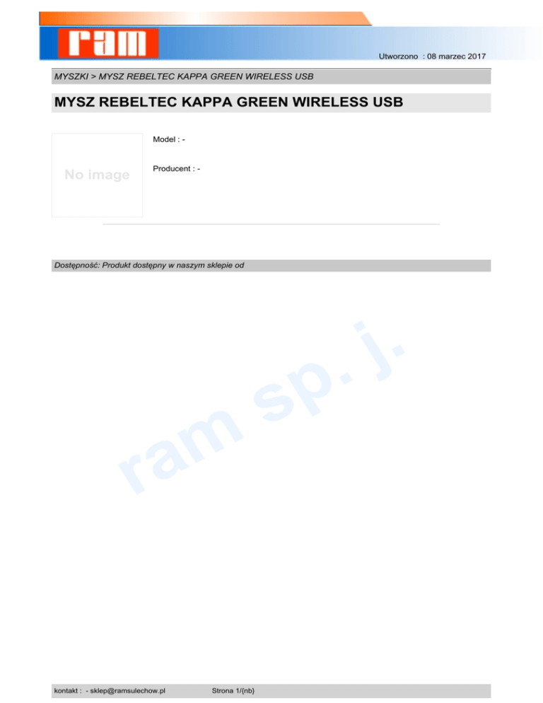 Utworzono : 08 marzec 2017 MYSZKI > MYSZ REBELTEC KAPPA GREEN WIRELESS USB MYSZ REBELTEC KAPPA GREEN WIRELESS USB Model : - No image Producent : - Dostępność: Produkt dostępny w naszym sklepie od . j . m a r kontakt : - [email protected] Strona 1/{nb} p s