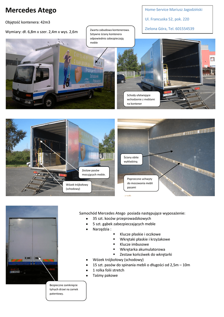 Mercedes Atego Home-Service Mariusz Jagodzioski Ul. Francuska 52, pok. 220 Objętośd kontenera: 42m3 Zwarta zabudowa kontenerowa. Sztywne ściany kontenera odpowiednio zabezpieczają meble Wymiary: dł. 6,8m x szer. 2,4m x wys. 2,6m Zielona Góra, Tel. 601554539 Schody ułatwiające wchodzenie z meblami na kontener Ściany obite wykładziną Zestaw pasów mocujących meble. Wózek trójkołowy (schodowy) Poprzeczne uchwyty do mocowania mebli pasami Samochód Mercedes Atego posiada następujące wyposażenie: 35 szt. koców przeprowadzkowych 5 szt. gąbek zabezpieczających meble Narzędzia : Klucze płaskie i oczkowe Wkrętaki płaskie i krzyżakowe Klucze imbusowe Wkrętarka akumulatorowa Zestaw koocówek do wkrętarki Wózek trójkołowy (schodowy) 15 szt. pasów do spinania mebli o długości od 2,5m – 10m 1 rolka folii stretch Taśmy pakowe Bezpieczne zamknięcie tylnych drzwi na zamek patentowy.