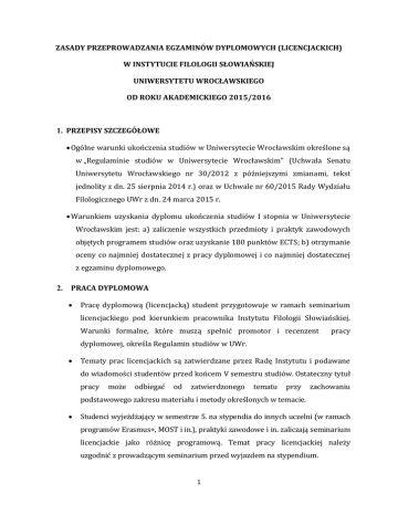 ZASADY PRZEPROWADZANIA EGZAMINÓW DYPLOMOWYCH (LICENCJACKICH) W INSTYTUCIE FILOLOGII SŁOWIAŃSKIEJ UNIWERSYTETU WROCŁAWSKIEGO OD ROKU AKADEMICKIEGO 2015/2016 1. PRZEPISY SZCZEGÓŁOWE  Ogólne warunki ukończenia studiów w Uniwersytecie Wrocławskim określone są w „Regulaminie studiów w Uniwersytecie Wrocławskim” (Uchwała Senatu Uniwersytetu Wrocławskiego nr 30/2012 z późniejszymi zmianami, tekst jednolity z dn. 25 sierpnia 2014 r.) oraz w Uchwale nr 60/2015 Rady Wydziału Filologicznego UWr z dn. 24 marca 2015 r.  Warunkiem uzyskania dyplomu ukończenia studiów I stopnia w Uniwersytecie Wrocławskim jest: a) zaliczenie wszystkich przedmioty i praktyk zawodowych objętych programem studiów oraz uzyskanie 180 punktów ECTS; b) otrzymanie oceny co najmniej dostatecznej z pracy dyplomowej i co najmniej dostatecznej z egzaminu dyplomowego. 2. PRACA DYPLOMOWA  Pracę dyplomową (licencjacką) student przygotowuje w ramach seminarium licencjackiego pod kierunkiem pracownika Instytutu Filologii Słowiańskiej. Warunki formalne, które muszą spełnić promotor i recenzent pracy dyplomowej, określa Regulamin studiów w UWr.  Tematy prac licencjackich są zatwierdzane przez Radę Instytutu i podawane do wiadomości studentów przed końcem V semestru studiów. Ostateczny tytuł pracy może odbiegać od zatwierdzonego tematu przy zachowaniu podstawowego zakresu materiału i metody określonych w temacie.  Studenci wyjeżdżający w semestrze 5. na stypendia do innych uczelni (w ramach programów Erasmus+, MOST i in.), praktyki zawodowe i in. zaliczają seminarium licencjackie jako różnicę programową. Temat pracy licencjackiej należy uzgodnić z prowadzącym seminarium przed wyjazdem na stypendium. 1  Praca musi być przygotowana z poszanowaniem zasad etyki zawodowej i uczciwości intelektualnej w badaniach naukowych, które omówione zostały m.in. w Komunikacie nr 1/2012 Dziekana Wydziału Filologicznego UWr z dnia 16 stycznia 2012 r. w sprawie warunków i zasad przygotowania pisemnych prac studenckich na Wydziale Filologicznym.  Zgodnie z wytycznymi Rady Wydziału Filologicznego UWr praca dyplomowa może być napisana w głównym języku studiowanym (czeski, rosyjski, serbski, chorwacki, ukraiński) lub w języku polskim. Szczegółowe informacje odnoszące się do objętości pracy dyplomowej i jej struktury określone są w Uchwale nr 60/2015 Rady Wydziału Filologicznego UWr z dn. 24 marca 2015 r.  Oceny pracy dyplomowej dokonują promotor i recenzent. Dopuszczenie studenta do egzaminu licencjackiego uwarunkowane jest otrzymaniem dwóch pozytywnych recenzji za pracę dyplomową. Ostateczną ocenę z pracy dyplomowej ustalają oceniający pracę promotor i recenzent. W sytuacjach spornych decyzję podejmuje przewodniczący komisji.  Przed dopuszczeniem studenta do obrony praca dyplomowa sprawdzana jest w systemie PLAGIAT. Zasady postępowania określone są w Komunikacie nr 3/2015 Dziekana Wydziału Filologicznego UWr z dn. 27 marca 2015 r.  Student ma obowiązek zapoznania się z zasadami składania i archiwizowania prac dyplomowych z wykorzystaniem systemu Archiwum Prac Dyplomowych (APD) określonych w Komunikacie nr 1/2015 Dziekana Wydziału Filologicznego UWr z dn. 20 lutego 2015 r. 3. ZASADY PRZEPROWADZANIA EGZAMINU LICENCJACKIEGO  Do egzaminu dyplomowego może przystąpić student, który a) zaliczył wszystkie przedmioty i praktyki zawodowe objęte programem studiów oraz uzyskał na studiach I stopnia 180 punktów ECTS. b) uzyskał co najmniej dwie oceny dostateczne za pracę dyplomową (pozytywne recenzje promotora i recenzenta).  Egzamin dyplomowy odbywa się przed komisją w składzie: przewodniczący – nauczyciel akademicki IFS z tytułem profesora lub ze stopniem naukowym 2 doktora habilitowanego, promotor oraz recenzent. Skład komisji licencjackiej podawany jest do wiadomości studentów najpóźniej 6 tygodni przed planowanym egzaminem.  Egzamin dyplomowy jest egzaminem ustnym, z którego sporządzany jest protokół podpisywany przez przewodniczącego i członków komisji egzaminacyjnej.  Na egzaminie student przedstawia krótki autoreferat bronionej pracy dyplomowej (prezentacja głównych tez) i odpowiada na 2 pytania, które dotyczą zakresu wybranej specjalizacji (językoznawstwo lub literaturoznawstwo).  Prezentacja pracy dyplomowej odbywa się w języku specjalności. Odpowiedzi na pytanie z zakresu historii literatury kierunkowej lub gramatyki języka kierunkowego studenci udzielają w języku specjalności, a z zakresu wstępu do literaturoznawstwa lub wstępu do językoznawstwa – w języku polskim.  Pytania z zakresu specjalizacji opracowane są na podstawie zagadnień podawanych studentom do wiadomości najpóźniej na początku piątego semestru studiów. Pytania w czasie egzaminu są losowane. Członkowie komisji mają prawo zadawać pytania szczegółowe do autoreferatu (prezentacji) oraz do odpowiedzi na pytania.  Odpowiedzi studenta oceniane są zgodnie ze skalą ocen określoną w §31 „Regulaminu studiów w UWr”. Ocena końcowa egzaminu dyplomowego jest średnią z ocen cząstkowych za odpowiedź na poszczególne pytania, zaokrągloną do skali ocen obowiązującej w UWr (zgodnie z aktualnym regulaminem studiów). Warunkiem zdania egzaminu licencjackiego jest uzyskanie pozytywnech ocen za wszystkie odpowiedzi.  O ocenach uzyskanych z egzaminu ustnego oraz o proponowanym przez komisję ostatecznym wyniku studiów student informowany bezpośrednio po egzaminie dyplomowym. 4. OSTATECZNY WYNIK UKOŃCZENIA STUDIÓW  Podstawę obliczenia ostatecznego wyniku studiów I stopnia stanowią: 3 1. średnia arytmetyczna ocen uzyskanych w czasie studiów (z wyjątkiem ocen unieważnionych) – A; 2. ocena pracy dyplomowej – B; 3. ocena egzaminu dyplomowego – C. Wynik studiów I stopnia określa wzór 3A/4+(B+C)/8.  W dyplomie ukończenia studiów wpisuje się ostateczny wynik studiów, wyrównany zgodnie z zasadą: do 3,25 – dostateczny 