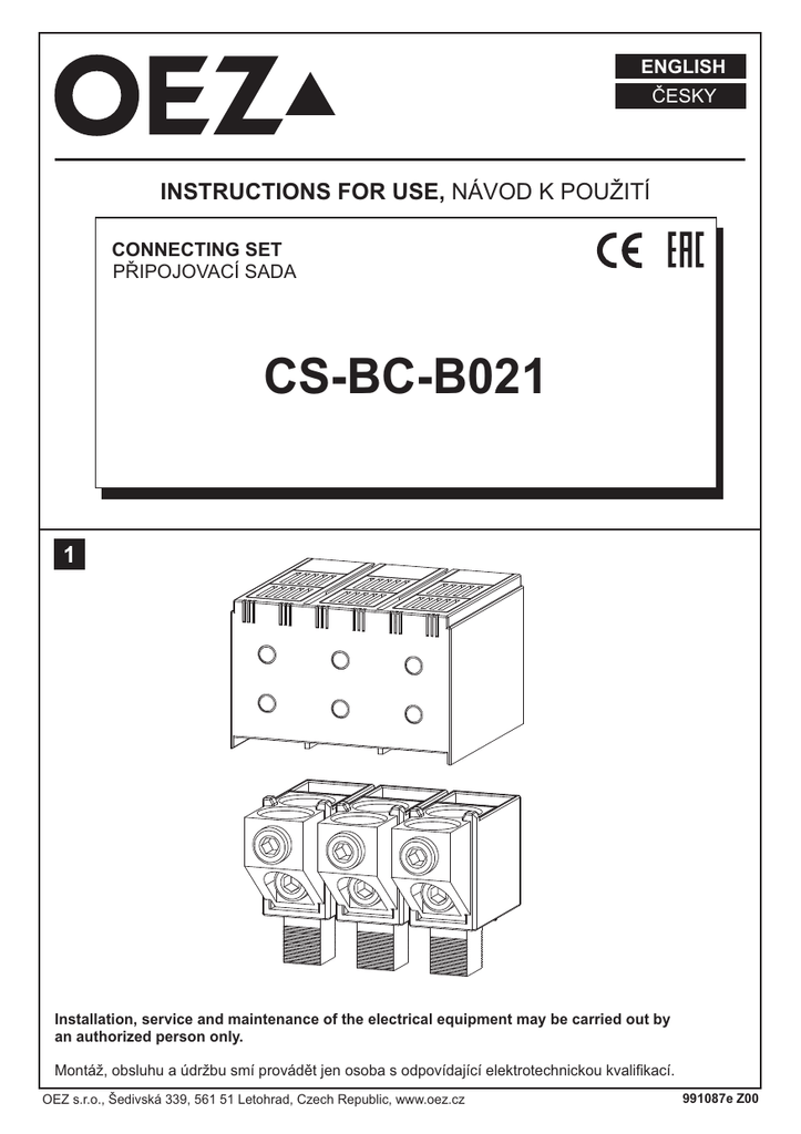 ENGLISH ČESKY INSTRUCTIONS FOR USE, NÁVOD K POUŽITÍ CONNECTING SET PŘIPOJOVACÍ SADA CS-BC-B021 1 Installation, service and maintenance of the electrical equipment may be carried out by an authorized person only. Montáž, obsluhu a údržbu smí provádět jen osoba s odpovídající elektrotechnickou kvalifikací. OEZ s.r.o., Šedivská 339, 561 51 Letohrad, Czech Republic, www.oez.cz 991087e Z00 2 FIXED DESING, FRONT CONNECTION PEVNÉ PROVEDENÍ, PŘEDNÍ PŘÍVOD 2 FOR STRANDED CONDUCTORS OF DIAMETER 25 ¸ 50mm USE TUBES FOR ASSEMBLING 2 U SLANĚNÝCH VODIČŮ PRŮŘEZU 25 ¸ 50mm POUŽÍT PŘI MONTÁŽI DUTINKY CS-BC-B021 5. 1. 6. 7. 8. 6 Nm ... 4 2. 25 ¸ 70mm 2 Al,Cu ... 10 Nm 95 ¸ 120mm 2 Al,Cu ... 15 Nm 5 5 202 9. 35 19 220 4. 3. OD-BC-KS03 + OD-BC-KS03 3 OD-BC-KS02 + OD-BC-KS03 Only materials which have low adverse environmental impact and which do not contain dangerous substances as specified in ROHS directive have been used in the product. Ve výrobku jsou použity materiály s nízkým negativním dopadem na životní prostředí, které neobsahují zakázané nebezpečné látky dle ROHS. -2- 991087e Z00 ESPAÑOL SLOVENSKY ПО-РУССКИ PO POLSKU DEUTSCH CS-BC-B021 -1- 991087e Z00 Návod k použitiu SLOVENSKY Pripájacia sada - CS-BC-B021 Montáž, obsluhu a údržbu môže vykonávať iba osoba s odpovedajúcou elektrotechnickou 1 2 3 kvalifikáciou. Pevné prevedenie Predný prívod Pri lanovaných vodičoch s prierezom 25, 50 mm2 použite pri montáži dutinky. Vo výrobku sú použite materiály s nízkym negatívnym dopadom na životné prostredie, ktoré neobsahujú zakázané látky podľa ROHS. Инструкция по эксплуатации ПО-РУССКИ Присоединительный комплект - CS-BC-B021 Установку, обслуживание и уход может проводить только лицо с соответствующей 1 2 3 электротехнической квалификацией. Стационарное исполнение Передний подвод Для многожильных проводов сечением 25, 50 mm2 при монтаже использовать гильзы. В изделии применены материалы с малым негативным влиянием на окружающую среду, которые не содержат запрещенные опасные вещества, указанные в директиве ROHS. PO POLSKU Instrukcja obsługi Zestaw przyłączy - CS-BC-B021 Montaż, obsługę i konserwację wykonywać może wyłącznie odpowiednio wykwalifikowana 1 2 3 osoby z branży elektrotechnicznej. Wykonanie stałe Przyłacza przednie W przypadku wiązek przewodów o średnicy 25, 50 mm2 podczas montażu zastosować końcówki tulejkowe. W wyrobie zastosowane zostały materiały z niskim negatywnym oddziaływaniem na środowisko naturalne, które nie zawierają zakazanych niebezpiecznych substancji zgodnie z ROHS. Gebrauchsanweisung DEUTSCH Anschlusssatz - CS-BC-B021 Die Montage, die Bedienung und Instandhaltung kann nur der Arbeiter mit der 1 2 3 entsprechenden elektrotechnischen Qualifikation verrichten. Feste Ausführung Vorderanschluss Bei verseilten Leitern mit einem Durchmesser von 25, 50 mm2 sind bei der Montage die Hülsen anzuwenden. Für das Erzeugnis werden Stoffe mit niedrigen negativen Umweltauswirkungen angewandt, die keine verbotenen gefährlichen Stoffe nach ROHS enthalten. ESPAÑOL Instrucciones de uso Juego de conexión - CS-BC-B021 El montaje, servicio y mantenimiento puede realizar únicamente la persona con la 1 2 3 cualificación electrotécnica correspondiente. Versión fija Conexión frontal Para los conductores trenzados de sección transversal 25,50 mm2 utilice los tubitos para el montaje. En el producto están usados los materiales que tienen incidencia negativa baja al medio ambiente, que no incluyen las materias peligrosas prohibidas según ROHS. -2- 991087e Z00