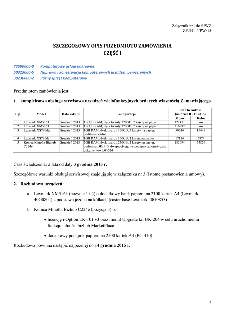 Załącznik nr 1do SIWZ ZP.341-4/PW/15 SZCZEGÓŁOWY OPIS PRZEDMIOTU ZAMÓWIENIA CZĘŚĆ I 72500000-0 50323000-5 30236000-2 Komputerowe usługi pokrewne Naprawa i konserwacja komputerowych urządzeń peryferyjnych Różny sprzęt komputerowy Przedmiotem zamówienia jest: 1. kompleksowa obsługa serwisowa urządzeń wielofunkcyjnych będących własnością Zamawiającego L.p. Model Data zakupu 1 2 3 Lexmark XM5163 Lexmark XM5163 Lexmark XS796dte Grudzień 2013 Grudzień 2013 Grudzień 2013 4 5 Lexmark XS796de Konica Minolta Bizhub C224e Grudzień 2013 Grudzień 2013 Konfiguracja 1,5 GB RAM; dysk twardy 320GB; 2 kasety na papier 1,5 GB RAM; dysk twardy 320GB; 2 kasety na papier 1GB RAM, dysk twardy 160GB; 3 kasety na papier, podstawa jezdna 1GB RAM, dysk twardy 160GB, 1 kaseta na papier 2GB RAM, dysk twardy 250GB, 2 kasety na papier, podstawa DK-510, dwuprzebiegowy podajnik automatyczny dokumentów DF-624 Stan liczników (na dzień 03.11.2015) Mono Kolor 121471 ---316382 ---50344 15449 17114 185094 5874 55829 Czas świadczenia: 2 lata od daty 3 grudnia 2015 r. Szczegółowe warunki obsługi serwisowej znajdują się w załączniku nr 3 (Istotne postanowienia umowy). 2. Rozbudowa urządzeń: a. Lexmark XM5163 (pozycje 1 i 2) o dodatkowy bank papieru na 2100 kartek A4 (Lexmark 40G0804) z podstawą jezdną na kółkach (caster base Lexmark 40G0855) b. Konica Minolta Bizhub C224e (pozycja 5) o: licencję i-Option LK-101 v3 oraz moduł Upgrade kit UK-204 w celu uruchomieniu funkcjonalności bizhub MarketPlace dodatkowy podajnik papieru na 2500 kartek A4 (PC-410) Rozbudowa powinna nastąpić najpóźniej do 14 grudnia 2015 r. 1 Sposób wyboru najkorzystniejszej oferty: Cena – koszty wydruku (waga kryterium 80%): Ocena oferty (Cb) odbędzie się po wypełnieniu tabeli cenami: Lp . Model a b 1 2 3 4 Lexmark XM5163 Lexmark XS796DTE Lexmark XS796DE Konica Minolta Bizhub C224e Kosz wydrukowania 1 strony A4 netto Szacunkowy wolumen stron w trakcie trwania umowy mono kolor mono kolor c d e f Ilość Łączny przewidywany koszt wydruku h 2 1 1 1 240000 70000 30000 200000 i=(c*e+d*f)*h 0 25000 15000 70000 SUMA netto SUMA brutto (CWb) Oferta z najniższą zaoferowaną ceną – kosztami wydruku brutto otrzyma 80 pkt. Pozostałe oferty otrzymają punkty zgodnie z wyliczeniem wg wzoru: Wartość punktowa = 80 x (CWmin/CWb) gdzie: CWmin - najniższa cena spośród złożonych ofert, CWb - cena oferty badanej. Maksymalna liczba punktów, która może zostać przyznana Wykonawcy w ocenie ww. kryterium wynosi 80 pkt. Cena - koszty rozbudowy – waga kryterium 18% Lp. Model Nazwa przedmiotu a 1 b Lexmark XM5163 2 Konica Minolta Bizhub C224e c bank papieru na 2100 kartek A4 podstawa jezdna (caster base) licencja i-Option LK-101 v3 moduł UK-204 podajnik papieru na 2500 kartek A4 Cena netto d Ilość e Łączny koszt rozbudowy f=d*e 2 1 Suma netto Suma brutto (CRb) Oferta z najniższą zaoferowaną ceną – kosztami rozbudowy brutto otrzyma 18 pkt. Pozostałe oferty otrzymają punkty zgodnie z wyliczeniem wg wzoru: Wartość punktowa = 18 x (CRmin/CRb) 2 gdzie: CRmin - najniższa cena spośród złożonych ofert, CRb - cena oferty badanej. Maksymalna liczba punktów, która może zostać przyznana Wykonawcy w ocenie ww. kryterium wynosi 18 pkt. Termin wykonania rozbudowy urządzeń (waga kryterium 2%): Rozbudowa urządzeń do 14 grudnia 2015 r – 0 pkt Rozbudowa urządzeń do 8 grudnia 2015 r – 1 pkt Rozbudowa urządzeń 3 grudnia (w dniu uruchomienia obsługi serwisowej) – 2 pkt Maksymalna liczba punktów, która może zostać przyznana Wykonawcy w ocenie ww. kryterium wynosi 2 pkt. Punkty za poszczególne kryteria zostaną zsumowane wg wzoru: CW + CR + T a suma punktów stanowić będzie końcową ocenę danej oferty. gdzie: CW – punkty przyznane w kryterium „Cena – koszty wydruku”, CR – punkty przyznane w kryterium „Cena – koszty rozbudowy”, T – punkty przyznane w kryterium „Termin wykonania zamówienia” Oferta musi być zgodna ze szczegółowym opisem przedmiotu zamówienia 3