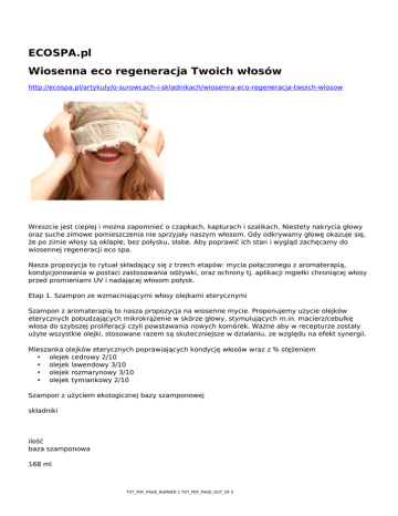 ECOSPA.pl Wiosenna eco regeneracja Twoich włosów http://ecospa.pl/artykuly/o-surowcach-i-skladnikach/wiosenna-eco-regeneracja-twoich-wlosow Wreszcie jest cieplej i można zapomnieć o czapkach, kapturach i szalikach. Niestety nakrycia głowy oraz suche zimowe pomieszczenia nie sprzyjały naszym włosom. Gdy odkrywamy głowę okazuje się, że po zimie włosy są oklapłe, bez połysku, słabe. Aby poprawić ich stan i wygląd zachęcamy do wiosennej regeneracji eco spa. Nasza propozycja to rytuał składający się z trzech etapów: mycia połączonego z aromaterapią, kondycjonowania w postaci zastosowania odżywki, oraz ochrony tj. aplikacji mgiełki chroniącej włosy przed promieniami UV i nadającej włosom połysk. Etap 1. Szampon ze wzmacniającymi włosy olejkami eterycznymi Szampon z aromaterapią to nasza propozycja na wiosenne mycie. Proponujemy użycie olejków eterycznych pobudzających mikrokrążenie w skórze głowy, stymulujących m.in. macierz/cebulkę włosa do szybszej proliferacji czyli powstawania nowych komórek. Ważne aby w recepturze zostały użyte wszystkie olejki, stosowane razem są skuteczniejsze w działaniu, ze względu na efekt synergii. Mieszanka olejków eterycznych poprawiających kondycję włosów wraz z % stężeniem • olejek cedrowy 2/10 • olejek lawendowy 3/10 • olejek rozmarynowy 3/10 • olejek tymiankowy 2/10 Szampon z użyciem ekologicznej bazy szamponowej składniki ilość baza szamponowa 168 ml TXT_PDF_PAGE_NUMBER 1 TXT_PDF_PAGE_OUT_OF 5 woda lub hydrolat 25 ml fitokeratyna 5 ml olejek cedrowy 0,4 ml (8 kropli) olejek lawendowy 0,6 ml (12 kropli) olejek rozmarynowy 0,6 ml (12 kropli) olejek tymiankowy 0,4 ml (8 kropli) butelka PET 200 ml Sposób przygotowania: Do bazy szamponowej dodaj kolejno składniki mieszając je powoli, tak aby szampon nie spienił się. Całość przelej do buteleczki, szampon jest gotowy. Najlepiej użyć w ciągu 3 miesięcy. Szampon z użyciem ekologicznych detergentów AN składniki % ilość bio solubilizator 5 10 ml olejek cedrowy 0,2 0,4 ml (8 kropli) olejek lawendowy ekologiczny 0,3 0,6 ml (12 kropli) olejek rozmarynowy 0,3 0,6 ml (12 kropli) olejek tymiankowy 0,2 0,4 ml (8 kropli) woda lub hydrolat 50 100 ml ekologiczne detergenty AN 40 80 ml fitokeratyna TXT_PDF_PAGE_NUMBER 2 TXT_PDF_PAGE_OUT_OF 5 2,5 5 ml kwas mlekowy 88% 0,2 0,4 ml eco konserwant proszek 1,3 2,6 ml butelka PET 200 ml Sposób przygotowania: Odmierz solubilizator, dodaj do niego olejki eteryczne, wymieszaj. Następnie powoli mieszając dodaj kolejno: wodę lub hydrolat, eco konserwant proszek, fitokeratynę, detergenty AN a na końcu kwas mlekowy. Szampon będzie mętny i lekko zagęści się. Po przelaniu do butelki i odstaniu kilku godzin nabierze przezroczystości oraz będzie miodowego koloru. Najlepiej użyć w ciągu 3 miesięcy. Etap 2. Kondycjonowanie włosów Do kondycjonowania włosów proponujemy ekologiczną bazę odżywkową wzbogaconą o składniki aktywne dobrane do rodzaju włosów. W zależności jak długie masz włosy stosuj 100 ml lub więcej odżywki. Ekologiczna odżywka do włosów z proteinami składniki ilość bazowa ekologiczna odżywka do włosów 100-150 ml do włosów suchych: fitokeratyna 10 ml olej makadamia, arganowy lub jojoba 10 ml do włosów normalnych: fitokeratyna 10 ml ekstrakt glicerynowy ze spiruliny TXT_PDF_PAGE_NUMBER 3 TXT_PDF_PAGE_OUT_OF 5 10 ml do włosów tłustych: ekstrakt glicerynowy ze spiruliny 10 ml hydrolat rozmarynowy lub rumianku rzymskiego* 25 ml naczynie np. miseczka *do włosów ciemnych hydrolat rozmarynowy, do włosów jasnych z rumianku rzymskiego Sposób przygotowania: Po wymieszaniu składników odżywkę nakładaj na wilgotne włosy na ok. 15 minut, następnie dobrze spłucz ciepłą wodą. Stosuj po myciu co 2-3 dni przez parę tygodni. Etap 3. Lekkie kondycjonowanie i ochrona Po myciu oraz zastosowaniu i spłukaniu odżywki włosy są odpowiednio zadbane. Warto jednak pomyśleć o ochronie włosów przed promieniowaniem UV i innymi niekorzystnymi czynnikami jak wiatr, suche powietrze czy dym papierosowy. Do tego celu doskonała będzie mgiełka na włosy. Aby jednak włosów nadmiernie nie obciążyć w mgiełce używamy nie więcej niż 4% składników aktywnych, resztę stanowi dobrany do włosów hydrolat. Ochronna mgiełka do włosów z zieloną herbatą składniki ilość hydrolat* 48 ml eco konserwant płynny 0,5 ml fitokeratyna lub honeyquat 0,5 ml ekstrakt z zielonej herbaty EKO 1 ml butelka szklana 50 ml z atomizerem TXT_PDF_PAGE_NUMBER 4 TXT_PDF_PAGE_OUT_OF 5 Ochronna mgiełka do włosów z witaminą C MAP składniki ilość hydrolat* 48 ml eco konserwant płynny 0,5 ml fitokeratyna lub honeyquat 0,5 ml witamina C MAP 1 gram butelka szklana 50 ml z atomizerem *do włosów ciemnych hydrolat rozmarynowy, do włosów jasnych z rumianku rzymskiego Sposób przygotowania: Po wymieszaniu składników mgiełkę przelej do buteleczki z atomizerem (witaminę C MAP należy dokładnie rozpuścić w roztworze, który wcześniej najlepiej podgrzać w łaźni wodnej). Spryskuj włosy raz dziennie, najlepiej rano przed wyjściem. Mgiełkę najlepiej przechowywać w chłodnym miejscu i użyć w ciągu 3 miesięcy. Życzymy udanych receptur oraz pięknych i lśniących włosów :) TXT_PDF_PAGE_NUMBER 5 TXT_PDF_PAGE_OUT_OF 5