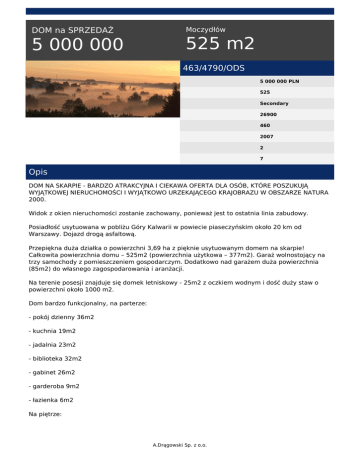 DOM na SPRZEDAŻ 5 000 000 Moczydłów 525 m2 463/4790/ODS 5 000 000 PLN 525 Secondary 26900 460 2007 2 7 Opis DOM NA SKARPIE - BARDZO ATRAKCYJNA I CIEKAWA OFERTA DLA OSÓB, KTÓRE POSZUKUJĄ WYJĄTKOWEJ NIERUCHOMOŚCI I WYJĄTKOWO URZEKAJĄCEGO KRAJOBRAZU W OBSZARZE NATURA 2000. Widok z okien nieruchomości zostanie zachowany, ponieważ jest to ostatnia linia zabudowy. Posiadłość usytuowana w pobliżu Góry Kalwarii w powiecie piaseczyńskim około 20 km od Warszawy. Dojazd drogą asfaltową. Przepiękna duża działka o powierzchni 3,69 ha z pięknie usytuowanym domem na skarpie! Całkowita powierzchnia domu – 525m2 (powierzchnia użytkowa – 377m2). Garaż wolnostojący na trzy samochody z pomieszczeniem gospodarczym. Dodatkowo nad garażem duża powierzchnia (85m2) do własnego zagospodarowania i aranżacji. Na terenie posesji znajduje się domek letniskowy - 25m2 z oczkiem wodnym i dość duży staw o powierzchni około 1000 m2. Dom bardzo funkcjonalny, na parterze: - pokój dzienny 36m2 - kuchnia 19m2 - jadalnia 23m2 - biblioteka 32m2 - gabinet 26m2 - garderoba 9m2 - łazienka 6m2 Na piętrze: A.Drągowski Sp. z o.o. - cztery sypialnie - 37m2, 16m2, 16m2 i 15m2 - garderoba 15m2 - dwie łazienki – 14m2 i 6m2 Ogrzewanie gazowe (piec Vaillant), podpiwniczony taras. Treść niniejszego ogłoszenia nie stanowi oferty handlowej w rozumieniu Kodeksu Cywilnego. Agnieszka Andruszkiewicz tel. 694151938 email: [email protected] A.Drągowski Sp. z o.o. Powered by TCPDF (www.tcpdf.org)