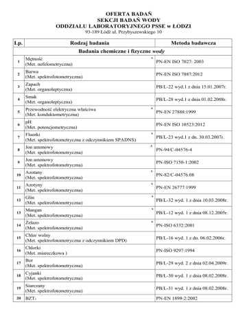 OFERTA BADAŃ SEKCJI BADAŃ WODY ODDZIAŁU LABORATORYJNEGO PSSE w ŁODZI 93-189 Łódź ul. Przybyszewskiego 10 Lp. Rodzaj badania Metoda badawcza Badania chemiczne i fizyczne wody A 1 Mętność (Met. nefelometryczna) 2 Barwa (Met. spektrofotometryczna) PN-EN ISO 7887:2012 3 Zapach (Met. organoleptyczna) PB/L-22 wyd.1 z dnia 15.01.2007r. 4 Smak (Met. organoleptyczna) PB/L-28 wyd.1 z dnia 01.02.2008r. 5 Przewodność elektryczna właściwa (Met. konduktometryczna) 6 pH (Met. potencjometryczna) Fluorki (Met. spektrofotometryczna z odczynnikiem SPADNS) A 7 Jon amonowy (Met. spektrofotometryczna) A 8 9 Jon amonowy (Met. spektrofotometryczna) Azotany (Met. spektrofotometryczna) A 10 Azotyny (Met. spektrofotometryczna) A 11 Glin (Met. spektrofotometryczna) A 12 Mangan (Met. spektrofotometryczna) A 13 Żelazo (Met. spektrofotometryczna) A 14 15 Chlor wolny (Met. spektrofotometryczna z odczynnikiem DPD) PB/L-16 wyd. 1 z dn. 06.02.2006r. 16 Chlorki (Met. miareczkowa ) PN-ISO 9297:1994 17 Bor (Met. spektrofotometryczna) PB/L-29 wyd. 2 z dnia 02.04.2009r. 18 Cyjanki (Met. spektrofotometryczna) PB/L-30 wyd. 1 z dnia 08.02.2008r. 19 Siarczany (Met. spektrofotometryczna) PB/L-31 wyd. 1 z dnia 08.02.2008r. 20 BZT5 PN-EN 1899-2:2002 A PN-EN ISO 7027: 2003 PN-EN 27888:1999 PN-EN ISO 10523:2012 PB/L-23 wyd.1 z dn. 30.03.2007r. PN-94/C-04576-4 PN-ISO 7150-1:2002 PN-82/C-04576.08 PN-EN 26777:1999 PB/L-32 wyd. 1 z dnia 10.03.2008r. PB/L-12 wyd. 1 z dnia 08.12.2005r. PN-ISO 6332:2001 21 Tlen rozpuszczony PN EN 25813 PN ISO 5813:1997 22 Twardość ogólna, wapń i magnez Met. miareczkowa ) PN ISO 6058:1999, PN ISO 6059:1999 23 Utlenialność (Met. miareczkowa ) PN-EN ISO 8467 lipiec 2001 Badania mikrobiologiczne wody 24 Bakterie grupy coli E. coli (Met. FM) PN-EN ISO 9308-1:2004/AC 25 Bakterie E. coli (Met. FM) PN-EN ISO 9308-1:2004/AC 26 Bakterie grupy coli (Met. FM) 27 Bakterie grupy coli oraz bakterie grupy coli termotolerancyjne A** i E. coli PB/L-03 wyd. 4 z dnia 23.03.2009r. (Met. FM) 28 Bakterie grupy coli (DST NPL) 29 Bakterie E. coli (DST NPL) Paciorkowce kałowe(Enterokoki) (Met. FM) A 30 Paciorkowce kałowe (Enterokoki)(DST NPL) ** 31 32 Clostridium perfringens wraz ze sporami (w 100 ml) 33 Clostridium perfringens wraz ze sporami (w 100 ml) A** A** A** PB/L-02 wyd. 4 z dnia 23.03.2009r. PB/L-10 wyd. 4 z dnia 23.03.2009r. PB/L-10 wyd. 4 z dnia 23.03.2009r. PN-EN ISO 7899-2: 2004 PB/L-35 wyd. 1 z dnia 13.02.2009r. Rozp. Min. Zdrowia z dn. 29.03.2007r. (Dz. U. Nr 61, poz. 417) z późn. zm. A** PB/L-18 wyd. 5 z dnia 23.03.2009r. (Met. FM) A** 34 Clostridia (Met. FM) 35 Przetrwalniki beztlenowców redukujące siarczyny (clostridia) (w 50 ml) (Met. FM) PB/L-18 wyd. 5 z dnia 23.03.2009r. PN-EN 26461-2:2001 Ogólna liczba mikroorganizmów hodowanych na agarze 36 w (36±2)°C , (44±4) h ( w 1 ml) (Met. posiewu wgłębnego) A* PN ISO 6222: 2004 37 Ogólna liczba mikroorganizmów hodowanych na agarze w (22±2) °C , (68±4) h (w 1 ml) (Met. posiewu wgłębnego) A* PN - EN ISO 6222: 2004 38 Gronkowce koagulazododatnie (S.aureus)(Met. FM) PB/L-15 wyd. 3 z dnia 04.01.2010r. 39 Pał. z rodzaju Salmonella (Met. FM) PB/L-11 wyd. 4 z dnia 11.02.2010r. 40 Pseudomonas aeruginosa (Met. FM) 41 Pseudomonas aeruginosa (Met. FM) A** PB/L-14 wyd. 2 z dnia 23.03.2009r. PN-EN ISO 16266:2009 42 Bakterie z rodz. Legionella (Met. FM)A 43 Bakterie z rodz. Legionella (Met. FM) A** PB/L-17 wyd. 3 z dnia 23.03.2009r. PN-EN ISO 11731-2:2008 * - w ramach działalności nadzorowej dotyczy tylko PSSE w Łodzi ** - metoda potwierdzona/zwalidowana właściwa do określenia parametrów wskaźnika inna niż wskazana w Rozporządzeniu A – badania objęte akredytacją Polskiego Centrum Akredytacji, Certyfikat akredytacji Nr AB 543 na zakres Nr AB 543 wyd. 11 z dnia 13.09.2013r.