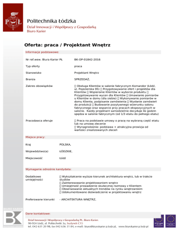 Oferta: praca / Projektant Wnętrz Informacje podstawowe: Nr ref.wew. Biura Karier PŁ BK-OP-01842-2016 Typ oferty praca Stanowisko Projektant Wnętrz Branża SPRZEDAŻ, Zakres obowiązków Obsługa Klientów w salonie fabrycznym Komandor (Łódź, ul. Pojezierska 95) Przygotowywanie ofert i projektów dla Klientów Wspieranie Klientów w wyborze produktu Przygotowywanie wycen dla Klientów Umawianie pomiarów u Klientów w domu (dla siebie) Wykonywanie pomiarów w domu Klienta, podpisanie zamówienia Wysłanie zamówień do produkcji Budowanie pozytywnego wizerunku salonu fabrycznego oraz wsparcie przy pracach ekspozycyjnych w salonie. Każdy projektant samodzielnie decyduje ile godzin spędza w salonie fabrycznym (od 1/3 etatu do pełnego etatu) Pracodawca oferuje Praca na podstawie umowy o pracę na wybraną część etatu lub na umowę zlecenie Wynagrodzenie: podstawa + atrakcyjna prowizja od wartości zrealizowanych zleceń Miejsce pracy: Kraj POLSKA, Województwo(a) ŁÓDZKIE, Miejscowość Łódź Wymaganie odnośnie kandydata: Dodatkowe umiejętności Wykształcenie wyższe kierunek architektura wnętrz, lub w trakcie studiów Zainteresowanie projektowaniem wnętrz Umiejętność prowadzenie skutecznej rozmowy z Klientem Obserwowanie aktualnych trendów na rynku wnętrzarskim Udokumentowane doświadczenie w projektowaniu wnętrz Preferowane kierunki - ARCHITEKTURA WNĘTRZ, Dane kontaktowe: Nazwa firmy/Pracodawcy Kraj Województwo Miasto Adres Kod pocztowy Email Komandor Łódź S.A POLSKA ŁÓDZKIE Łódź Pojezierska 95 91-341 [email protected] Sposób aplikacji: CV prosimy wysyłać drogą mailową Data umieszczenia: Oferta ważna od 18-08-2016 do 30-09-2017 Politechnika Łódzka, jest wpisana pod numerem 2414 do rejestru podmiotów prowadzących agencje zatrudnienia.