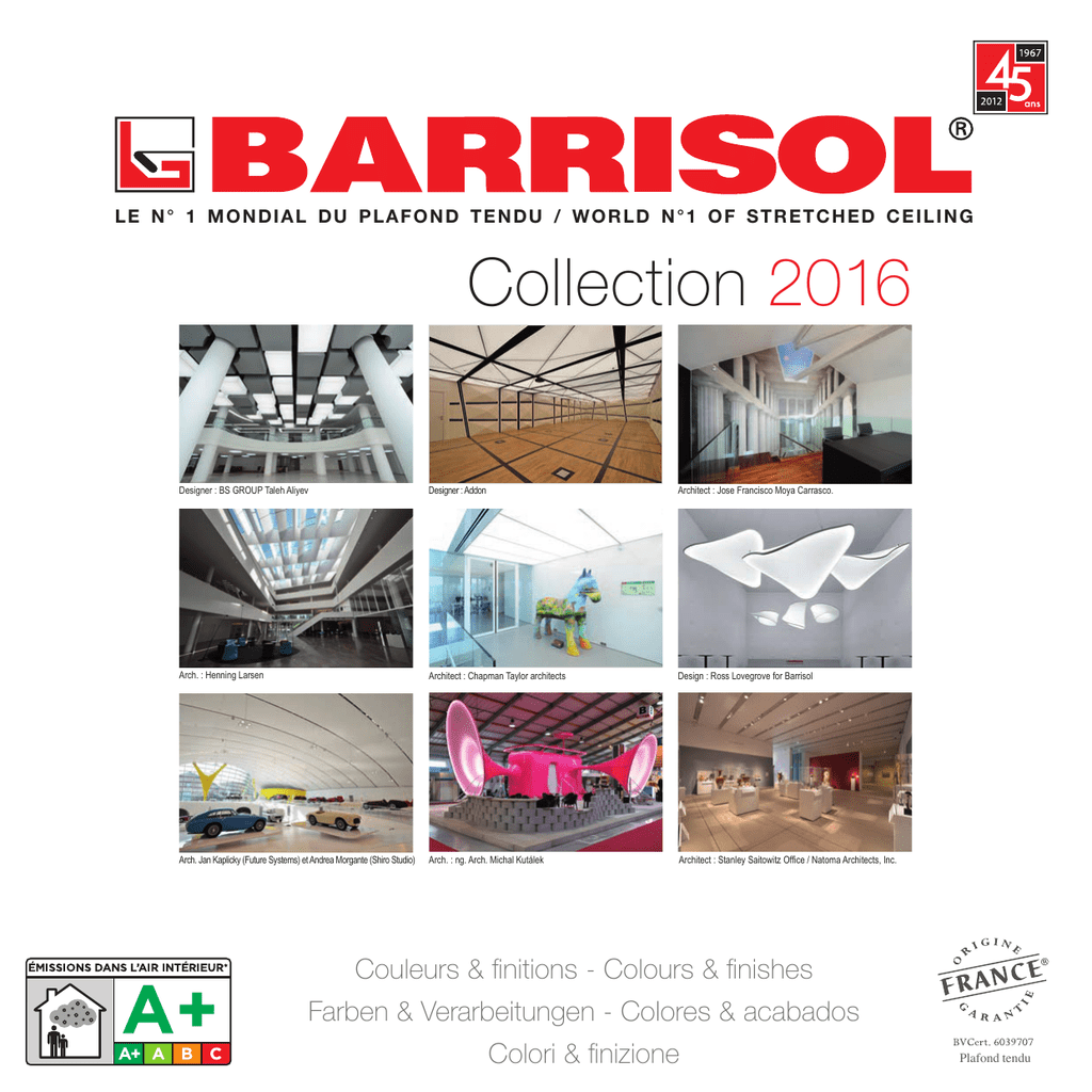 LE N° 1 MONDIAL DU PLAFOND TENDU / WORLD N°1 OF STRETCHED CEILING Collection 2016 Designer : BS GROUP Taleh Aliyev Designer : Addon Architect : Jose Francisco Moya Carrasco. Arch. : Henning Larsen Architect : Chapman Taylor architects Design : Ross Lovegrove for Barrisol Arch. Jan Kaplicky (Future Systems) et Andrea Morgante (Shiro Studio) Arch. : ng. Arch. Michal Kutálek Architect : Stanley Saitowitz Office / Natoma Architects, Inc. Couleurs & finitions - Colours & finishes Farben & Verarbeitungen - Colores & acabados Colori & finizione Plafond tendu Toutes les toiles Barrisol® sont étiquetées A+ (note la plus élevée) conformément à la législation en vigueur sur la qualité de l’air intérieur. All Barrisol® lines are A+ classed (best result) for indoor air quality, respecting the effective legislation. Die Barrisol® Folie haben mit der A+ Note die beste Bewertung nach der aktuellen Gesetzgebung für die Luftbeschaffenheit in Innenräumen. Tutta la gamma dei teli Barrisol® ha ricevuto il marchio A+ (Voto più elevato) in conformità alla legislazione in vigore relativamente alla qualità dell’aria e l’emissione di COV - composti organici volatili. Todos los acabados Barrisol® fueron certificados A+ según la legislación vigente respecto a la emisión de componentes orgánicos volátiles (COV) y de la calidad del aire interior. - les Reflets Laqués : A+ - les Rêves Satinés : A+ - les Mats Traditions : A+ - les Daims Ambiance : A+ - les Recyclés : A+ - les Translucides : A+ - les plafond Barrisol® imprimés : A+ - les Effets Lumière : A+ - les Effets Matière : A+ - Barrisol® Creadesign® : A+ - Barrisol ® Mirror® : A+ BARRISOL® Normalu SAS, premier fabricant de plafond au monde à obtenir le label “Origine Française Garantie”. “Origine France Garantie” certifie que les plafonds Barrisol® sont bien fabriqués en France. BARRISOL® Normalu SAS is the first stretch ceiling manufacturer in the world to get the “French Origin Guarantee” Label. “French Origin Guarantee” certifies that Barrisol® stretch ceilings are made in France. BARRISOL® Normalu SAS ist der erste Spanndeckenhersteller der Welt, der das Label “Origine France Garantie” (Herstellung in Frankreich garantiert) erhalten hat. Das Label “Origine France Garantie” zertifiziert, dass die Barrisol Spanndecken in Frankreich herstellen werden. Plafond tendu BARRISOL® Normalu SAS, primo fabbricante di soffitto teso al mondo ad ottenere il label “Origine France Garantie”. “Origine France Garantie” certifica che i soffitti Barrrisol® sono fabbricati in Francia. BARRISOL® Normalu SAS, es el primer fabricante de techos tensados que ha obtenido la denominación “Origine France Garantie”. “Origine France Garantie” asegura que los techos Barrisol® se fabrican en Francia. * Information sur le niveau d’émission de substances volatiles dans l’air intérieur, présentant un risque de toxicité par inhalation, sur une échelle de classe allant de A+ (très faibles émissions) à C (fortes émissions). Information on the emission level of volatile substances indoors, based on the risk of toxicity due to inhalation, on a scale ranging from Class A (very low emissions) to C (high emissions). Informationen über das Emissionsniveau von flüchtigen Substanzen in der Luft von Innenräumen, die ein Gesundheitsrisiko beim Atmen darstellen, aufgelistetin einer Klassifikation von A+ (sehr schwache Emission) bis Klasse C (hohe Emission). Informazione sul livello d’emissione di sostanze volatile nell’aria interna, presentando un rischio di tossicità per inalazione, su una scala di classe iniziando da A+ (molto debole emissione) a C (forte emissione). Informacion sobre el nivel de emisión de substancias volátiles en al aire de un local, presentando riesgos de toxicidad al inhalarlo, en una escala de A+ (muy bajo nivel) a C (muy alto nivel de emisión). Collection 2016 Les reflets laqués® 4 Les rêves satinés® 6 Les inspirations satinées® 8 Les mats tradition® 10 Les métal® 11 Les translucides® 12 Les Xtrèmes® 13 Les Effets Lumière® 14 Les recyclés® 16 Les daims ambiance® 18 Creadesign® 20 Mirror® 22 Les Effets Matière® 24 Les Effets Béton® 26 Les Effets Bois® 28 Les Effets Brique® 30 Print your Mind 32 Perfodesign® 34 Quelques projets - some projects - einige Projekten - alcuni progetti - algunos proyectos 36 ® COPYRIGHT© 2016 NORMALU BARRISOL S.A.S. - Tous droits réservés 3 Les reflets laqués® Barrisol® Star® - Architecte : João Luis Carrilho 4 Design : BF 02018 Gris Tamaris*(1) 02010 Blanc Orchidée*(1)/** 02032 Brun Roseaux** 02083 Rouge Coquelicot*(1) 02090 Rose Fushia*(1) 02019 Gris Erodium*(1) 02011 Blanc Lys*(1)/** 02033 Brun Noisetier*(1) 02082 Rouge Capucine* 02088 Violet Gilia* 02020 Gris Asarine*(1)/** 02017 Beige Obione*(1) 02031 Brun Pomme de Pin*(1) 02051 Orange Coulouma*(1) 02012 Gris Clématite* 02024 Jaune Reseda* 02041 Noir Tulipe*(1)/** 02025 Orange Datura* 02050 Mauve Iris* 02016 Gris Ombelle*(1) 02015 Beige Arum*/** 02086 Violet Aubergine* 02028 Terracota Ixia* 02089 Violet Laelia*(1) 02014 Gris Jasmin*/** 02013 Beige Magnolia** 02081 Bordeaux Pivoine*(1)/** 02053 Pêche Angélique* 02065 Vert Amandine* 02021 Beige Dactyle* 02087 Brun Aurea** 02092 Rose Camélia* 02076 Bleu Belle de Nuit*(1) 02005 Blanc Edelweiss* 02030 Taupe Asaret* 02085 Rouge Grenat* 02091 Rose Azalée* 02075 Bleu Campanule*(1)/** COPYRIGHT© 2016 NORMALU BARRISOL S.A.S. - Tous droits réservés 02084 Prune Violette* 02052 Mauve Aster* Réalisation : Deco Design Design : Ron Arad 02066 Vert Laurier* 02067 Vert Olive* 02027 Jaune Cytise*(1) 02022 Jaune Jonquille* 02072 Bleu Gentiane** 02070 Bleu Dauphinelle*(1) 02062 Vert Houx* 02069 Vert Aralia* 02073 Bleu Bleuet* 02071 Bleu Myosotis* 02061 Vert Gui* 02068 Vert Lindera* 02074 Bleu Pervenche* 02064 vert Amarante* 02063 Vert Verveine** 02023 Jaune Primevère* ACOUSTICS® A15 - A20 - A30 : ≤ 220 cm 