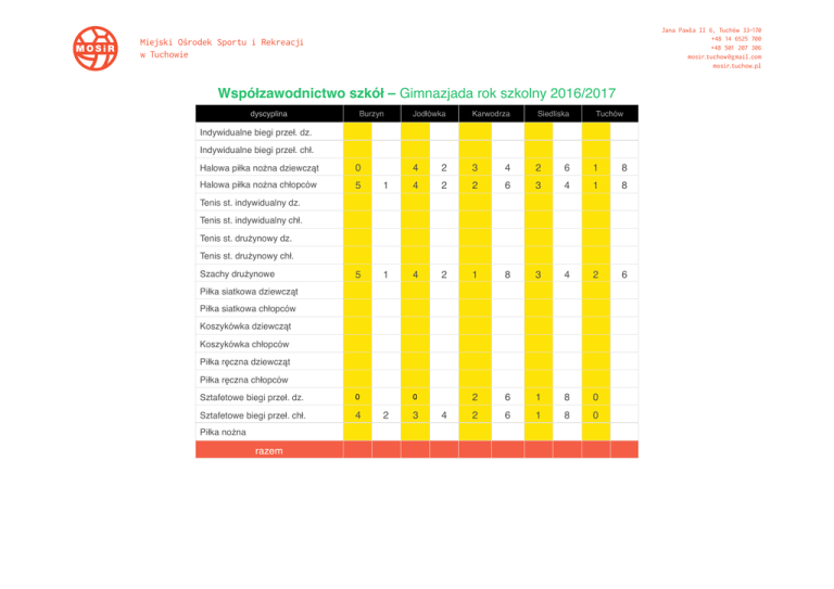Jana Pawła II 6, Tuchów 33-170 +48 14 6525 700 +48 501 207 306 [email protected] mosir.tuchow.pl Miejski Ośrodek Sportu i Rekreacji w Tuchowie ! Współzawodnictwo szkół – Gimnazjada rok szkolny 2016/2017 dyscyplina Burzyn Jodłówka Karwodrza Siedliska Tuchów 4 2 3 4 2 6 1 8 Indywidualne biegi przeł. dz. Indywidualne biegi przeł. chł. Halowa piłka nożna dziewcząt 0 Halowa piłka nożna chłopców 5 1 4 2 2 6 3 4 1 8 5 1 4 2 1 8 3 4 2 6 2 6 1 8 0 2 6 1 8 0 Tenis st. indywidualny dz. Tenis st. indywidualny chł. Tenis st. drużynowy dz. Tenis st. drużynowy chł. Szachy drużynowe Piłka siatkowa dziewcząt Piłka siatkowa chłopców Koszykówka dziewcząt Koszykówka chłopców Piłka ręczna dziewcząt Piłka ręczna chłopców Sztafetowe biegi przeł. dz. 0 Sztafetowe biegi przeł. chł. 4 Piłka nożna razem 0 2 3 4