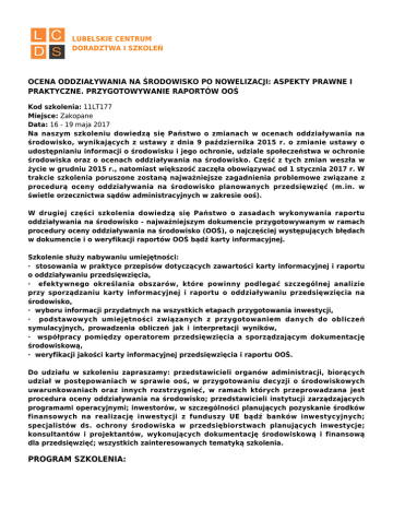 LUBELSKIE CENTRUM DORADZTWA I SZKOLEŃ OCENA ODDZIAŁYWANIA NA ŚRODOWISKO PO NOWELIZACJI: ASPEKTY PRAWNE I PRAKTYCZNE. PRZYGOTOWYWANIE RAPORTÓW OOŚ Kod szkolenia: 11LT177 Miejsce: Zakopane Data: 16 - 19 maja 2017 Na naszym szkoleniu dowiedzą się Państwo o zmianach w ocenach oddziaływania na środowisko, wynikających z ustawy z dnia 9 października 2015 r. o zmianie ustawy o udostępnianiu informacji o środowisku i jego ochronie, udziale społeczeństwa w ochronie środowiska oraz o ocenach oddziaływania na środowisko. Część z tych zmian weszła w życie w grudniu 2015 r., natomiast większość zaczęła obowiązywać od 1 stycznia 2017 r. W trakcie szkolenia poruszone zostaną najważniejsze zagadnienia problemowe związane z procedurą oceny oddziaływania na środowisko planowanych przedsięwzięć (m.in. w świetle orzecznictwa sądów administracyjnych w zakresie ooś). W drugiej części szkolenia dowiedzą się Państwo o zasadach wykonywania raportu oddziaływania na środowisko - najważniejszym dokumencie przygotowywanym w ramach procedury oceny oddziaływania na środowisko (OOŚ), o najczęściej występujących błędach w dokumencie i o weryfikacji raportów OOŚ bądź karty informacyjnej. Szkolenie służy nabywaniu umiejętności: · stosowania w praktyce przepisów dotyczących zawartości karty informacyjnej i raportu o oddziaływaniu przedsięwzięcia, · efektywnego określania obszarów, które powinny podlegać szczególnej analizie przy sporządzaniu karty informacyjnej i raportu o oddziaływaniu przedsięwzięcia na środowisko, · wyboru informacji przydatnych na wszystkich etapach przygotowania inwestycji, · podstawowych umiejętności związanych z przygotowaniem danych do obliczeń symulacyjnych, prowadzenia obliczeń jak i interpretacji wyników, · współpracy pomiędzy operatorem przedsięwzięcia a sporządzającym dokumentację środowiskową, · weryfikacji jakości karty informacyjnej przedsięwzięcia i raportu OOŚ. Do udziału w szkoleniu zapraszamy: przedstawicieli organów administracji, biorących udział w postępowaniach w sprawie ooś, w przygotowaniu decyzji o środowiskowych uwarunkowaniach oraz innych rozstrzygnięć, w ramach których przeprowadzana jest procedura oceny oddziaływania na środowisko; przedstawicieli instytucji zarządzających programami operacyjnymi; inwestorów, w szczególności planujących pozyskanie środków finansowych na realizację inwestycji z funduszy UE bądź banków inwestycyjnych; specjalistów ds. ochrony środowiska w przedsiębiorstwach planujących inwestycje; konsultantów i projektantów, wykonujących dokumentację środowiskową i finansową dla przedsięwzięć; wszystkich zainteresowanych tematyką szkolenia. PROGRAM SZKOLENIA: Część I. Zmiany w ocenach oddziaływania na środowisko od stycznia 2017 roku 1. Podstawy prawne systemu ocen oddziaływania na środowisko w UE i w Polsce 2. Procedura oceny oddziaływania na środowisko planowanych przedsięwzięć na etapie decyzji o środowiskowych uwarunkowaniach: - przedsięwzięcia wymagające uzyskania decyzji o środowiskowych uwarunkowaniach (w tym odstępstwa od wymogu uzyskania decyzji, zmiany w terminach związanych z możliwością wykorzystania decyzji oraz ich przedłużanie), - zakres wniosku o wydanie decyzji o środowiskowych uwarunkowaniach (zmiany w załącznikach do wniosku o wydanie decyzji), - organy właściwe do wydawania decyzji o środowiskowych uwarunkowaniach, uzgadniania i opiniowania w procedurze ooś (zmiany we właściwości organów uczestniczących w procedurze), - przebieg procedury oceny oddziaływania na środowisko dla poszczególnych grup przedsięwzięć (omówienie poszczególnych etapów procedury związanej z wydaniem decyzji o środowiskowych uwarunkowaniach poprzedzonej ooś i w przypadku odstąpienia od ooś), - udział społeczeństwa w postępowaniu ooś, - zakres karty informacyjnej przedsięwzięcia i raportu o oddziaływaniu przedsięwzięcia na środowisko (zmiany dotyczące rozszerzenia zakresu kip i raportu o nowe elementy, wymagania formalne dla wykonawców tych dokumentów), - zakres i wymogi dotyczące decyzji o środowiskowych uwarunkowaniach: - zakres decyzji po ocenie oddziaływania na środowisko, - decyzja z warunkami lub bez warunków po odstąpieniu od oceny oddziaływania na środowisko, - omówienie błędów pojawiających się w decyzjach i ich uzasadnieniach. 3. Ponowna ocena oddziaływania na środowisko 4. Administracyjne kary pieniężne za naruszenie warunków z procedur ooś 5. Postępowanie w sprawie transgranicznego oddziaływania na środowisko 6. Ocena oddziaływania przedsięwzięć na obszary Natura 2000 – przebieg procedury 7. Wymogi Ramowej Dyrektywy Wodnej a ooś – zarys 8. Kwestie łagodzenia i adaptacji do zmian klimatu, bioróżnorodność a ooś – zarys 9. Wymagania dotyczące ocen oddziaływania na środowisko w kontekście pozyskiwania funduszy unijnych (wybrane zagadnienia) 10. Konsultacje, dyskusja Część II. Podstawy przygotowywania raportów o oddziaływaniu przedsięwzięcia na środowisko 1. Wymóg uzyskania decyzji o środowiskowych uwarunkowaniach i jej miejsce w procesie inwestycyjnym: - podział przedsięwzięć mogących znacząco oddziaływać na środowisko: - przedsięwzięcia mogące zawsze znacząco oddziaływać na środowisko, - przedsięwzięcia mogące potencjalnie znacząco oddziaływać na środowisko, - kwalifikacja przedsięwzięć w przypadku rozbudowy, przebudowy i montażu dla przedsięwzięć mogących zawsze i potencjalnie znacząco oddziaływać na środowisko. Ćwiczenia dotyczące kwalifikacji przedsięwzięcia do mogących zawsze znacząco oddziaływać na środowisko lub do mogących potencjalnie znacząco oddziaływać na środowisko. 2. Kwalifikacja przedsięwzięcia do przeprowadzenia oceny oddziaływania na środowisko dla grupy II (SCREENING): - problem dzielenia przedsięwzięć w kontekście kwalifika