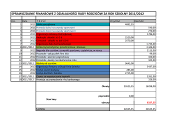SPRAWOZDANIE FINANSOWE Z DZIAŁALNOŚCI RADY RODZICÓW ZA ROK SZKOLNY 2011/2012 Poz. Data 1 2 3 4 5 6 7 8 9 10 11 12 13 14 15 16 17 18 2011 2011 2011 2011 2011 2012 2012 2011/2012 2012 2012 2012 2012 2011/2012 2012 2012 2012 2011/2012 2011/2012 TREŚĆ Saldo początkowe Przewóz dzieci na zawody sportowe I Przewóz dzieci na zawody sportowe II Organizacja zabawy Andrzejkowej Andrzejki -składki kl. 0-6 Karnawał - składki na bal kl.0-6 Organizacja balu Karnawałowego Konkursy tematyczne, przedmiotowe i klasowe Nagroda dla uczniów: za wyniki sportowe, czytelnicze, w nauce Pozostałe -zakup piłek first kick Pozostałe -wieniec pogrzebowy Pozostałe -kwiaty na zakończenie roku Wpłaty od uczniów. Organizacja Festynu z Okazji Dnia Dziecka Festyn-zwrot słodyczy Festyn-dochód z biletów Czynsz za wypożyczenie kopiarki Prowizja za prowadzenie r-ku bankowego Przychód Rozchód 4892,35 540,00 270,00 1786,00 2520,00 2570,00 1 723,00 3 446,00 2115,00 99,00 100,00 105,00 9645,00 3437,00 283,00 2715,00 2351,00 326,00 Obroty 22625,35 poprzedni 0,00 16298,00 Stan kasy obecny SUMA 6327,35 22625,35 22625,35