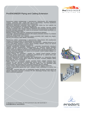 Pro/ENGINEER Piping and Cabling Extension Rozszerzenie pakietu podstawowego o parametryczne, trójwymiarowe (3D) projektowanie instalacji przewodów, kabli i wiązek kabli oraz ich dokumentacja. Umożliwia współbieżne projektowanie komponentów mechanicznych i elektrycznych. Definiowanie właściwości: przewodów, kabli i wiązek kabli: nazwa, typ, kolor, gęstość, typ złącza, średnica zewnętrzna, minimalny promień gięcia itp. Ręczne lub automatyczne (na podstawie zdefiniowanej sieci punktów) tworzenie ścieżek przebiegu przewodów, kabli i wiązek w złożeniu. Możliwość użycia zewnętrznych programów do tworzenia schematów logicznych 2D i użycie ich do tworzenia i kontroli ścieżek przewodów, np. Routed Systems Designer (RSD). Biblioteki: przyłączy, złącz (własnych, dostawców lub wbudowanych bibliotek). Technologia - tworzenie płaskiego rozwinięcia (2D) zespołu przewodów (harness) na podstawie modelu 3D: metoda ręczna i automatyczna. Dokumentacja płaska (2D) wraz z wykazem użytych przewodów, kabli i wiązek (typ, długość, kolor itd.) oraz wykazem części (BOM) z odnośnikami. Rozszerzenie pakietu podstawowego o parametryczne, trójwymiarowe (3D) projektowanie instalacji przewodów rurowych, ich dokumentacja oraz technologia. Projektowanie instalacji możliwe w dwóch trybach: automatycznym – instalacje tworzone są za pomocą specyfikacji zawartych w bazach danych (katalogi, biblioteki, normy) lub ręcznym (konstruktor ma pełną swobodę tworzenia instalacji). Intuicyjne projektowanie przebiegu instalacji: rur i przewodów hydraulicznych (sztywnych i giętkich), kanałów wentylacyjnych i klimatyzacyjnych itp. Tworzenie ścieżek przebiegu instalacji może być ręczne (w oparciu o układy współrzędnych, punkty, płaszczyzny, osie, krzywe, szkicowane trajektorie) lub dynamiczne. Możliwość użycia zewnętrznych programów do tworzenia schematów logicznych 2D i użycie ich do tworzenia i kontroli ścieżek instalacji, np. Routed Systems Designer (RSD). Definicja przekroju rur, przewodów i kanałów (np.: materiał, kształt przekroju, średnica zewnętrzna, grubość ścianki) wraz z dodatkowymi parametrami jak np.: gęstość płynu (gaz, ciecz), ciśnienie, kierunek przepływu, rodzaj izolacji itp. Możliwość zdefiniowania przez użytkownika reguł projektowania, np.: maksymalna długość przewodów, minimalny promień gięcia, maksymalny kąt gięcia, minimalna odległość między przewodami itp. oraz ich weryfikacja. Bogate biblioteki: rur, przewodów, kanałów, łączników (trójniki, zaślepki, kołnierze, kryzy, reduktory itp.) oraz wyposażenia dodatkowego (zawory, pompy, silniki, wentylatory, filtry, sprężarki, suszarki, parowniki, wymienniki ciepła itp.) według norm: JIS (japońskie), ANSI (amerykańskie) i DIN (niemieckie) oraz możliwość budowania własnych bibliotek. Analizy: masowe, długości odcinków instalacji, kolizji, prześwitów, ciągłości instalacji itp. Tworzenie dokumentacji płaskiej (2D) wraz z wykazem części, odnośnikami na rysunku oraz tabelami gięć. Technologia – tworzenie tabeli gięć rur (współrzędne zagięcia, kąt gięcia, promień gięcia) dla giętarek. Zapisywane informacji w formacie FIF (File Interchange Format), które mogą być użyte do sterowania giętarkami. ul. Bociana 22, 31-231 Kraków, tel (+48 12) 614-52-10, fax (+48 12) 614-52-11 [email protected], www.prodart.pl
