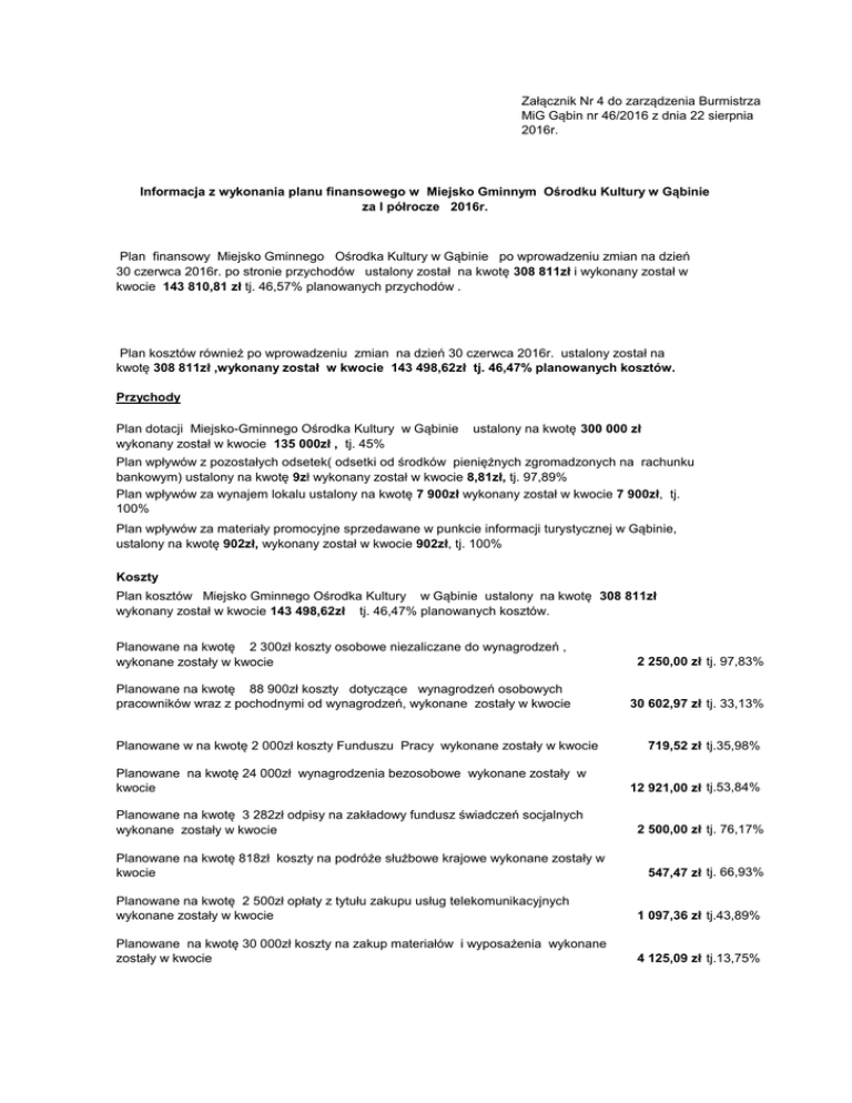 Załącznik Nr 4 do zarządzenia Burmistrza MiG Gąbin nr 46/2016 z dnia 22 sierpnia 2016r. Informacja z wykonania planu finansowego w Miejsko Gminnym Ośrodku Kultury w Gąbinie za I półrocze 2016r. Plan finansowy Miejsko Gminnego Ośrodka Kultury w Gąbinie po wprowadzeniu zmian na dzień 30 czerwca 2016r. po stronie przychodów ustalony został na kwotę 308 811zł i wykonany został w kwocie 143 810,81 zł tj. 46,57% planowanych przychodów . Plan kosztów również po wprowadzeniu zmian na dzień 30 czerwca 2016r. ustalony został na kwotę 308 811zł ,wykonany został w kwocie 143 498,62zł tj. 46,47% planowanych kosztów. Przychody Plan dotacji Miejsko-Gminnego Ośrodka Kultury w Gąbinie wykonany został w kwocie 135 000zł , tj. 45% ustalony na kwotę 300 000 zł Plan wpływów z pozostałych odsetek( odsetki od środków pieniężnych zgromadzonych na rachunku bankowym) ustalony na kwotę 9zł wykonany został w kwocie 8,81zł, tj. 97,89% Plan wpływów za wynajem lokalu ustalony na kwotę 7 900zł wykonany został w kwocie 7 900zł, tj. 100% Plan wpływów za materiały promocyjne sprzedawane w punkcie informacji turystycznej w Gąbinie, ustalony na kwotę 902zł, wykonany został w kwocie 902zł, tj. 100% Koszty Plan kosztów Miejsko Gminnego Ośrodka Kultury w Gąbinie ustalony na kwotę 308 811zł wykonany został w kwocie 143 498,62zł tj. 46,47% planowanych kosztów. Planowane na kwotę 2 300zł koszty osobowe niezaliczane do wynagrodzeń , wykonane zostały w kwocie 2 250,00 zł tj. 97,83% Planowane na kwotę 88 900zł koszty dotyczące wynagrodzeń osobowych pracowników wraz z pochodnymi od wynagrodzeń, wykonane zostały w kwocie 30 602,97 zł tj. 33,13% Planowane w na kwotę 2 000zł koszty Funduszu Pracy wykonane zostały w kwocie 719,52 zł tj.35,98% Planowane na kwotę 24 000zł wynagrodzenia bezosobowe wykonane zostały w kwocie 12 921,00 zł tj.53,84% Planowane na kwotę 3 282zł odpisy na zakładowy fundusz świadczeń socjalnych wykonane zostały w kwocie 2 500,00 zł tj. 76,17% Planowane na kwotę 818zł koszty na podróże służbowe krajowe wykonane zostały w kwocie 547,47 zł tj. 66,93% Planowane na kwotę 2 500zł opłaty z tytułu zakupu usług telekomunikacyjnych wykonane zostały w kwocie 1 097,36 zł tj.43,89% Planowane na kwotę 30 000zł koszty na zakup materiałów i wyposażenia wykonane zostały w kwocie 4 125,09 zł tj.13,75% W/w koszty poniesione zostały na : zakup materiałów biurowych, znaczki pocztowe, książka nadawcza zakup środków spożywczych dla dzieci na konkursy organizowane przez MGOK, ", "Dni Gąbina 2016" 200,20 zł 337,52 zł 1 249,00 zł zakup chłodziarko-zamrażarki zakup środków czystości zakup artykułów remontowych: płyty pilśniowej, kabli,rur kanalizacyjnych, art. elektrycznych, pianki zakup ramek do zdjęć, krzewów ozdobnych, zakup masek estradowych Razem: 91,02 zł 1 496,91 zł 750,44 zł 4 125,09 zł Planowane na kwotę 2 000zł koszty na zakup usług remontowych wykonane zostały w kwocie 0,00 zł tj. 0% Plan kosztów ustalony na kwotę 155 011zł na zakup usług , wykonany został w kwocie 88 735,21zł na następujące usługi: prowizja za prowadzenie rachunku zapłacona Bankowi, prowizja dla banku za wykonane przelewy, opłata za wydane zaświadczenie 2 949,00 zł organizacja zajęć z grupami artystycznymi utrzymanie czystości w pomieszczeniach MGOK, wywóz nieczystości, montaż grzejnika, dorobienie kluczy, monitoring i zadania interwencyjne, przegląd gaśnic,montaż systemu alarmowego, podłączenie do monitoringu, zaprojektowanie strony internetowej, uruchomienie systemu nagrywania (studio nagrań), opłacenie zespołów za występy w czasie Dni Gąbina, Wieczoru Kultury Chrześcijańskiej, usługa zabezpieczenia imprezy "Dni Gąbina 2016", Organizacja widowiska "Pan Tadeusz", "Kultura Ludowa Regionu Gąbińskiego"-popularyzacja Zorganizowanie , obsługa i występy podczas koncertu "Gala Noworoczna w Gąbinie". Razem Razem wykonanie: 689,48 zł 7 790,37 zł 73 694,93 zł 784,13 zł 3 220,00 zł 88 735,21 zł 143 498,62 zł tj. 46,47% planowanych kosztów. MGOK w Gąbinie na dzień 30.06.2016r. nie posiadał zobowiązań. Należności wynosiły 4 408,39zł jest to niewykorzystana dotacja pozostająca na rachunku bankowym. Gąbin , sierpień 2016r.