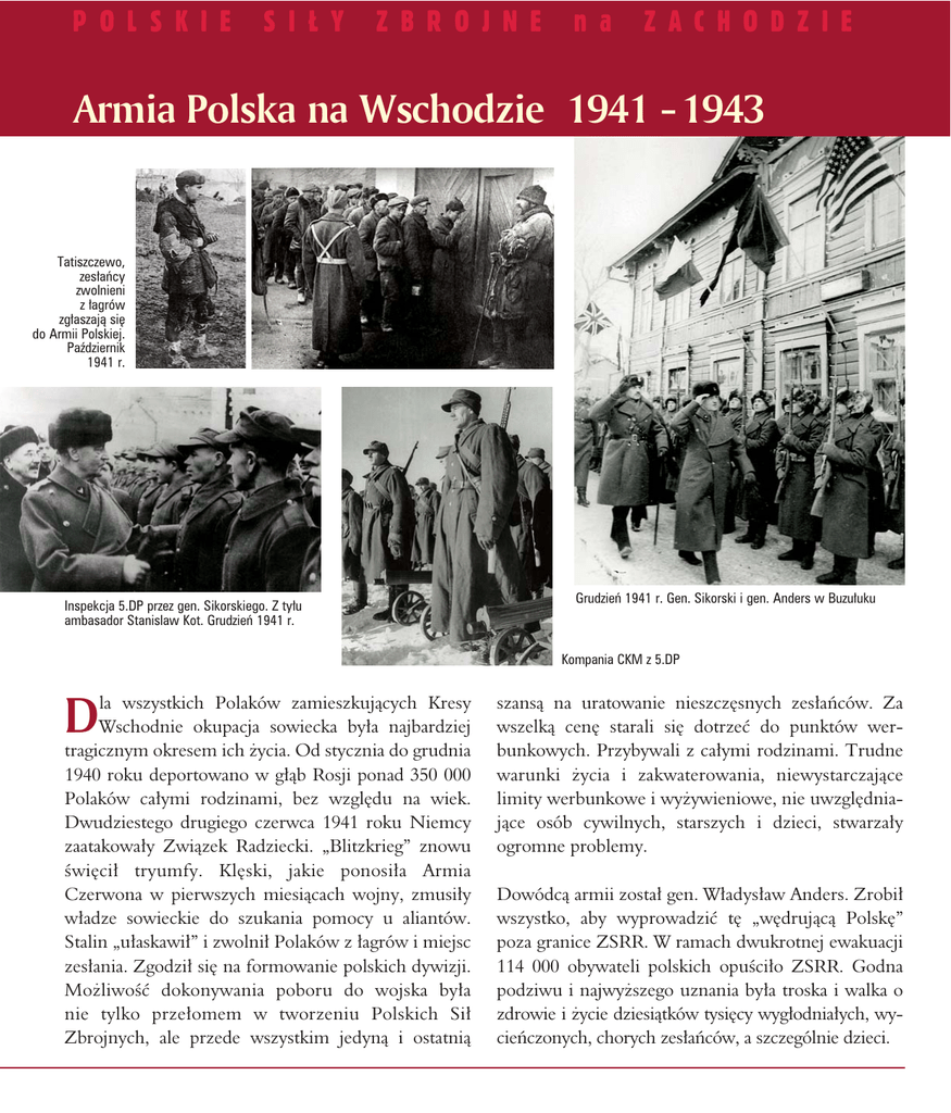 P O L S K I E S I Ł Y Z B R O J N E n a Z A C H O D Z I E Armia Polska na Wschodzie 1941 - 1943 Tatiszczewo, zesłańcy zwolnieni z łagrów zgłaszają się do Armii Polskiej. Październik 1941 r. Inspekcja 5.DP przez gen. Sikorskiego. Z tyłu ambasador Stanislaw Kot. Grudzień 1941 r. Grudzień 1941 r. Gen. Sikorski i gen. Anders w Buzułuku Kompania CKM z 5.DP la wszystkich Polaków zamieszkujących Kresy Wschodnie okupacja sowiecka była najbardziej tragicznym okresem ich życia. Od stycznia do grudnia 1940 roku deportowano w głąb Rosji ponad 350 000 Polaków całymi rodzinami, bez względu na wiek. Dwudziestego drugiego czerwca 1941 roku Niemcy zaatakowały Związek Radziecki. „Blitzkrieg” znowu święcił tryumfy. Klęski, jakie ponosiła Armia Czerwona w pierwszych miesiącach wojny, zmusiły władze sowieckie do szukania pomocy u aliantów. Stalin „ułaskawił” i zwolnił Polaków z łagrów i miejsc zesłania. Zgodził się na formowanie polskich dywizji. Możliwość dokonywania poboru do wojska była nie tylko przełomem w tworzeniu Polskich Sił Zbrojnych, ale przede wszystkim jedyną i ostatnią D szansą na uratowanie nieszczęsnych zesłańców. Za wszelką cenę starali się dotrzeć do punktów werbunkowych. Przybywali z całymi rodzinami. Trudne warunki życia i zakwaterowania, niewystarczające limity werbunkowe i wyżywieniowe, nie uwzględniające osób cywilnych, starszych i dzieci, stwarzały ogromne problemy. Dowódcą armii został gen. Władysław Anders. Zrobił wszystko, aby wyprowadzić tę „wędrującą Polskę” poza granice ZSRR. W ramach dwukrotnej ewakuacji 114 000 obywateli polskich opuściło ZSRR. Godna podziwu i najwyższego uznania była troska i walka o zdrowie i życie dziesiątków tysięcy wygłodniałych, wycieńczonych, chorych zesłańców, a szczególnie dzieci.