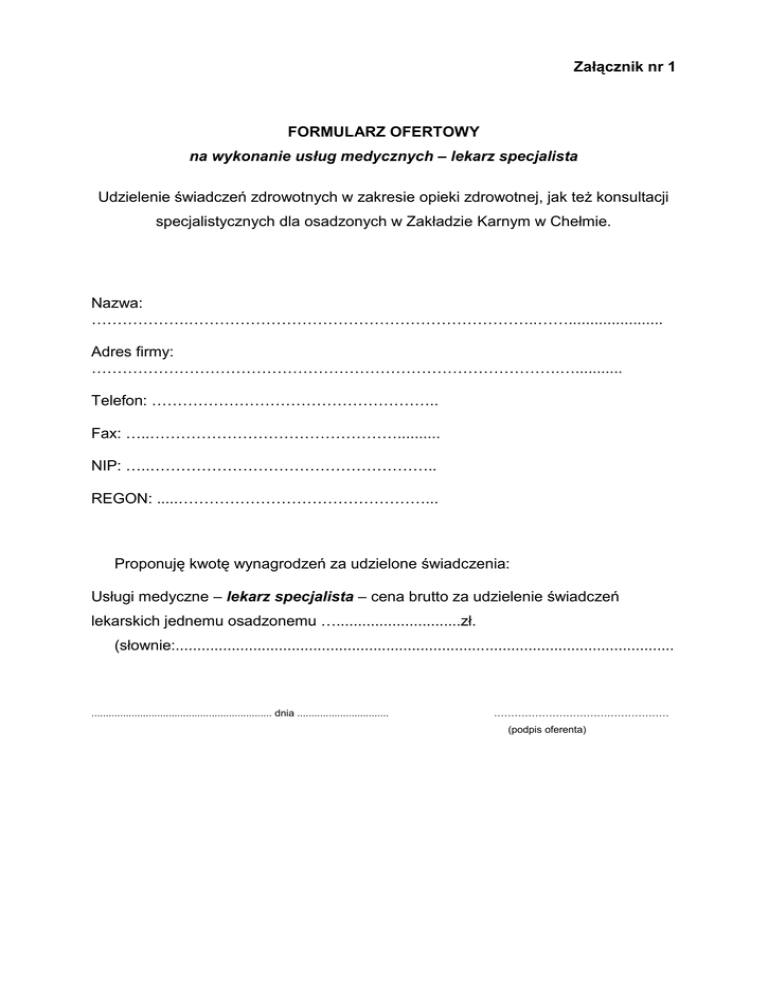Załącznik nr 1 FORMULARZ OFERTOWY na wykonanie usług medycznych – lekarz specjalista Udzielenie świadczeń zdrowotnych w zakresie opieki zdrowotnej, jak też konsultacji specjalistycznych dla osadzonych w Zakładzie Karnym w Chełmie. Nazwa: ……………….…………………………………………………………..……...................... Adres firmy: ……………………………………………………………………………….…........... Telefon: ……………………………………………….. Fax: …..………………………………………….......... NIP: …..……………………………………………….. REGON: .....…………………………………………... Proponuję kwotę wynagrodzeń za udzielone świadczenia: Usługi medyczne – lekarz specjalista – cena brutto za udzielenie świadczeń lekarskich jednemu osadzonemu ….............................zł. (słownie:.................................................................................................................... ............................................................... dnia ................................ …………………………………………… (podpis oferenta) Załącznik nr 2 FORMULARZ OFERTOWY na wykonanie usług medycznych – pielęgniarz/pielęgniarka Udzielenie świadczeń zdrowotnych w zakresie opieki zdrowotnej – pielęgniarz / pielęgniarka dla osadzonych w Zakładzie Karnym w Chełmie. Nazwa: ……………….…………………………………………………………..……...................... Adres firmy: ……………………………………………………………………………….…........... Telefon: ……………………………………………….. Fax: …..………………………………………….......... NIP: …..……………………………………………….. REGON: .....…………………………………………... Proponuję kwotę wynagrodzeń za udzielone świadczenia: Usługi medyczne – pielęgniarz/pielęgniarka – cena brutto za godzinę …............. (słownie:.................................................................................................................... ............................................................... dnia ................................ ……………………………………….. (podpis oferenta) Załącznik nr 3 OŚWIADCZENIE OFERENTÓW Dane dotyczące wykonawcy: Nazwa: …………..……………………………………………………..……...................... Adres firmy: …………………………………………………………………….…........... NIP: …..……………………………………………….. REGON: .....………………………………………….... Oświadczam, że: Ponadto: oświadczam, że zapoznałem się z treścią ogłoszenia oraz "Szczegółowymi warunkami konkursu ofert" na usługi zdrowotne i nie wnoszę do niej zastrzeżeń oraz zdobyłem konieczne informacje do przygotowania oferty, oświadczam, że uważam się związanym niniejszą ofertą na czas wskazany w ogłoszeniu i "Szczegółowych warunkach konkursu ofert", oświadczam, że nie zalegam z uiszczaniem należnych składek na ubezpieczenia społeczne w ZUS oraz należytych podatków na rzecz Urzędu Skarbowego, oświadczam, iż posiadam wymagane prawem kwalifikacje do wykonania przedmiotu zamówienia, oświadczam, iż świadczenia medyczne określone umową wykonywać będę od dnia podpisania umowy. Deklaruję podpisanie umowy na warunkach i czas wskazany w "Szczegółowych warunkach konkursu ofert" w miejscu i terminie wyznaczonym przez Dyrektora ZK w Chełmie. Deklaruję, że wszystkie oświadczenia i informacje zawarte w niniejszej ofercie są kompletne, prawdziwe i dokładne w każdym szczególe. Załączniki: 1.......................................................................................................................................................................... 2. ....................................................................................................................................................................... ............................................................... dnia ................................ ...................................................... podpis i pieczatka oferenta Załącznik nr 4 UMOWA o świadczenie usług medycznych (świadczeń zdrowotnych) dla osadzonych w Zakładzie Karnym w Chełmie. zawarta w dniu lipca 2014 roku w Chełmie Pomiędzy Zakładem Karnym w Chełmie z siedzibą w Chełmie ul. Kolejowa, 22-100 Chełm reprezentowanym przez Dyrektora - zwanego w dalszej części umowy “zamawiającym” a Panem/Panią ........................................ zamieszkałym(ą) w ................................ legitymującym(ą) się prawem wykonywania zawodu lekarza nr ............................................................zarejestrowanym(ą) w ewidencji działalności gospodarczej .....................................posiadającym numer NIP ......................... i REGON ................................................ Przyjmujący zamówienie został wyłoniony w drodze konkursu ofert na świadczenia opieki zdrowotnej w zakresie .........................................., prowadzonego na podstawie art. 26 i 27 Ustawy z dnia 15 kwietnia 2011 r. o działalności leczniczej (Dz. U. Nr 112 poz. 654) oraz art. 146 ust. 1 Ustawy z dnia 27 sierpnia 2004 r. o świadczeniach opieki zdrowotnej finansowanych ze środków publicznych (Dz. U. z 2008 r. Nr 164 poz. 1027 z późn. zm.) oraz w oparciu o Protokół Komisji Konkursowej z dnia .................................................................... § 1. 1. Na podstawie niniejszej umowy zamawiający zleca, a wykonawca zobowiązuje się do świadczenia usług medycznych (świadczeń zdrowotnych) w zakresie i na warunkach okre