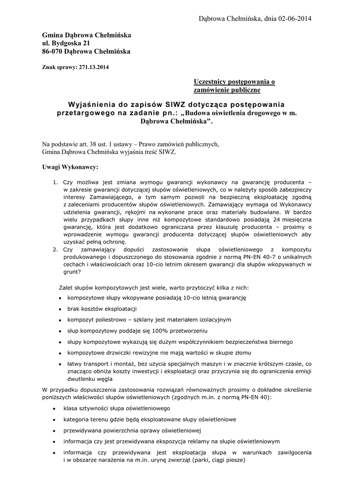 Dąbrowa Chełmińska, dnia 02-06-2014 Gmina Dąbrowa Chełmińska ul. Bydgoska 21 86-070 Dąbrowa Chełmińska Znak sprawy: 271.13.2014 Uczestnicy postępowania o zamówienie publiczne Wyjaśnienia do zapisów SIWZ dotycząca postępow ania przetargow ego na zadanie p n.: „Budowa oświetlenia drogowego w m. Dąbrowa Chełmińska”. Na podstawie art. 38 ust. 1 ustawy – Prawo zamówień publicznych, Gmina Dąbrowa Chełmińska wyjaśnia treść SIWZ. Uwagi Wykonawcy: 1. Czy możliwa jest zmiana wymogu gwarancji wykonawcy na gwarancję producenta – w zakresie gwarancji dotyczącej słupów oświetleniowych, co w należyty sposób zabezpieczy interesy Zamawiającego, a tym samym pozwoli na bezpieczną eksploatację zgodną z zaleceniami producentów słupów oświetleniowych. Zamawiający wymaga od Wykonawcy udzielenia gwarancji, rękojmi na wykonane prace oraz materiały budowlane. W bardzo wielu przypadkach słupy inne niż kompozytowe standardowo posiadają 24 miesięczna gwarancję, która jest dodatkowo ograniczana przez klauzulę producenta – prosimy o wprowadzenie wymogu gwarancji producenta dotyczącej słupów oświetleniowych aby uzyskać pełną ochronę. 2. Czy zamawiający dopuści zastosowanie słupa oświetleniowego z kompozytu produkowanego i dopuszczonego do stosowania zgodnie z normą PN-EN 40-7 o unikalnych cechach i właściwościach oraz 10-cio letnim okresem gwarancji dla słupów wkopywanych w grunt? Zalet słupów kompozytowych jest wiele, warto przytoczyć kilka z nich: kompozytowe słupy wkopywane posiadają 10-cio letnią gwarancję brak kosztów eksploatacji kompozyt poliestrowo – szklany jest materiałem izolacyjnym słup kompozytowy poddaje się 100% przetworzeniu słupy kompozytowe wykazują się dużym współczynnikiem bezpieczeństwa biernego kompozytowe drzwiczki rewizyjne nie mają wartości w skupie złomu łatwy transport i montaż, bez użycia specjalnych maszyn i w znacznie krótszym czasie, co znacząco obniża koszty inwestycji i eksploatacji oraz przyczynia się do ograniczenia emisji dwutlenku węgla W przypadku dopuszczenia zastosowania rozwiązań równoważnych prosimy o dokładne określenie poniższych właściwości słupów oświetleniowych (zgodnych m.in. z normą PN-EN 40): klasa sztywności słupa oświetleniowego kategoria terenu gdzie będą eksploatowane słupy oświetleniowe przewidywana powierzchnia oprawy oświetleniowej informacja czy jest przewidywana ekspozycja reklamy na słupie oświetleniowym informacja czy przewidywana jest eksploatacja słupa w warunkach i w obszarze narażenia na m.in. urynę zwierząt (parki, ciągi piesze) zawilgocenia oczekiwana klasa IP oczekiwana klasa IK Dane te są niezbędne do przygotowania oferty, która w pełni spełni Państwa oczekiwania. 3. W związku z brakiem informacji w tym zakresie w SIWZ, prosimy o podanie oczekiwanych wartości klasy IP oraz klasy IK dla słupów oświetleniowych. 4. Czy Zamawiający wyraża zgodę na zmianę zasady „jedynego kryterium najniższej ceny” na zastosowanie obok kryterium cenowego następujących kryteriów oceny ofert : Kryterium I : Kosztu eksploatacji słupa w skali roku Kryterium II : Oferowany okres gwarancji producenta słupa obejmująca gwarancję antykorozyjną na oferowany rodzaj słupa Kryterium III (ekologiczne): Wskaźnik emisji 1kg CO2 na 1kg gotowego surowca Kryterium IV (ekologiczne): Kryterium kosztu utylizacji słupa Kryterium V (ekologiczne): Kryterium wagi słupa (uzasadnione mniejszą emisją CO2 przy braku użycia ciężkiego sprzętu przy instalacji oraz mniejszemu zużyciu paliwa do transportu słupów) Wyjaśnienia Zamawiającego: 1. Nie. 2. Tak jako zamiennik równoważny - z zachowaniem wysokości, wysięgu i kąta montażu oprawy oświetleniowej wg projektu. klasa sztywności słupa oświetleniowego - do 10 m nie określa się klasy bezpieczeństwa biernego – zalecana klasa NE – nie pochłaniające energii kategoria terenu gdzie będą eksploatowane słupy oświetleniowe - pierwsza kategoria geotechniczna przewidywana powierzchnia oprawy oświetleniowej - wg typu oprawy przyjętej w projekcie informacja czy jest przewidywana ekspozycja reklamy na słupie oświetleniowym - nie informacja czy przewidywana jest eksploatacja słupa w warunkach zawilgocenia i w obszarze narażenia na m.in. urynę zwierząt (parki, ciągi piesze) - jak w projekcie tylko w chodniku oczekiwana klasa IP - nie dotyczy zamiennika oczekiwana klasa IK - nie dotyczy zamiennika 3. Lampa IP 66, wnęka bezpiecznikowa IP44 , klasa nie dotyczy zamiennika. 4. Nie. Informuję, iż powyższe wyjaśnienia są obowiązujące i są częścią Specyfikacji Istotnych Warunków Zamówienia. WÓJT GMINY DĄBROWA CHEŁMIŃSKA RADOSŁAW CIECHACKI www.bip.dabrowachelminska.lo.pl