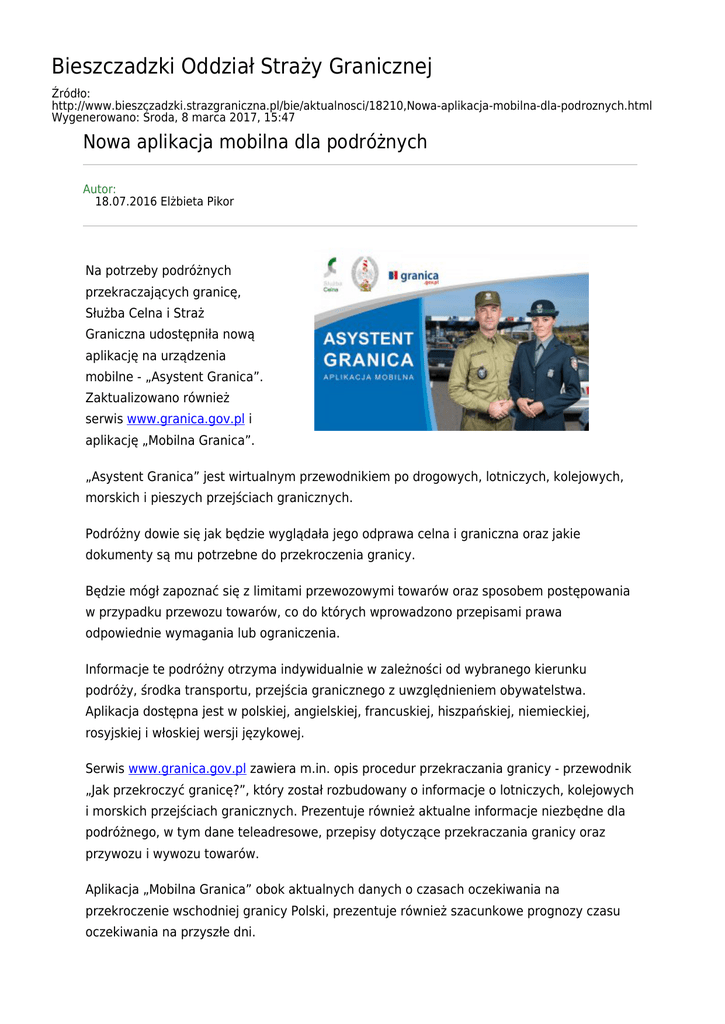 Bieszczadzki Oddział Straży Granicznej Źródło: http://www.bieszczadzki.strazgraniczna.pl/bie/aktualnosci/18210,Nowa-aplikacja-mobilna-dla-podroznych.html Wygenerowano: Środa, 8 marca 2017, 15:47 Nowa aplikacja mobilna dla podróżnych Autor: 18.07.2016 Elżbieta Pikor Na potrzeby podróżnych przekraczających granicę, Służba Celna i Straż Graniczna udostępniła nową aplikację na urządzenia mobilne - „Asystent Granica”. Zaktualizowano również serwis www.granica.gov.pl i aplikację „Mobilna Granica”. „Asystent Granica” jest wirtualnym przewodnikiem po drogowych, lotniczych, kolejowych, morskich i pieszych przejściach granicznych. Podróżny dowie się jak będzie wyglądała jego odprawa celna i graniczna oraz jakie dokumenty są mu potrzebne do przekroczenia granicy. Będzie mógł zapoznać się z limitami przewozowymi towarów oraz sposobem postępowania w przypadku przewozu towarów, co do których wprowadzono przepisami prawa odpowiednie wymagania lub ograniczenia. Informacje te podróżny otrzyma indywidualnie w zależności od wybranego kierunku podróży, środka transportu, przejścia granicznego z uwzględnieniem obywatelstwa. Aplikacja dostępna jest w polskiej, angielskiej, francuskiej, hiszpańskiej, niemieckiej, rosyjskiej i włoskiej wersji językowej. Serwis www.granica.gov.pl zawiera m.in. opis procedur przekraczania granicy - przewodnik „Jak przekroczyć granicę?”, który został rozbudowany o informacje o lotniczych, kolejowych i morskich przejściach granicznych. Prezentuje również aktualne informacje niezbędne dla podróżnego, w tym dane teleadresowe, przepisy dotyczące przekraczania granicy oraz przywozu i wywozu towarów. Aplikacja „Mobilna Granica” obok aktualnych danych o czasach oczekiwania na przekroczenie wschodniej granicy Polski, prezentuje również szacunkowe prognozy czasu oczekiwania na przyszłe dni. Zawiera informację o aktualnych warunkach pogodowych na przejściu oraz umożliwia wygenerowanie obrazu z kamer na poszczególnych przejściach granicznych. Aplikacja „Asystent Granica” i serwis www.granica.gov.pl zawiera także szereg informacji niezwykle ważnych z punktu widzenia pielgrzymów, którzy planują przyjazd do Polski na Światowe Dni Młodzieży.
