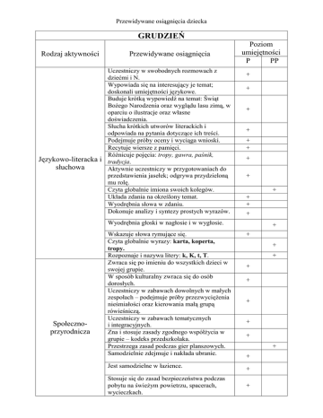 Przewidywane osiągnięcia dziecka GRUDZIEŃ Rodzaj aktywności Przewidywane osiągnięcia Uczestniczy w swobodnych rozmowach z dziećmi i N. Wypowiada się na interesujący je temat; doskonali umiejętności językowe. Buduje krótką wypowiedź na temat: Świąt Bożego Narodzenia oraz wyglądu lasu zimą, w oparciu o ilustracje oraz własne doświadczenia. Słucha krótkich utworów literackich i odpowiada na pytania dotyczące ich treści. Podejmuje próby oceny i wyciąga wnioski. Recytuje wiersze z pamięci. Różnicuje pojęcia: tropy, gawra, paśnik, Językowo-literacka i tradycja. słuchowa Aktywnie uczestniczy w przygotowaniach do przedstawienia jasełek; odgrywa przydzieloną mu rolę. Czyta globalnie imiona swoich kolegów. Układa zdania na określony temat. Wyodrębnia słowa w zdaniu. Dokonuje analizy i syntezy prostych wyrazów. Poziom umiejętności P PP + + + + + + + + + + + + Wyodrębnia głoski w nagłosie i w wygłosie. Społecznoprzyrodnicza Wskazuje słowa rymujące się. Czyta globalnie wyrazy: karta, koperta, tropy. Rozpoznaje i nazywa litery: k, K, t, T. Zwraca się po imieniu do wszystkich dzieci w swojej grupie. W sposób kulturalny zwraca się do osób dorosłych. Uczestniczy w zabawach dowolnych w małych zespołach – podejmuje próby przezwyciężenia nieśmiałości oraz kierowania małą grupą rówieśniczą. Uczestniczy w zabawach tematycznych i integracyjnych. Zna i stosuje zasady zgodnego współżycia w grupie – kodeks przedszkolaka. Przestrzega zasad podczas gier planszowych. Samodzielnie zdejmuje i nakłada ubranie. + + + + + + + + + + + Jest samodzielne w łazience. + Stosuje się do zasad bezpieczeństwa podczas pobytu na świeżym powietrzu, spacerach, wycieczkach. + Wskazuje i nazywa części swojego ciała i drugiej osoby. Obserwuje najbliższe otoczenie i wypowiada się na temat swoich obserwacji. Dostrzega i nazywa zmiany zachodzące zimą w przyrodzie. Rozpoznaje i nazywa zjawiska atmosferyczne charakterystyczne dla zimy. Wie jakie warunki są potrzebne do życia zwierząt leśnych podczas zimy. Wie, w jaki sposób człowiek może pomóc zwierzętom przetrwać zimę. Rozpoznaje i nazywa zwierzęta leśne. Matematyczna Plastycznotechniczna i grafomotoryczna Wymienia nazwy ptaków zimujących w Polsce; wie jak wyglądają. Wykonuje pod nadzorem dorosłych pierniczki bożonarodzeniowe. Wyjaśnia pojęcia: tropy, gawra, paśnik, karmnik. Różnicuje kierunki w przestrzeni i na kartce: na, nad, pod, obok, wysoko, nisko. Wskazuje serce i w odniesieniu do niego stronę prawą i lewą; lewą rękę oznacza za pomocą frotki. Nazywa podstawowe figury geometryczne. Wymienia podobieństwa i różnice pomiędzy dwoma przedmiotami. Dokonuje klasyfikacji przedmiotów ze względu na wybrane cechy. Dokonuje uogólnienia sklasyfikowanych przedmiotów. Posługuje się pojęciami dotyczącymi wielkości oraz długości: największy, najmniejszy, większy mniejszy; najkrótszy, najdłuższy. Łączy pojęcia przeciwstawne. Kontynuuje rozpoczęty rytm dwu, trzyelementowy. Przekłada dostrzeżoną regularność z jednej reprezentacji (obrazek) na drugą (ruch). Przelicza w dostępnym dla siebie zakresie. Posługuje się cyframi 1, 2 do określana liczebności zbioru oraz kolejności. Liczy i ustala: tu jest tyle samo, mniej, więcej. Dostrzega następstwo dnia i nocy. Obrazuje liczebność zbioru za pomocą zbiorów zastępczych; tworzy zbiory równoliczne. Konstruuje różnorodne budowle przestrzenne z klocków według własnego pomysłu. Prawidłowo trzyma narzędzie malarskie i pisarskie. Rysuje i maluje na dowolny temat. Komponuje postać według wzoru. + + + + + + + + + + + + + + + + + + + + + + + + + + + + + + + Układa płaskie i przestrzenne kompozycje z różnych materiałów naturalnych i przyrodniczych: szyszki, słoma, kora, orzechy. Swobodnie posługuje się kredkami. Koloruje rysunki konturowe. Rysuje w tunelu i po śladzie zgodnie ze wskazanym kierunkiem. Kreśli linie ukośne na ograniczonej powierzchni. Tworzy pracę plastyczną w małym zespole – komponuje z przygotowanych elementów. Kreśli według wzoru linie ornamenty na tabliczce sucho ścieralnej. Odwzorowuje według wzoru litery: k, t na tabliczce suchościeralnej bez liniatury. Śpiewa piosenki i kolędy w grupie i indywidualnie. Muzyczna Ruchowozdrowotna Porusza się w rytm słyszanej muzyki: maszeruje, podskakuje itd. Odtwarza rytm podany przez N. Uczestniczy w zabawach ruchowych i ćwiczeniach gimnastycznych. Stara się w sposób dokładny naśladować N. w wykonywaniu ćwiczeń. Doskonali sprawność motoryczną (szybkość, siła, skoczność), umiejętność rzutu do celu i umiejętność współpracy w grupie podczas wykonywania ćwiczeń gimnastycznych. Właściwie reaguje na umówione wcześniej sygnały wzrokowe, dźwiękowe w zabawach ruchowych. Aktywnie uczestniczy w zabawach ruchowych, grach i ćwiczeniach gimnastycznych prowadzonych w ogrodzie przedszkolnym i sali gimnastycznej. Zna zasady prawidłowego ubierania się zgodnego z porą roku i warunkami atmosferycznymi. + + + + + + + + + + + + + + + + +