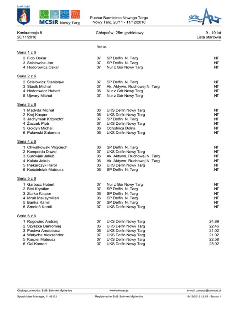 Puchar Burmistrza Nowego Targu Nowy Targ, 20/11 - 11/12/2016 Konkurencja 8 20/11/2016 Chłopców, 25m grzbietowy 9 - 10 lat Lista startowa Rok ur. Seria 1 z 6 2 Fido Oskar 3 Ścisłowicz Jan 4 Hodorowicz Oskar 07 07 07 SP Delfin N. Targ SP Delfin N. Targ Nur z Gór Nowy Targ NT NT NT 07 07 06 07 SP Delfin N. Targ Ak. Aktywn. Ruchowej N. Targ Nur z Gór Nowy Targ Nur z Gór Nowy Targ NT NT NT NT 06 06 07 07 06 06 UKS Delfin Nowy Targ UKS Delfin Nowy Targ SP Delfin N. Targ UKS Delfin Nowy Targ Ochotnica Dolna UKS Delfin Nowy Targ NT NT NT NT NT NT 06 07 06 06 06 06 SP Delfin N. Targ UKS Delfin Nowy Targ Ak. Aktywn. Ruchowej N. Targ Ak. Aktywn. Ruchowej N. Targ UKS Delfin Nowy Targ SP Delfin N. Targ NT NT NT NT NT NT 07 07 06 06 07 07 Nur z Gór Nowy Targ SP Delfin N. Targ SP Delfin N. Targ SP Delfin N. Targ SP Delfin N. Targ UKS Delfin Nowy Targ NT NT NT NT NT NT 07 06 06 07 07 07 UKS Delfin Nowy Targ UKS Delfin Nowy Targ UKS Delfin Nowy Targ UKS Delfin Nowy Targ UKS Delfin Nowy Targ UKS Delfin Nowy Targ 24.89 22.46 21.02 21.02 22.58 25.02 Seria 2 z 6 2 3 4 5 Ścisłowicz Stanisław Stasik Michał Hodorowicz Hubert Ujwary Michał Seria 3 z 6 1 2 3 4 5 6 Madyda Michał Kraj Kacper Jachymiak Krzysztof Żaczek Piotr Gołdyn Michał Puławski Salomon Seria 4 z 6 1 2 3 4 5 6 Chwałkowski Wojciech Komperda Dawid Surowiak Jakub Kalata Jakub Piekarczyk Karol Kościelniak Mateusz Seria 5 z 6 1 2 3 4 5 6 Garbacz Hubert Biel Krystian Ziarko Kacper Mruk Maksymilian Bańka Kamil Smoleń Kamil Seria 6 z 6 1 Rogowiec Andrzej 2 Szyszka Bartłomiej 3 Pastwa Amadeusz 4 Watycha Aleksander 5 Karpiel Mateusz 6 Gal Konrad Obsługa zawodów: SMS SwimArt Myślenice Splash Meet Manager, 11.46121 www.swimart.pl e-mail: [email protected] Registered to SMS SwimArt Myślenice 11/12/2016 12:15 - Strona 1