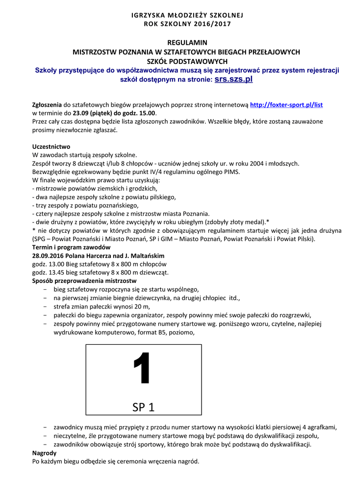 IGRZYSKA MŁODZIEŻY SZKOLNEJ ROK SZKOLNY 2016/2017 REGULAMIN MISTRZOSTW POZNANIA W SZTAFETOWYCH BIEGACH PRZEŁAJOWYCH SZKÓŁ PODSTAWOWYCH Szkoły przystępujące do współzawodnictwa muszą się zarejestrować przez system rejestracji szkół dostępnym na stronie: srs.szs.pl Zgłoszenia do sztafetowych biegów przełajowych poprzez stronę internetową http://foxter-sport.pl/list w terminie do 23.09 (piątek) do godz. 15.00. Przez cały czas dostępna będzie lista zgłoszonych zawodników. Wszelkie błędy, które zostaną zauważone prosimy niezwłocznie zgłaszać. Uczestnictwo W zawodach startują zespoły szkolne. Zespół tworzy 8 dziewcząt i/lub 8 chłopców - uczniów jednej szkoły ur. w roku 2004 i młodszych. Bezwzględnie egzekwowany będzie punkt IV/4 regulaminu ogólnego PIMS. W finale wojewódzkim prawo startu uzyskują: - mistrzowie powiatów ziemskich i grodzkich, - dwa najlepsze zespoły szkolne z powiatu pilskiego, - trzy zespoły z powiatu poznańskiego, - cztery najlepsze zespoły szkolne z mistrzostw miasta Poznania. - dwie drużyny z powiatów, które zwyciężyły w roku ubiegłym (zdobyły złoty medal).* * nie dotyczy powiatów w których zgodnie z obowiązującym regulaminem startuje więcej jak jedna drużyna (SPG – Powiat Poznański i Miasto Poznań, SP i GIM – Miasto Poznań, Powiat Poznański i Powiat Pilski). Termin i program zawodów 28.09.2016 Polana Harcerza nad J. Maltańskim godz. 13.00 Bieg sztafetowy 8 x 800 m chłopców godz. 13.45 bieg sztafetowy 8 x 800 m dziewcząt. Sposób przeprowadzenia mistrzostw - bieg sztafetowy rozpoczyna się ze startu wspólnego, - na pierwszej zmianie biegnie dziewczynka, na drugiej chłopiec itd., - strefa zmian pałeczki wynosi 20 m, - pałeczki do biegu zapewnia organizator, zespoły powinny mieć swoje pałeczki do rozgrzewki, - zespoły powinny mieć przygotowane numery startowe wg. poniższego wzoru, czytelne, najlepiej wydrukowane komputerowo, format B5, poziomo, SP 1 - zawodnicy muszą mieć przypięty z przodu numer startowy na wysokości klatki piersiowej 4 agrafkami, - nieczytelne, źle przygotowane numery startowe mogą być podstawą do dyskwalifikacji zespołu, - zawodników obowiązuje strój sportowy, którego brak może być podstawą do dyskwalifikacji. Nagrody Po każdym biegu odbędzie się ceremonia wręczenia nagród.