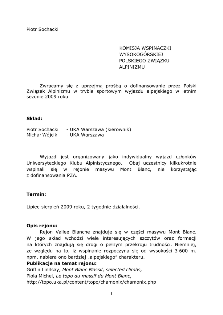 Piotr Sochacki KOMISJA WSPINACZKI WYSOKOGÓRSKIEJ POLSKIEGO ZWIĄZKU ALPINIZMU Zwracamy się z uprzejmą prośbą o dofinansowanie przez Polski Związek Alpinizmu w trybie sportowym wyjazdu alpejskiego w letnim sezonie 2009 roku. Skład: Piotr Sochacki Michał Wójcik - UKA Warszawa (kierownik) - UKA Warszawa Wyjazd jest organizowany jako indywidualny wyjazd członków Uniwersyteckiego Klubu Alpinistycznego. Obaj uczestnicy kilkukrotnie wspinali się w rejonie masywu Mont Blanc, nie korzystając z dofinansowania PZA. Termin: Lipiec-sierpień 2009 roku, 2 tygodnie działalności. Opis rejonu: Rejon Vallee Blanche znajduje się w części masywu Mont Blanc. W jego skład wchodzi wiele interesujących szczytów oraz formacji na których znajdują się drogi o pełnym przekroju trudności. Niemniej, ze względu na to, iŜ wspinanie rozpoczyna się od wysokości 3 600 m. npm. nabiera ono bardziej „alpejskiego” charakteru. Publikacje na temat rejonu: Griffin Lindsay, Mont Blanc Massif, selected climbs, Piola Michel, Le topo du massif du Mont Blanc, http://topo.uka.pl/content/topo/chamonix/chamonix.php 1 Plany: Głównym celem wyjazdu jest wspinanie na „klasykach” rejonu Valle Blanche, a w szczególności na drogach znajdujących się na wschodniej ścianie Grand Capucina. Planowane jest przejście dróg O Sole Mio (6b+) oraz Voie Suisse (6b+), a takŜe próba przejścia drogi Bonatti-Ghigo (6c+/7a). W przypadku niekorzystnych warunków atmosferycznych, zespół będzie wspinał się w niŜej połoŜonych rejonach masywu Mont Blanc. Koszty: Przewidywany koszt wyjazdu dla 2 osób: 4 000 zł - przejazd: 1500 zł - wyŜywanie i noclegi: 2 500 zł Zasady finansowania: - udział własny: 1 400 zł /osoba - dofinansowanie PZA: 600 zł /osoba Dotychczasowe dofinansowania PZA: Obaj uczestnicy wyjazdu nie korzystali dotychczas z dofinansowania Polskiego Związku Alpinizmu. Dziękujemy za rozpatrzenie naszej prośby. Z taternickim pozdrowieniem, Piotr Sochacki 2