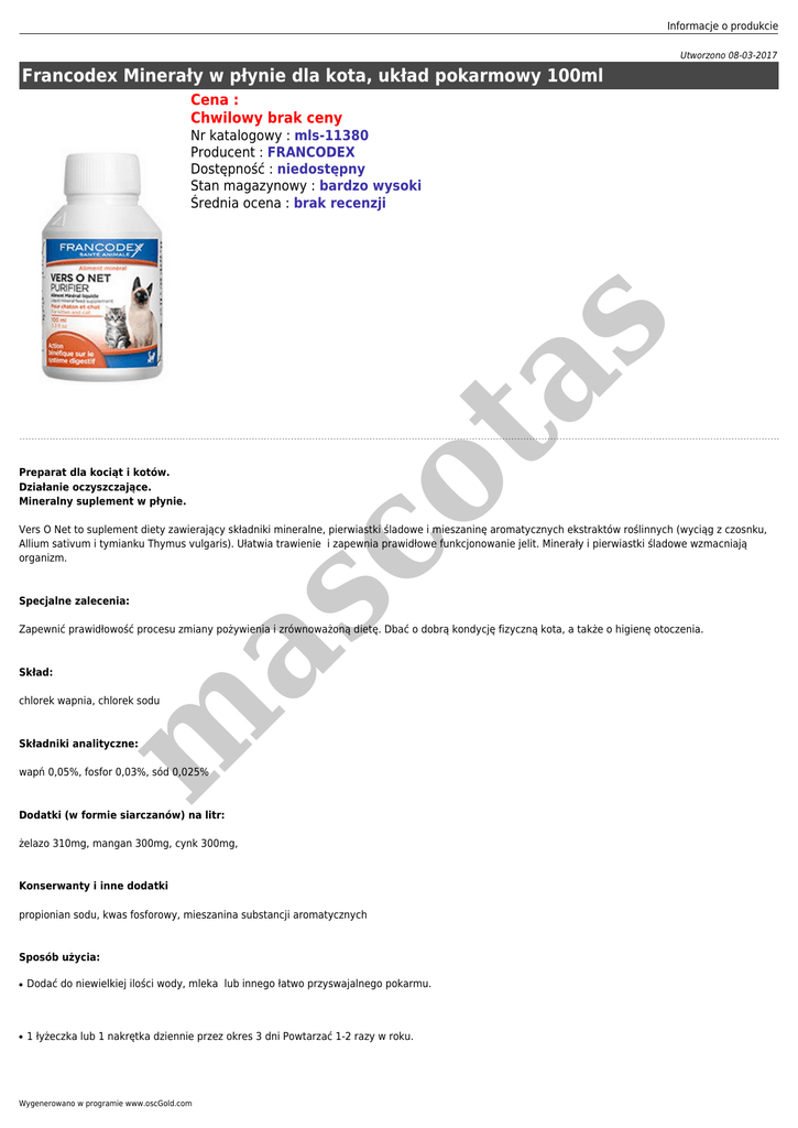 Informacje o produkcie Utworzono 08-03-2017 Francodex Minerały w płynie dla kota, układ pokarmowy 100ml Cena : Chwilowy brak ceny Preparat dla kociąt i kotów. Działanie oczyszczające. Mineralny suplement w płynie. co ta s Nr katalogowy : mls-11380 Producent : FRANCODEX Dostępność : niedostępny Stan magazynowy : bardzo wysoki Średnia ocena : brak recenzji Vers O Net to suplement diety zawierający składniki mineralne, pierwiastki śladowe i mieszaninę aromatycznych ekstraktów roślinnych (wyciąg z czosnku, Allium sativum i tymianku Thymus vulgaris). Ułatwia trawienie i zapewnia prawidłowe funkcjonowanie jelit. Minerały i pierwiastki śladowe wzmacniają organizm. m as Specjalne zalecenia: Zapewnić prawidłowość procesu zmiany pożywienia i zrównoważoną dietę. Dbać o dobrą kondycję fizyczną kota, a także o higienę otoczenia. Skład: chlorek wapnia, chlorek sodu Składniki analityczne: wapń 0,05%, fosfor 0,03%, sód 0,025% Dodatki (w formie siarczanów) na litr: żelazo 310mg, mangan 300mg, cynk 300mg, Konserwanty i inne dodatki propionian sodu, kwas fosforowy, mieszanina substancji aromatycznych Sposób użycia: ● Dodać do niewielkiej ilości wody, mleka lub innego łatwo przyswajalnego pokarmu. ● 1 łyżeczka lub 1 nakrętka dziennie przez okres 3 dni Powtarzać 1-2 razy w roku. Wygenerowano w programie www.oscGold.com Przechowywanie: m as co ta s Przechowywać z dala od dzieci, w temperaturze pokojowej, z dala od światła. Zamknąć butelkę po użyciu.